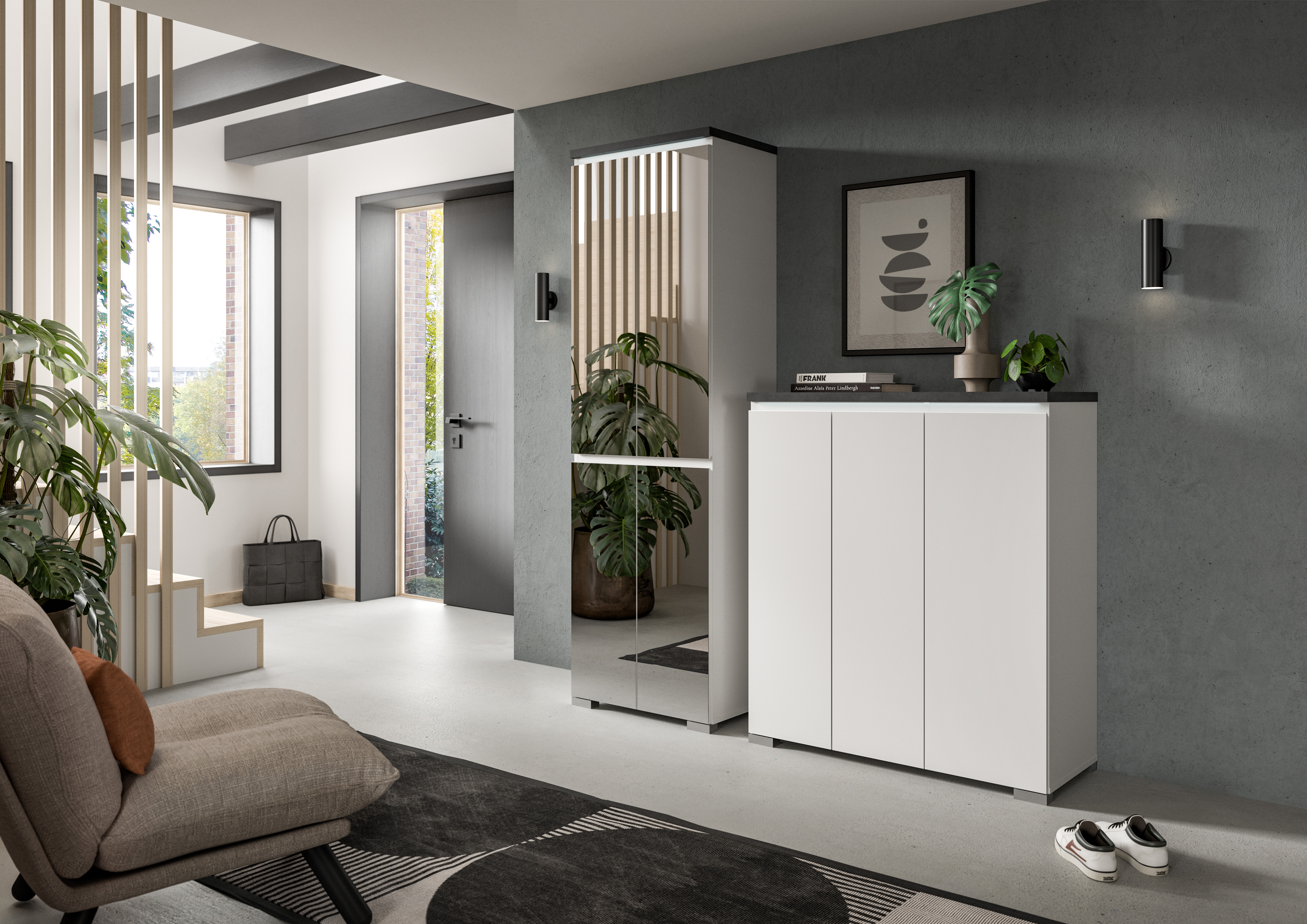 Die elegante Schuhschrankkombination mit dem Spiegelschrank und der Kommode in Weiß und Grau Nachbildung ist die perfekte Lösung, um Ordnung und Stil in Ihrem Eingangsbereich zu vereinen.