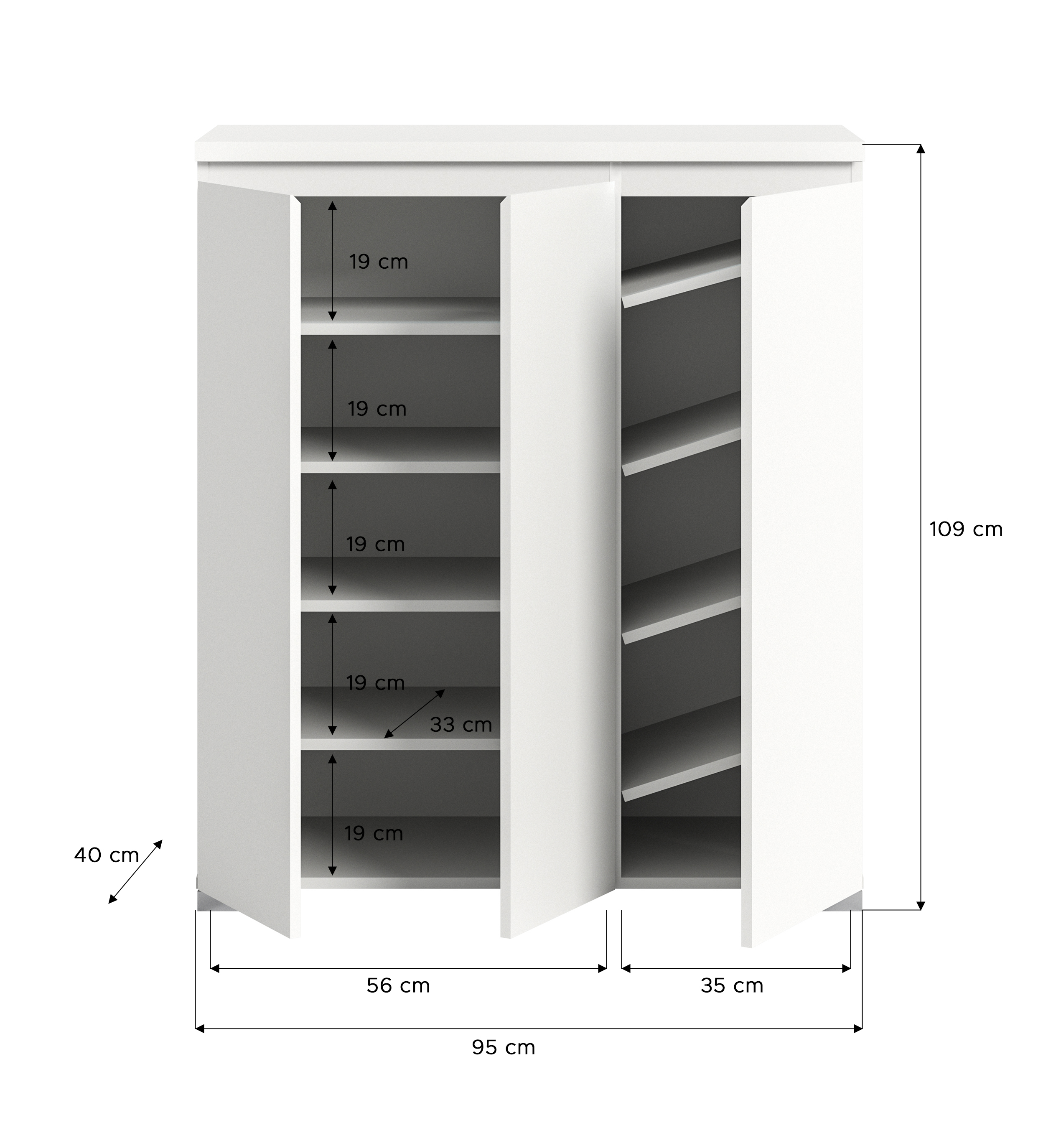 - Funktionalität: Mit mehreren Fächern und Ablageflächen bietet die Schuhschrankkombination ausreichend Platz zur ordentlichen Aufbewahrung von Schuhen und anderen Accessoires.
