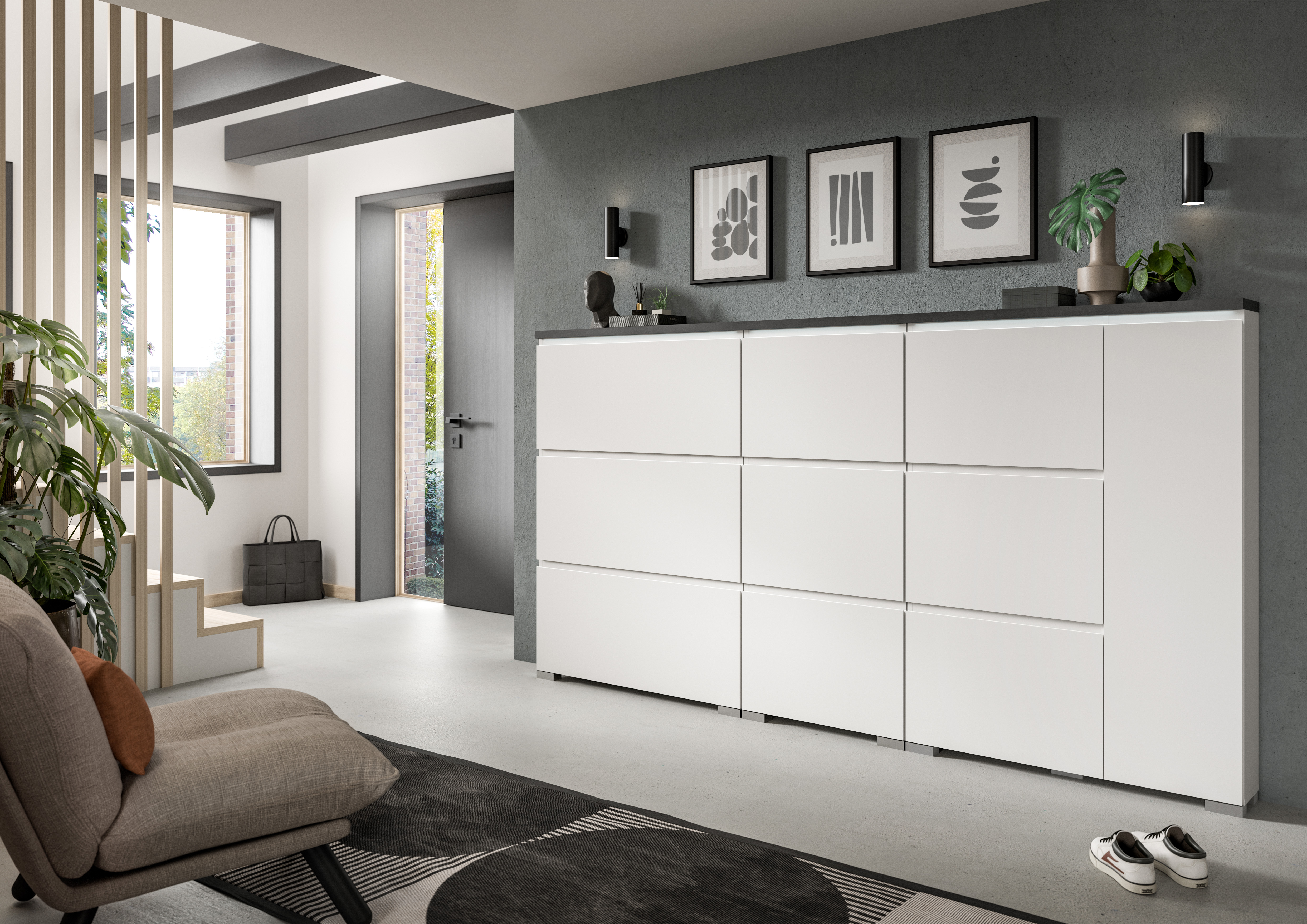 Die elegante Schuhschrankkombination mit den verschiedenen Schuhkippermodellen in Weiß und Grau Nachbildung ist die perfekte Lösung, um Ordnung und Stil in Ihrem Eingangsbereich zu vereinen.