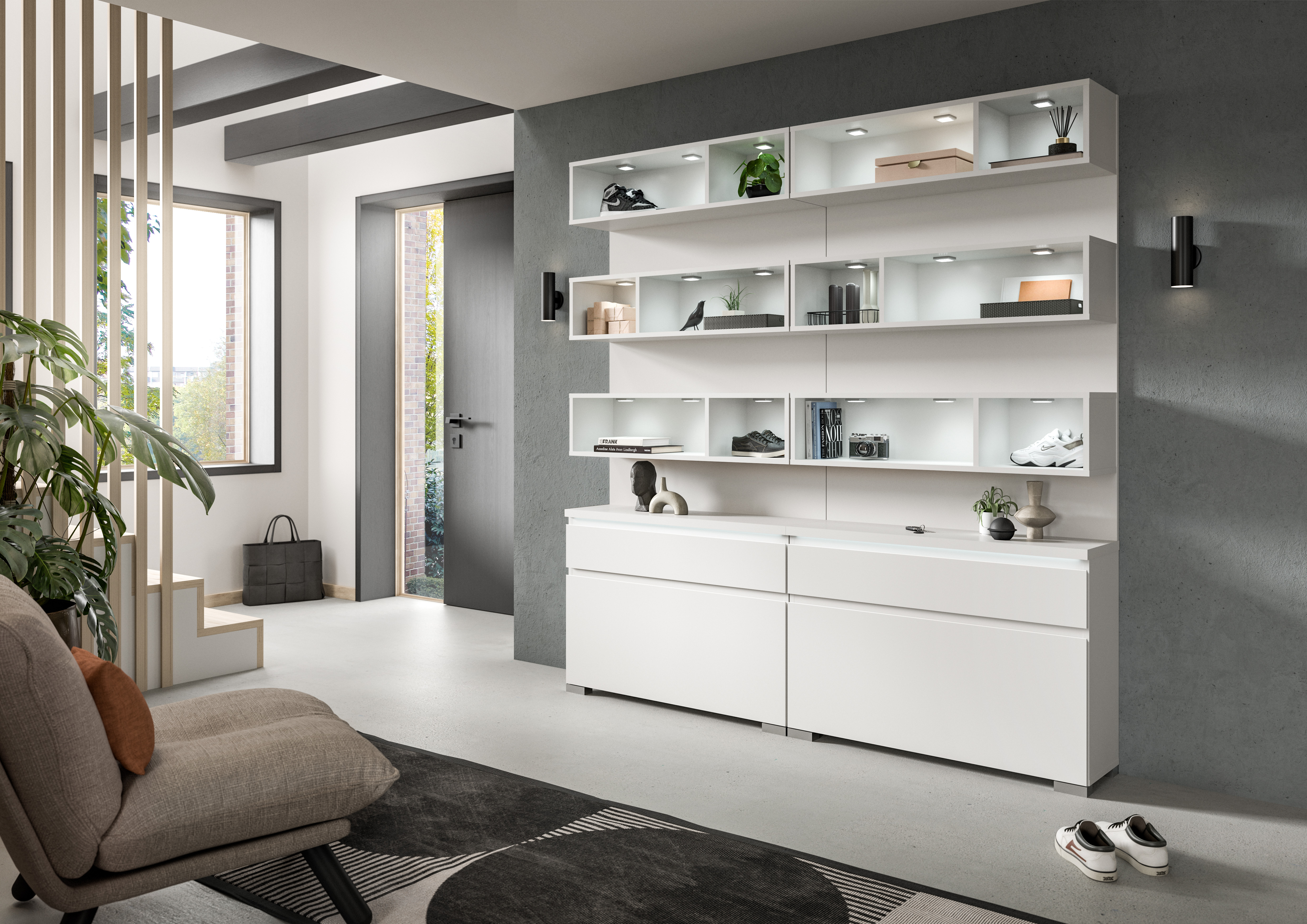 Die elegante Schuhschrankkombination in Weiß Nachbildung ist die perfekte Lösung, um Ordnung und Stil in Ihrem Eingangsbereich zu vereinen.