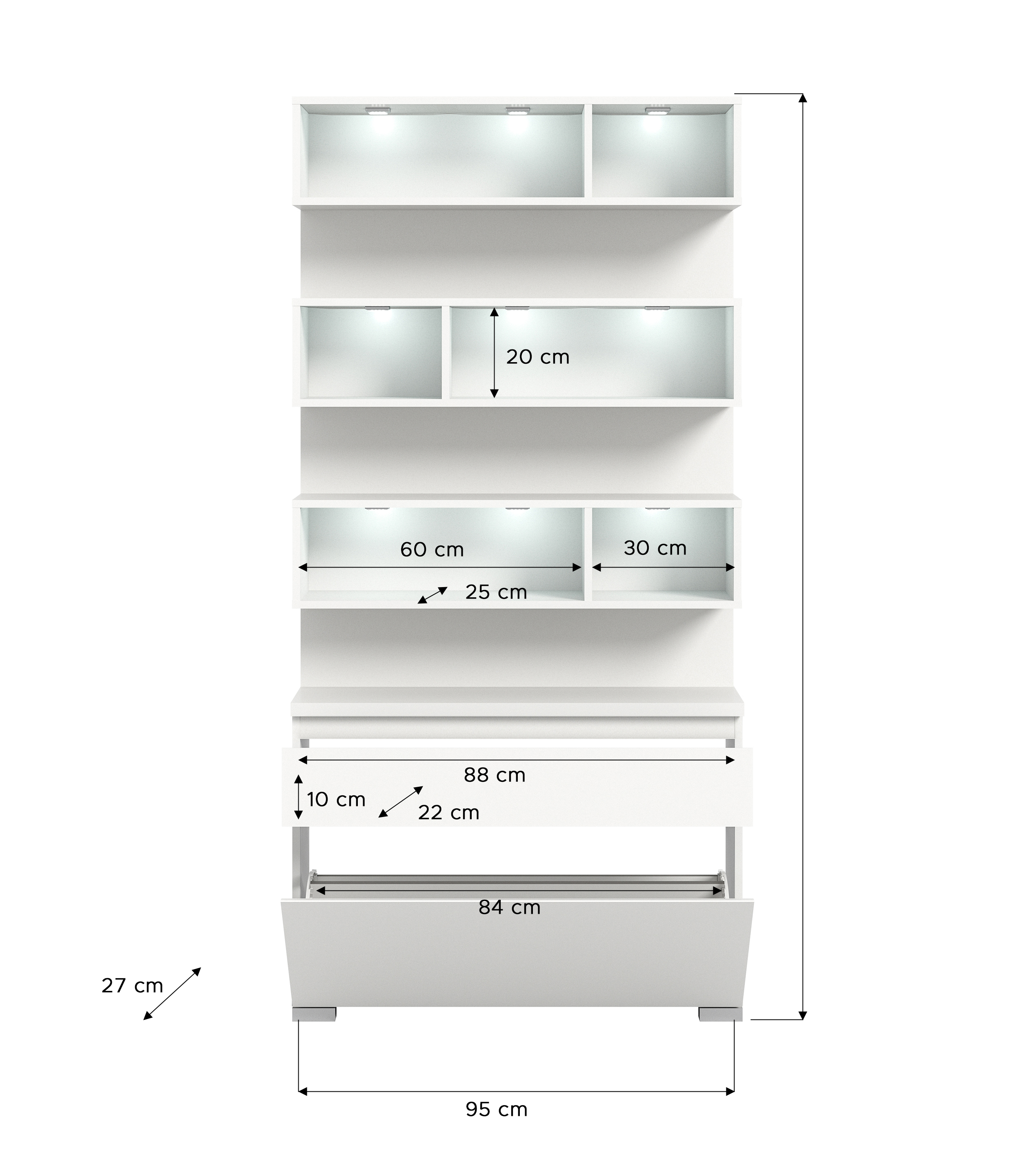 - Funktionalität: Mit mehreren Fächern und Ablageflächen bietet die Schuhschrankkombination ausreichend Platz zur ordentlichen Aufbewahrung von Schuhen und anderen Accessoires.