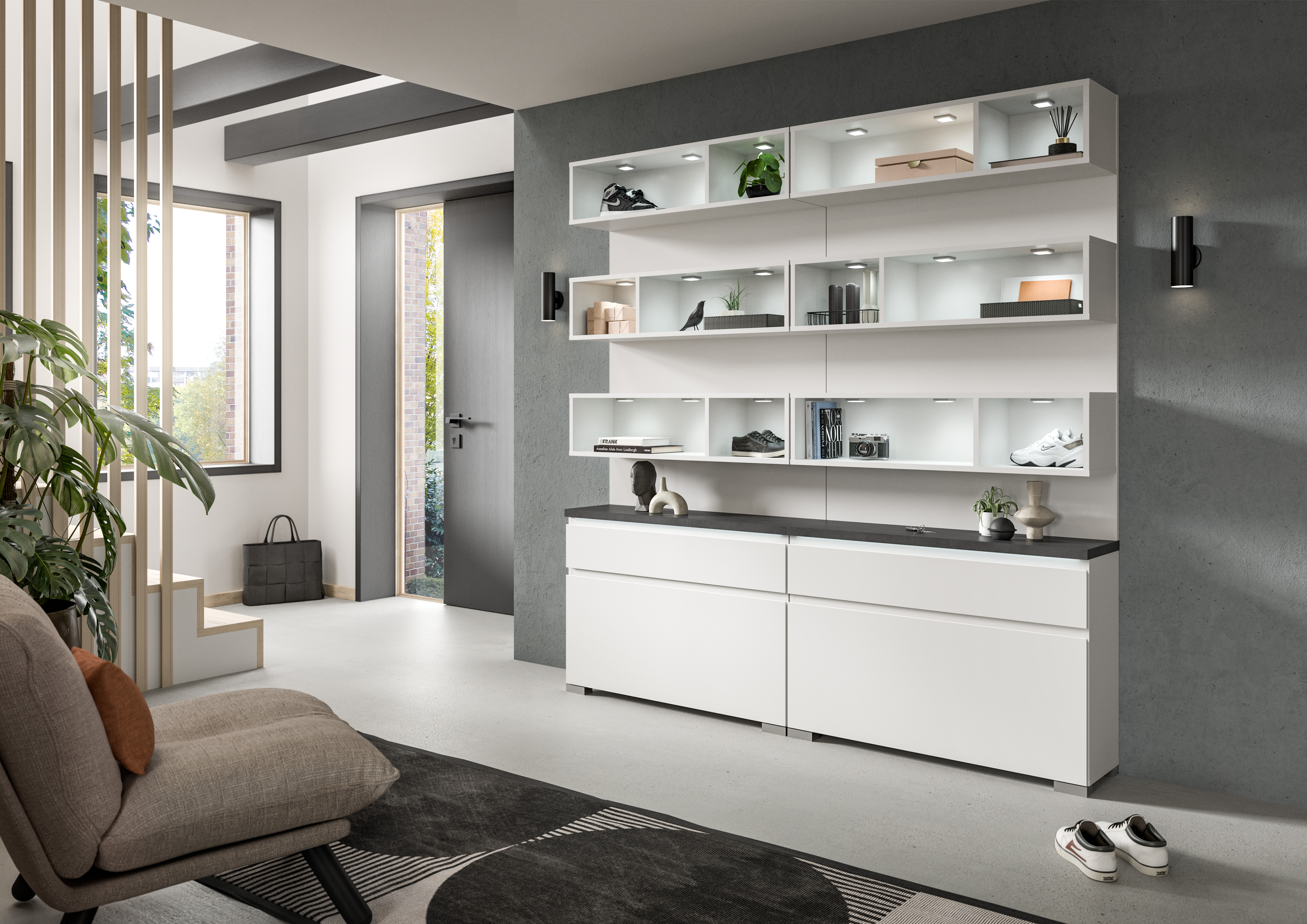 Die klaren Linien und das minimalistische Design machen sie zu einem stilvollen Möbelstück, das gleichzeitig als praktischer Ordnungshelfer dient.