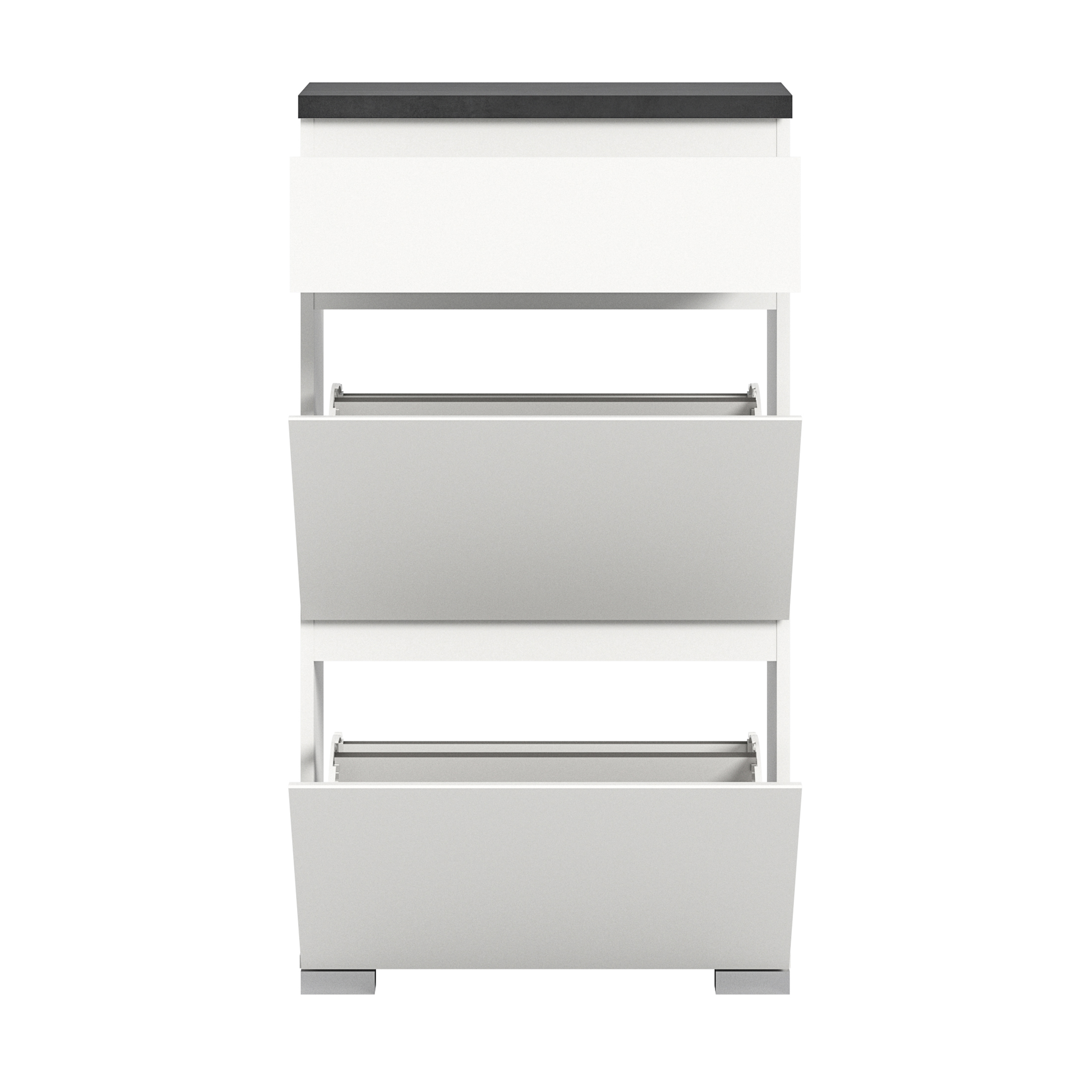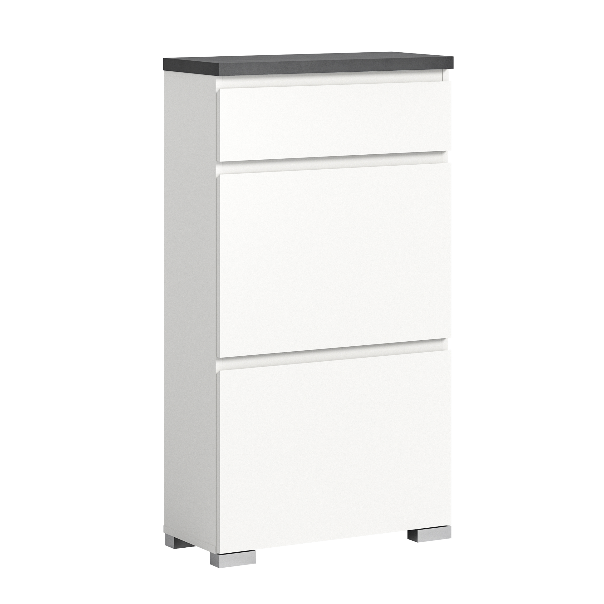 Die elegante Schuhschrankkombination mit den verschiedenen Schuhkippermodellen in Weiß und Grau Nachbildung ist die perfekte Lösung, um Ordnung und Stil in Ihrem Eingangsbereich zu vereinen.