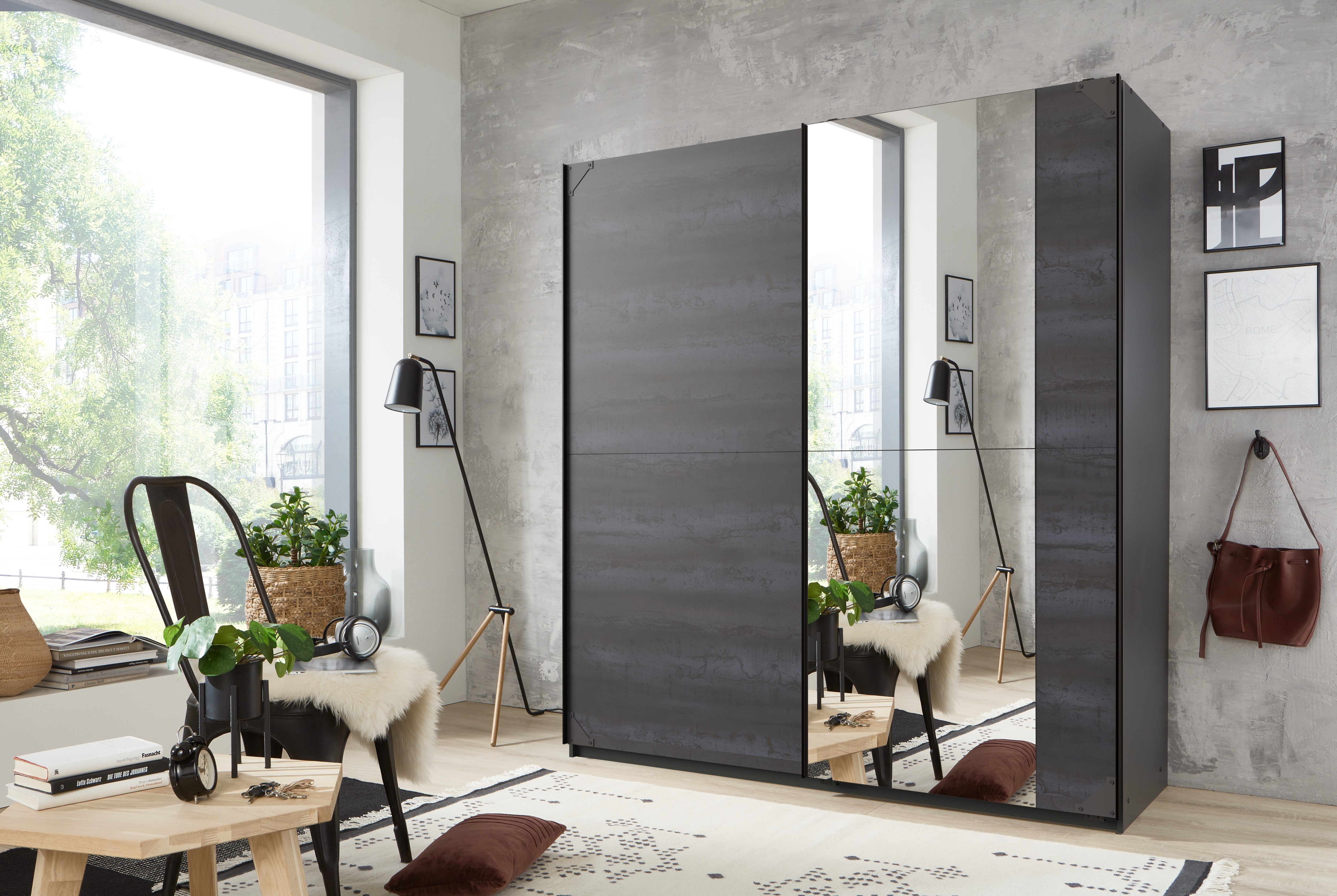 Dieser Schwebetürenschrank kombiniert funktionalen Stauraum mit einer markanten Optik im Industrial-Stil. Der Korpus in Graphit wird durch Fronten in Digi-Steel-Optik mit passenden Absetzungen ergänzt und sorgt für ein modernes Erscheinungsbild im Schlafzimmer. Hinter den zwei Schwebetüren – davon eine mit Spiegel – bietet der Schrank ausreichend Platz für Kleidung und Accessoires. Zwei Fachböden und zwei Kleiderstangen ermöglichen eine übersichtliche Organisation. Mit einem Gewicht von ca. 136 kg steht der Schrank stabil und solide. Eine praktische und preiswerte Lösung für alle, die Wert auf Stauraum und eine klare Optik legen.