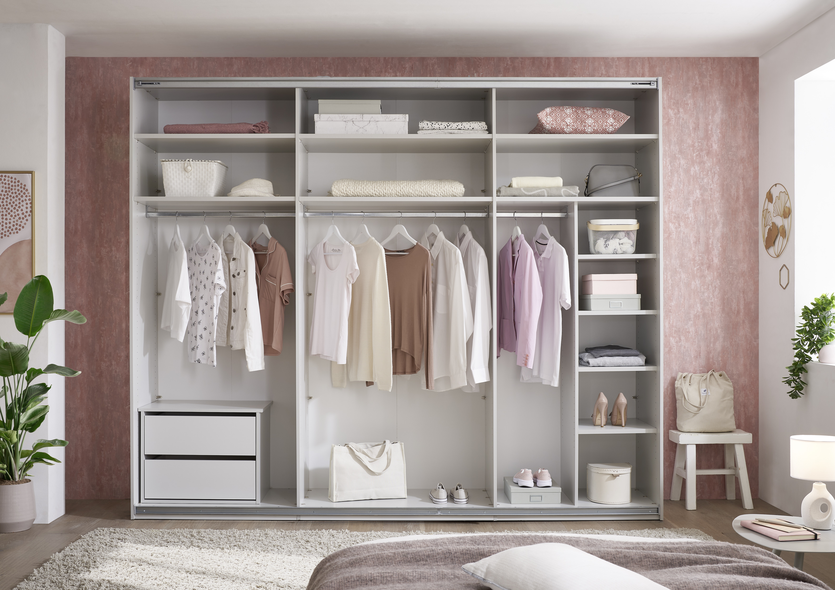 Inneneinteilung: 2 Mittelseiten; je Fach 2 Böden und 1 Kleiderstange