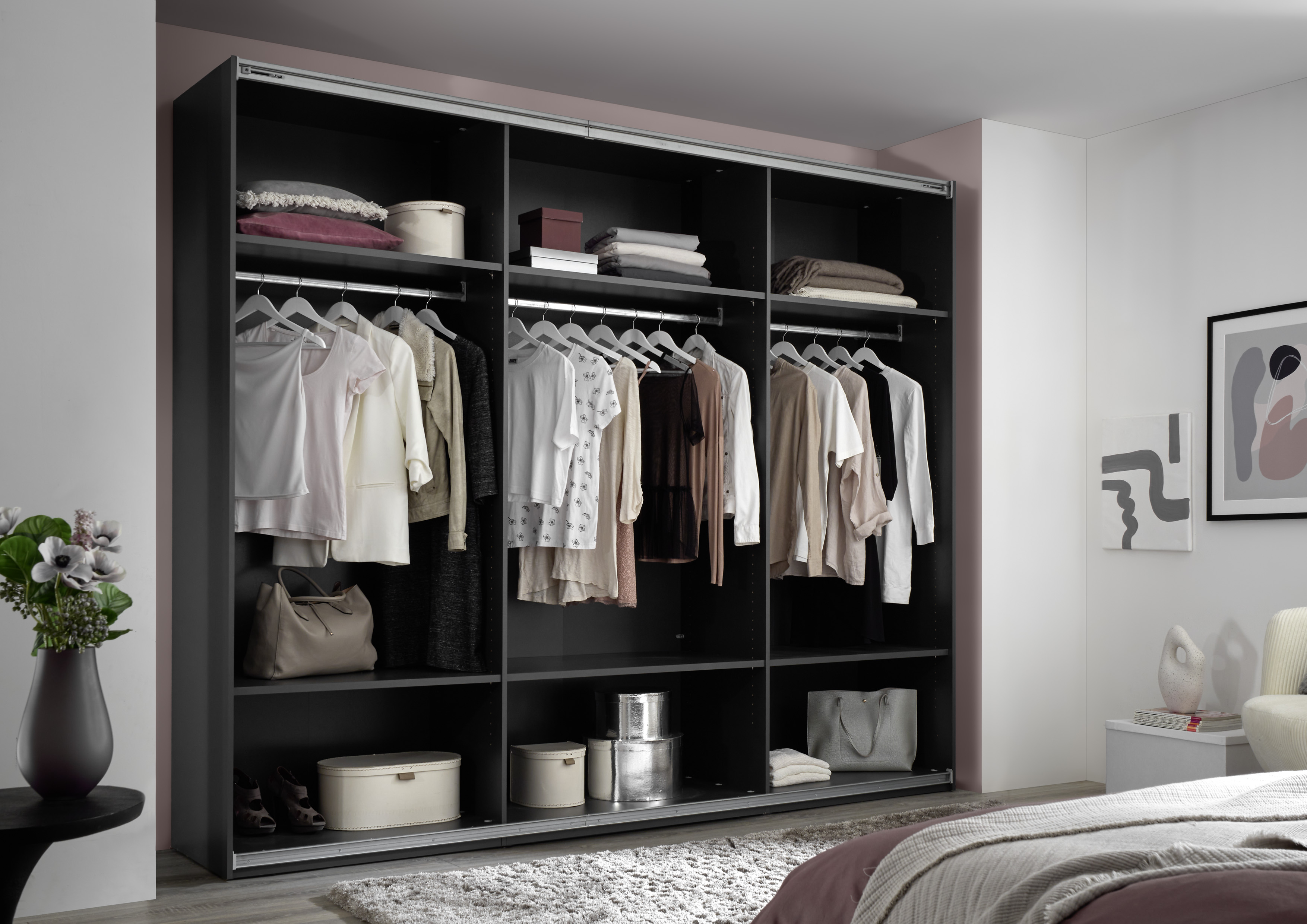 Inneneinteilung: 2 Mittelseiten; je Fach 2 Böden und 1 Kleiderstange