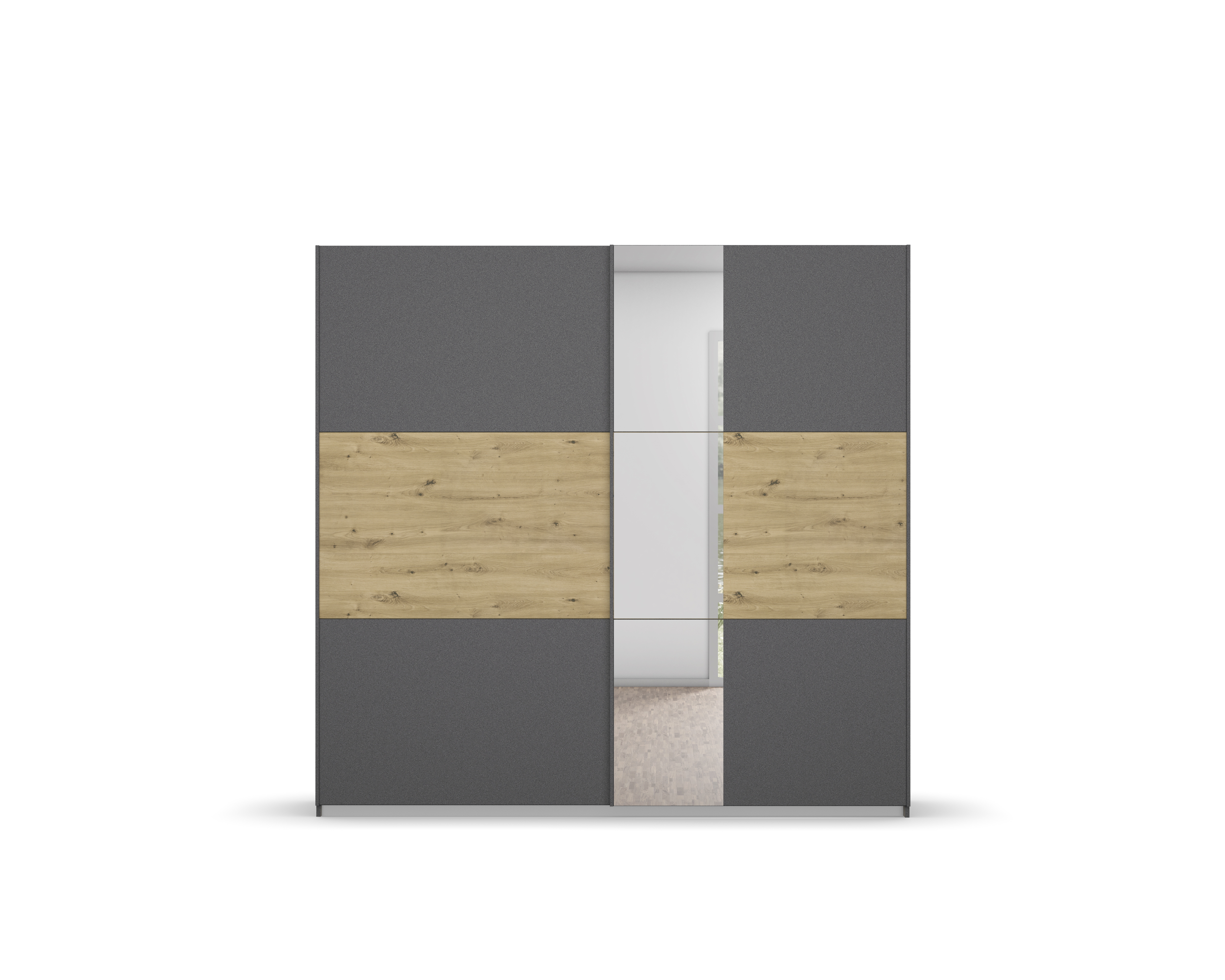 Front und Korpus: Grau-Metallic kombiniert mit Absetzungen in Artisan Eiche Holznachbildung