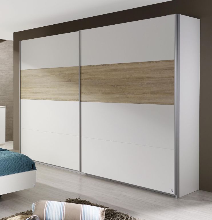- Moderner Schwebetürenschrank QUADRA in der Ausführung Alpinweiß/Sonoma Eiche