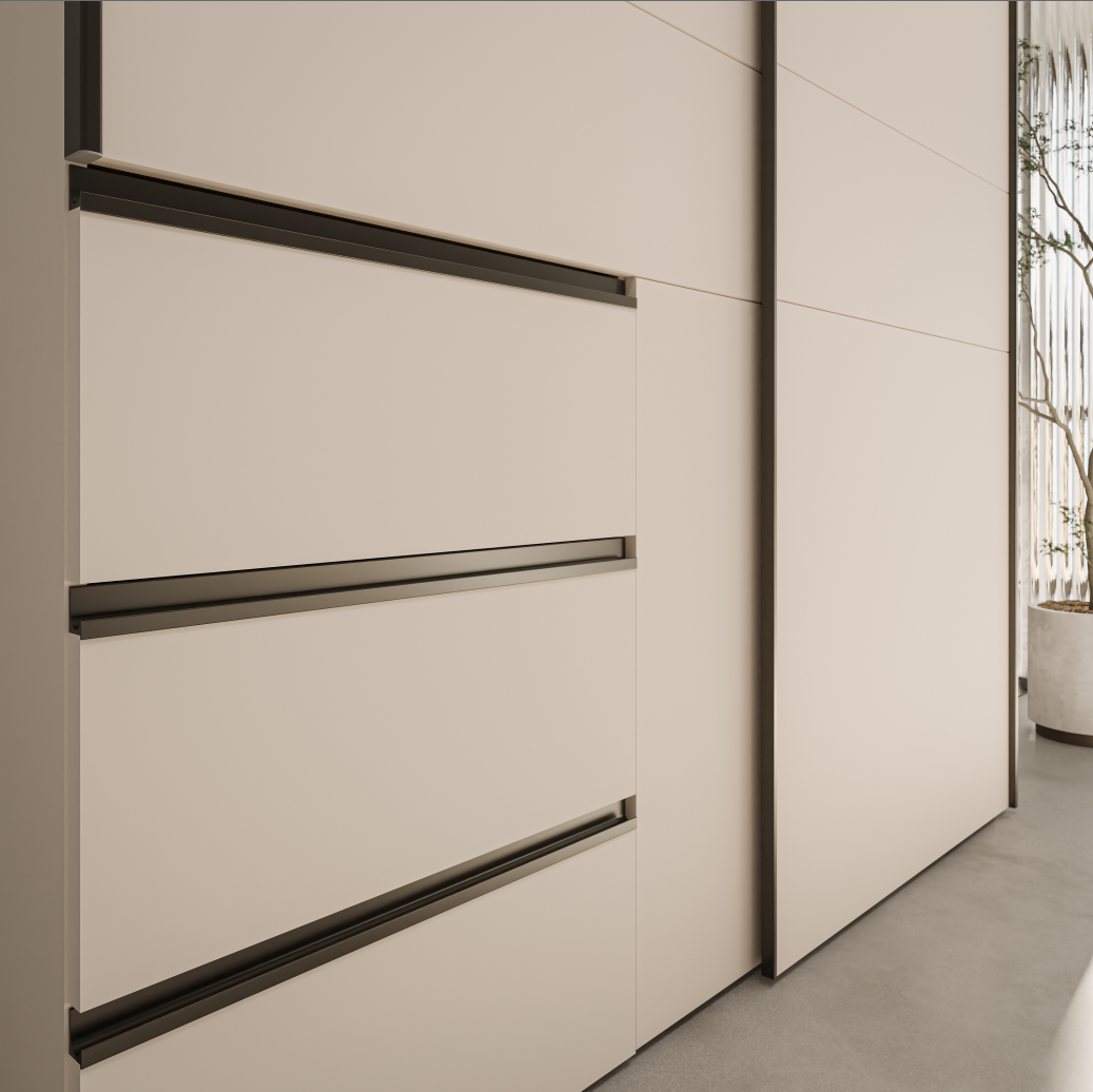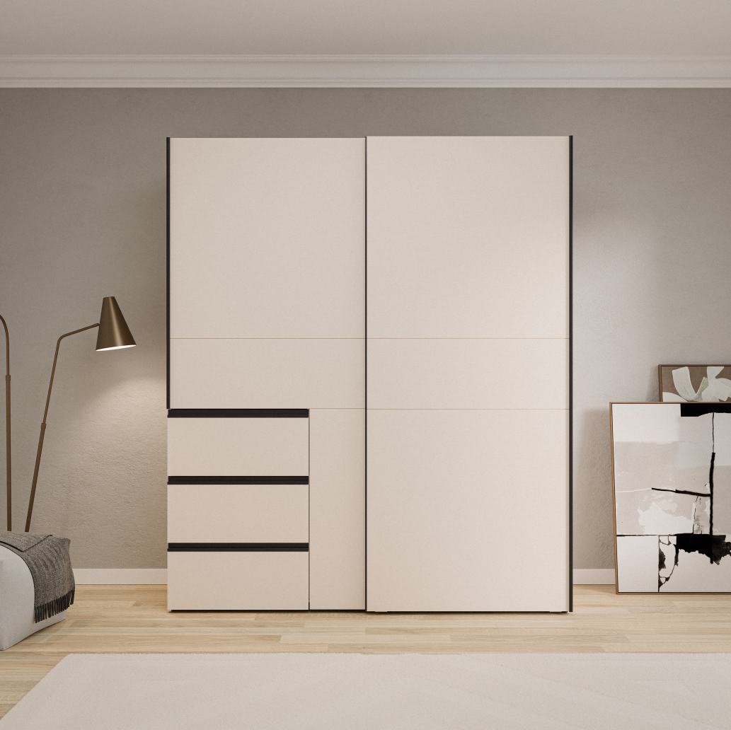 - Zeitlose und moderne Optik: Sandfarbene Flächen mit schwarzen Griffen passen zu vielen Wohnstilen.