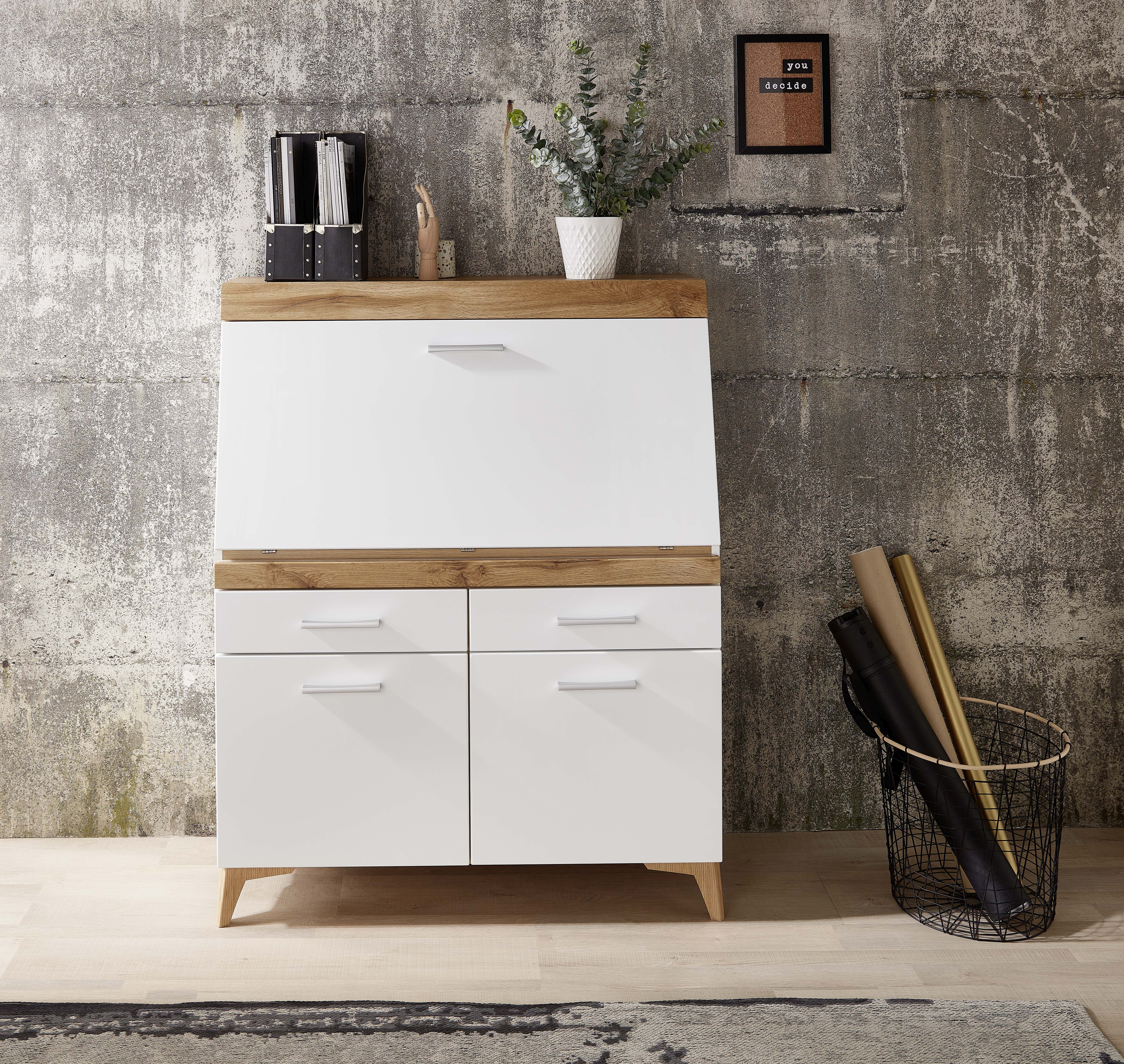 Front: Weiß matt MDF mit Absetzungen in Eiche Altholz Holznachbildung