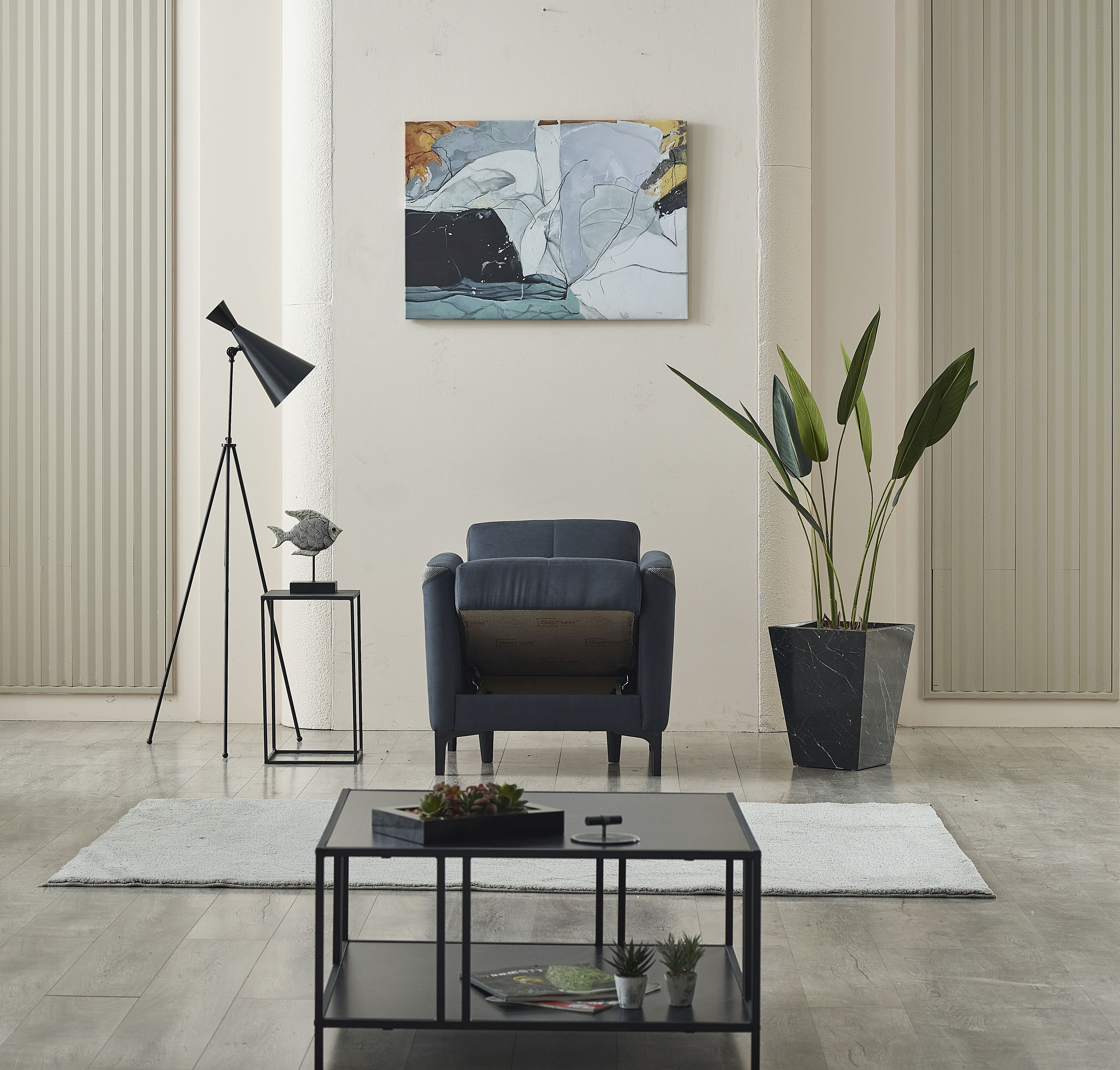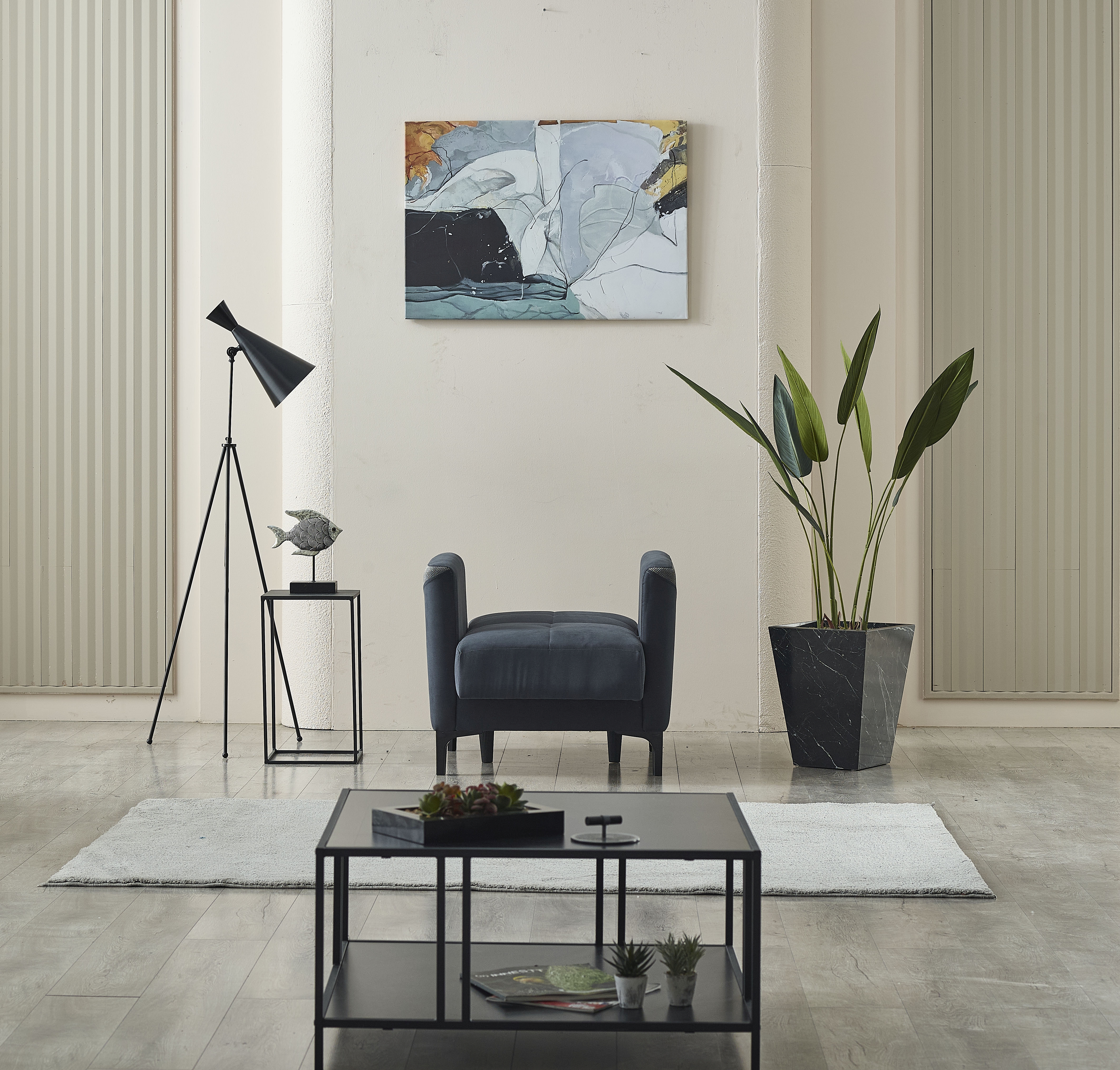 Bezug: Korpus in Nubuk in der Farbe anthrazit aus 100% Polyester; Absetzungen im Stoff London 2 in der Farbe grau aus 100% Polyester