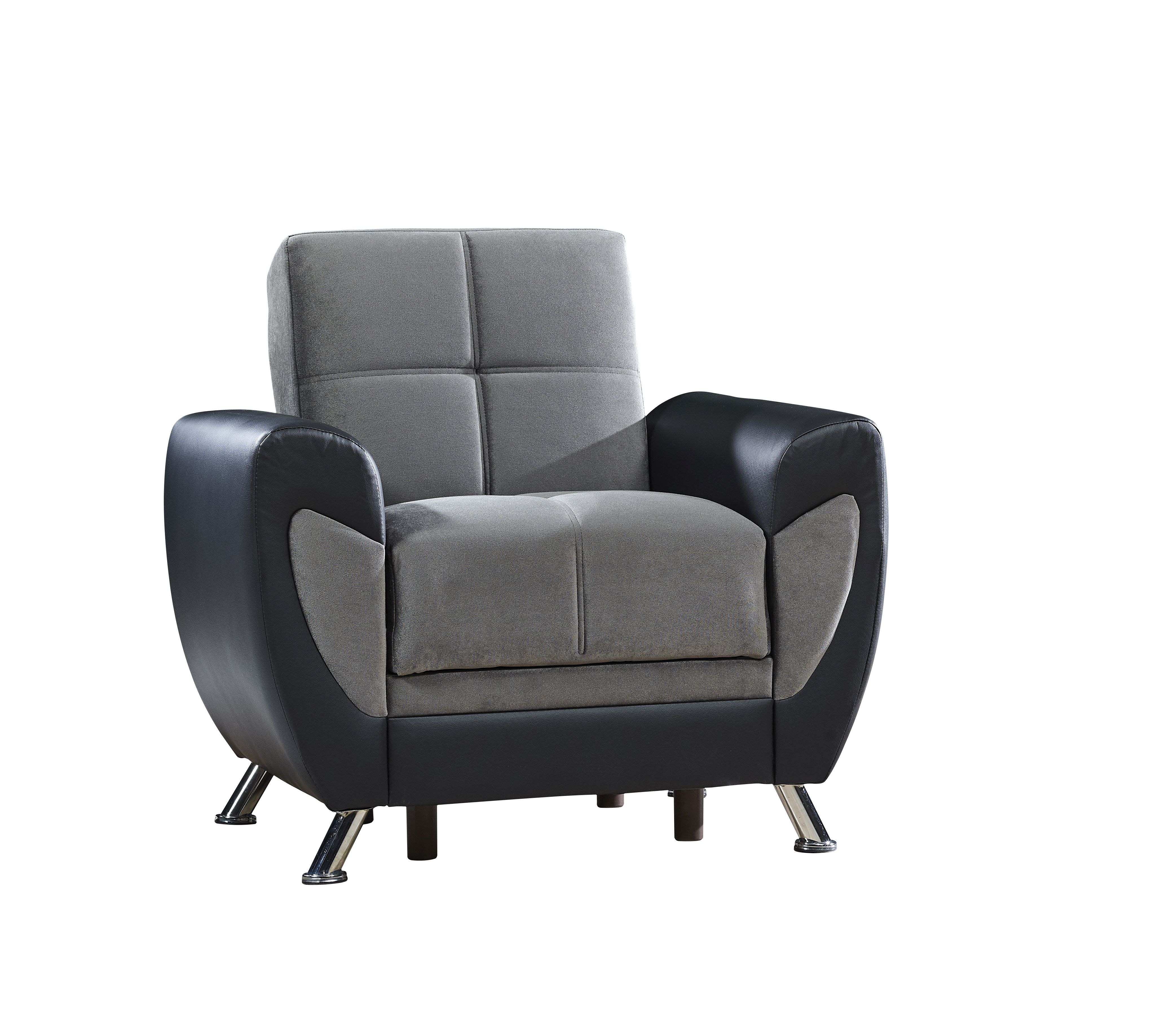 Bezug: Sitz und Rücken im Stoff Melon 715 in der Farbe grau aus 70% Polyester und 30% Baumwolle; Korpus in einem schwarzen Kunstleder aus 100% Polyurethan