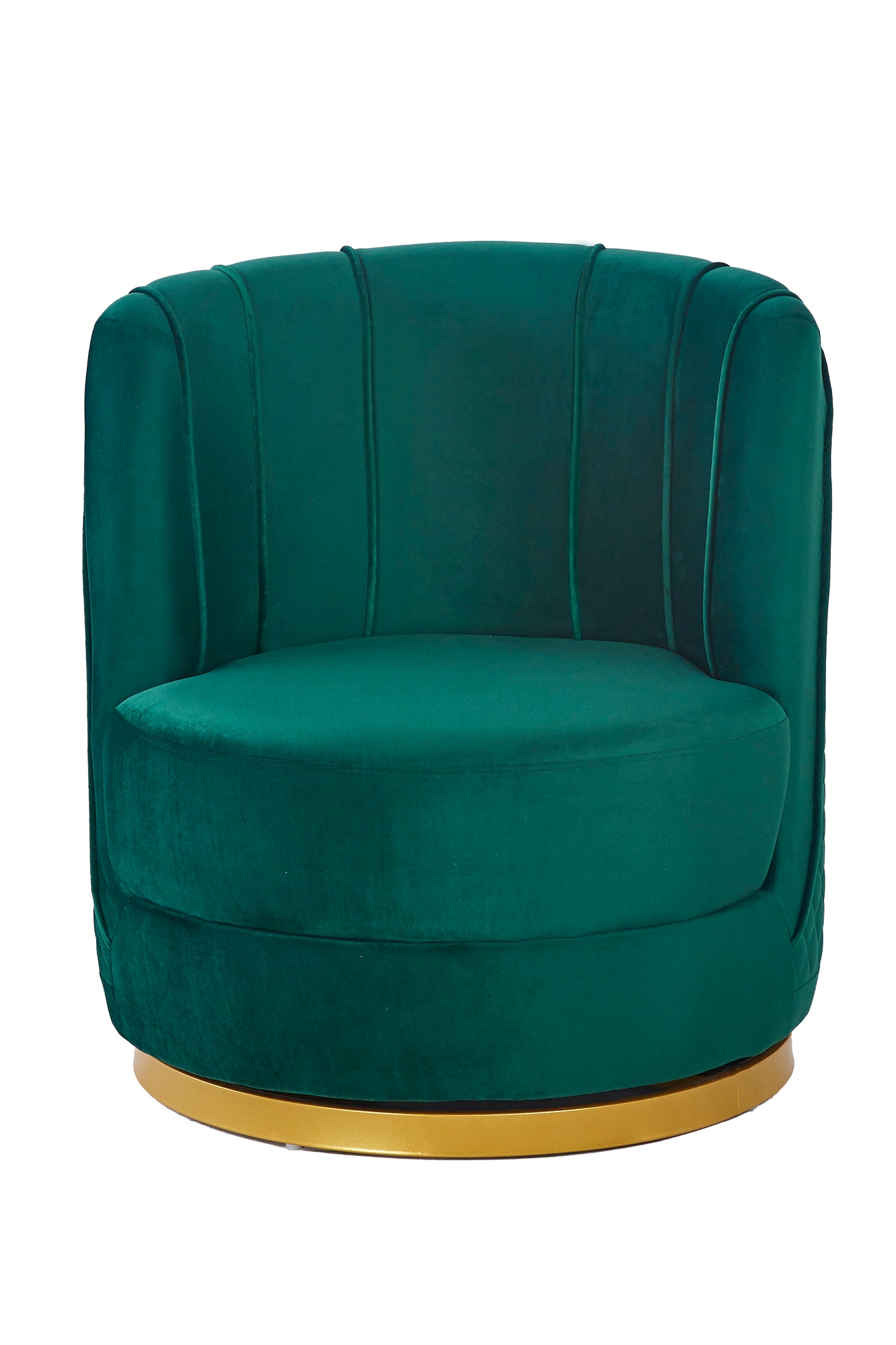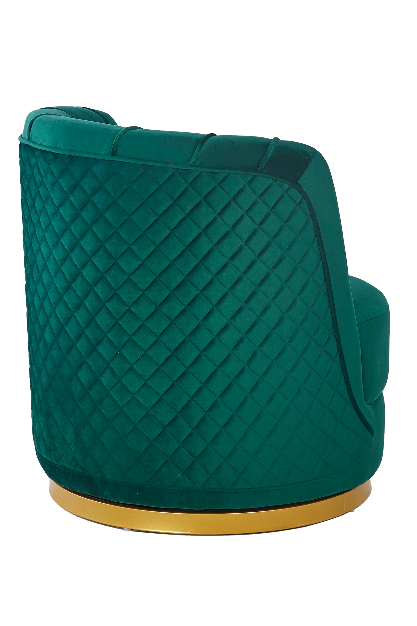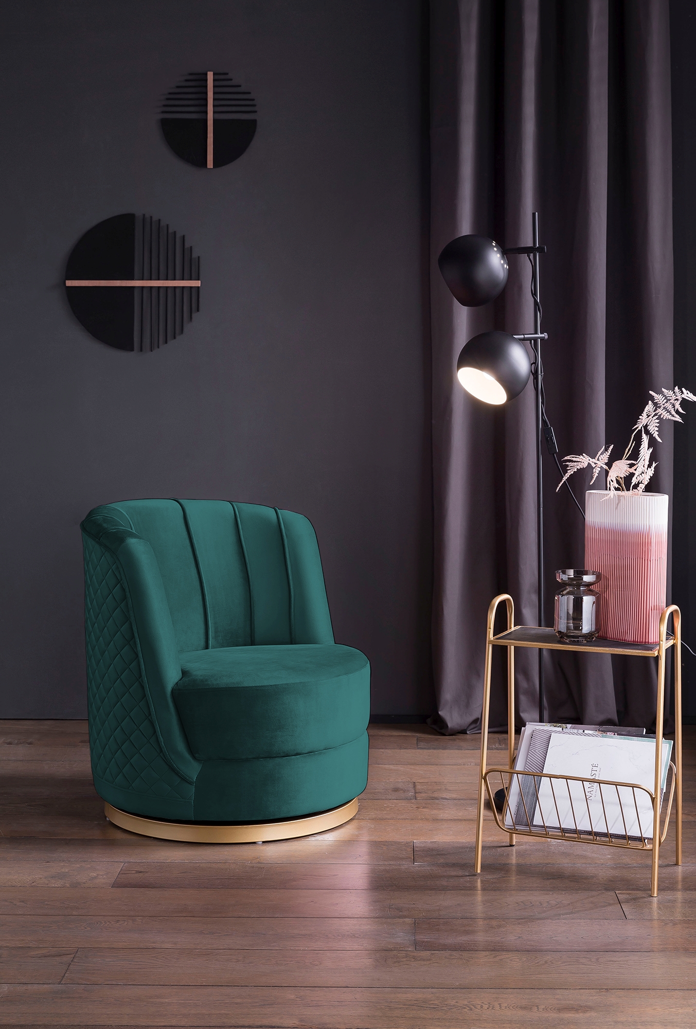 Extravaganter Drehsessel im modernen Design – Der Sessel mit Rautensteppung auf der Rückseite und goldfarbenem Metallsockel mit Drehfunktion wird garantiert zum Hingucker im Wohnbereich. Der schimmernde Samtbezug und vertikale Steppnähte im Rücken runden das glamouröse Bild gekonnt ab. Das üppig gepolsterte Sitzkissen sorgt für optimalen Sitzkomfort. Egal ob in der Leseecke, am Schreibtisch oder an der Schminkkommode – Der 360°-Drehsessel wird zum edlen Designkompagnon in Ihrem Zuhause. Erhältlich ist das Sitzmöbel in 5 edlen Farbvariationen.