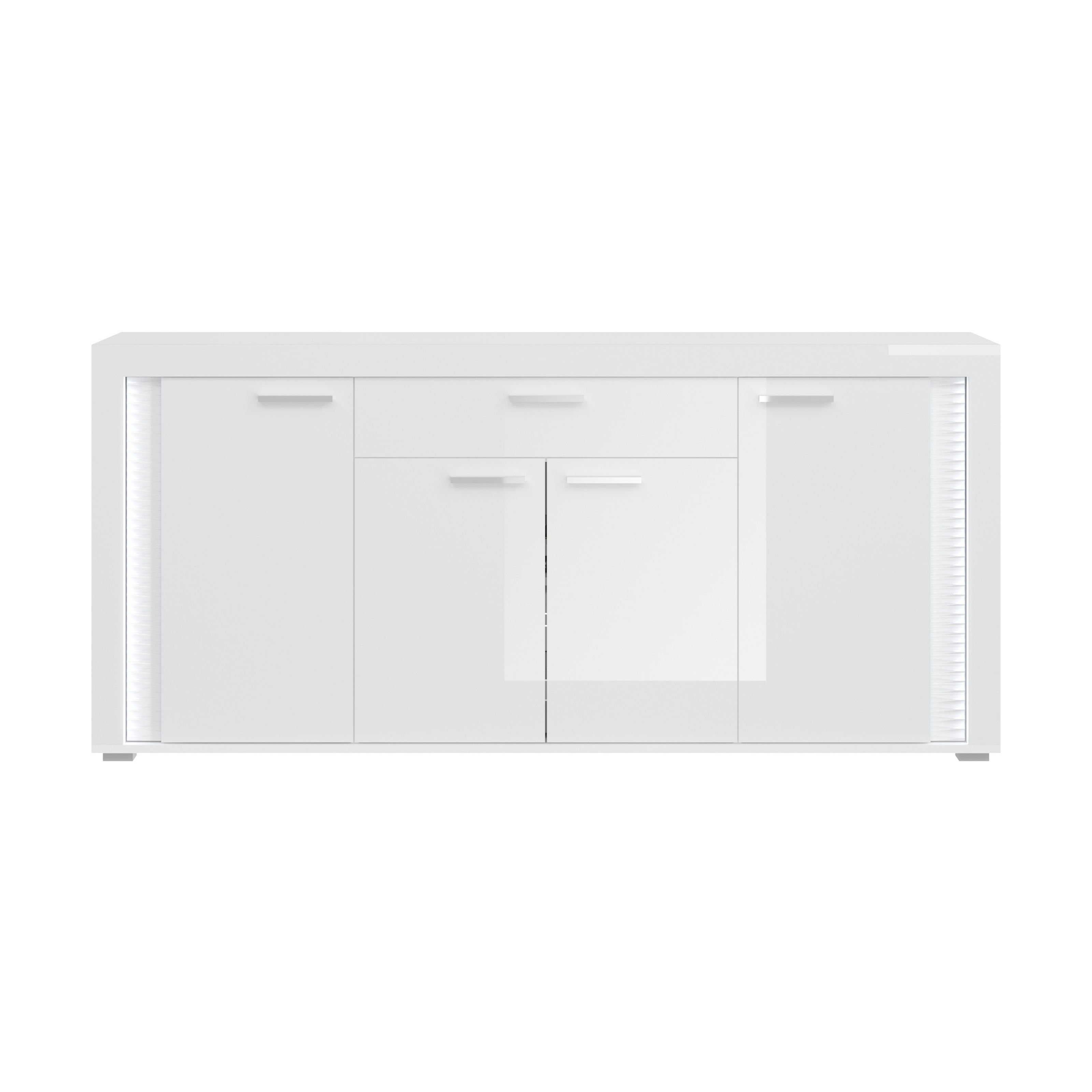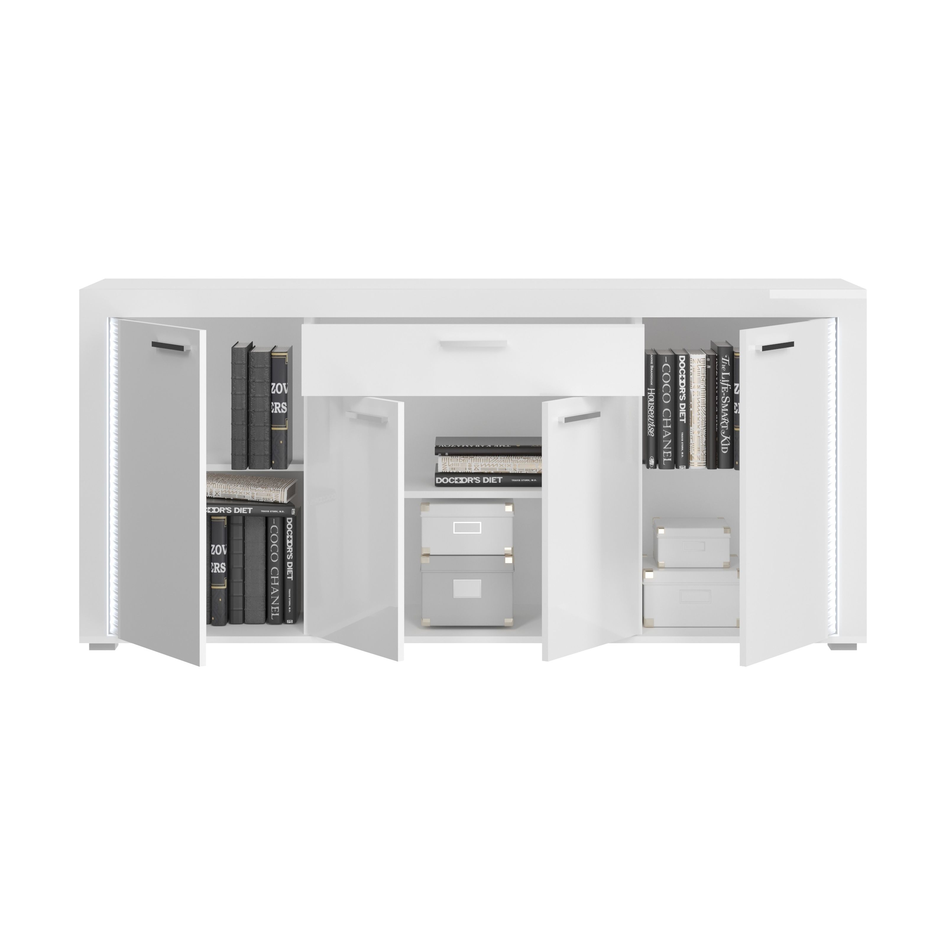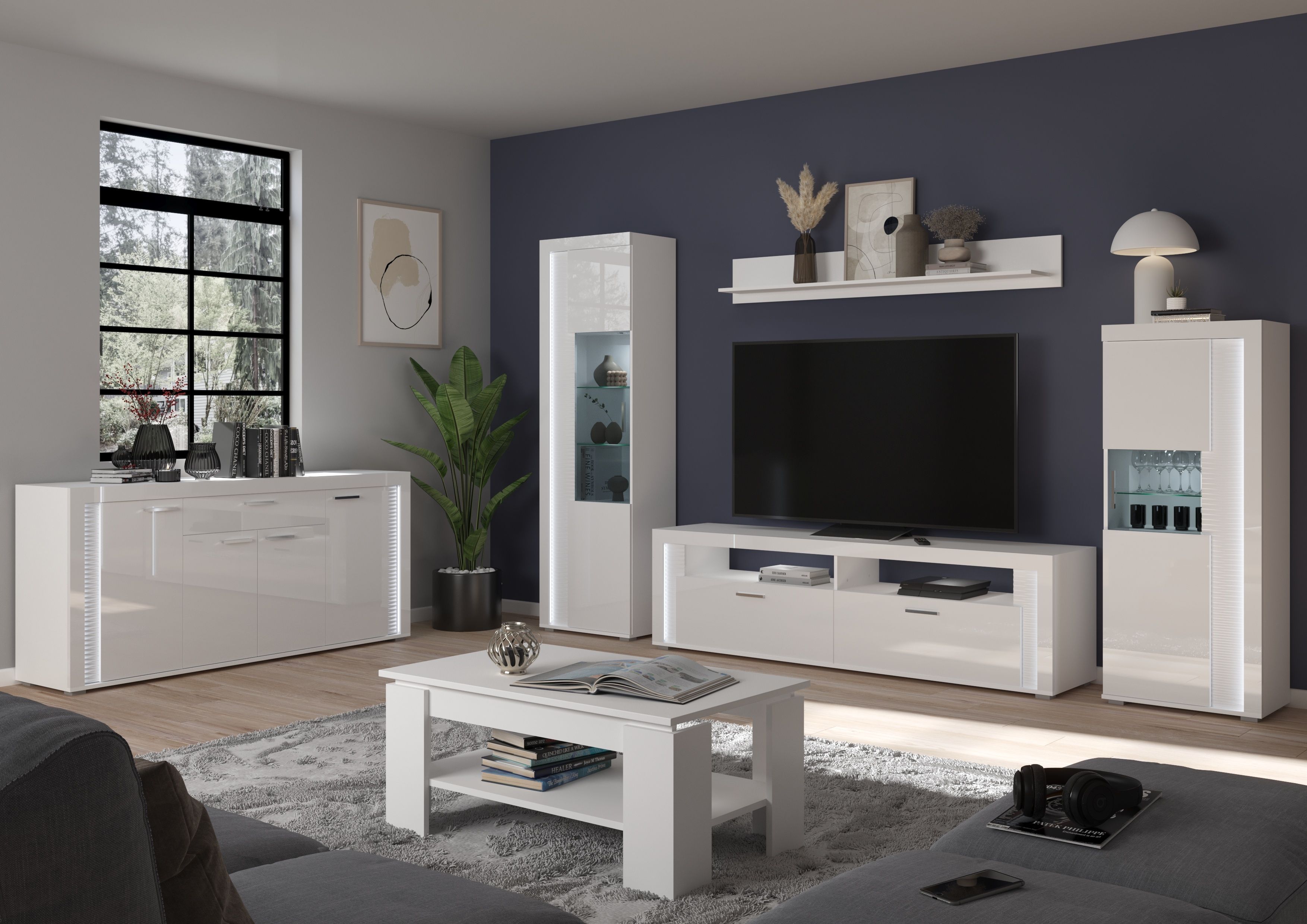 - Design/Stil: Das Sideboard in weißer Nachbildung mit weißem Hochglanz tiefzieh präsentiert sich mit einem modernen und eleganten Design, das durch seine glänzende Oberfläche und klare Linienführung eine zeitgemäße Ästhetik im Wohnzimmer schafft, die gleichzeitig schlicht und ansprechend ist.