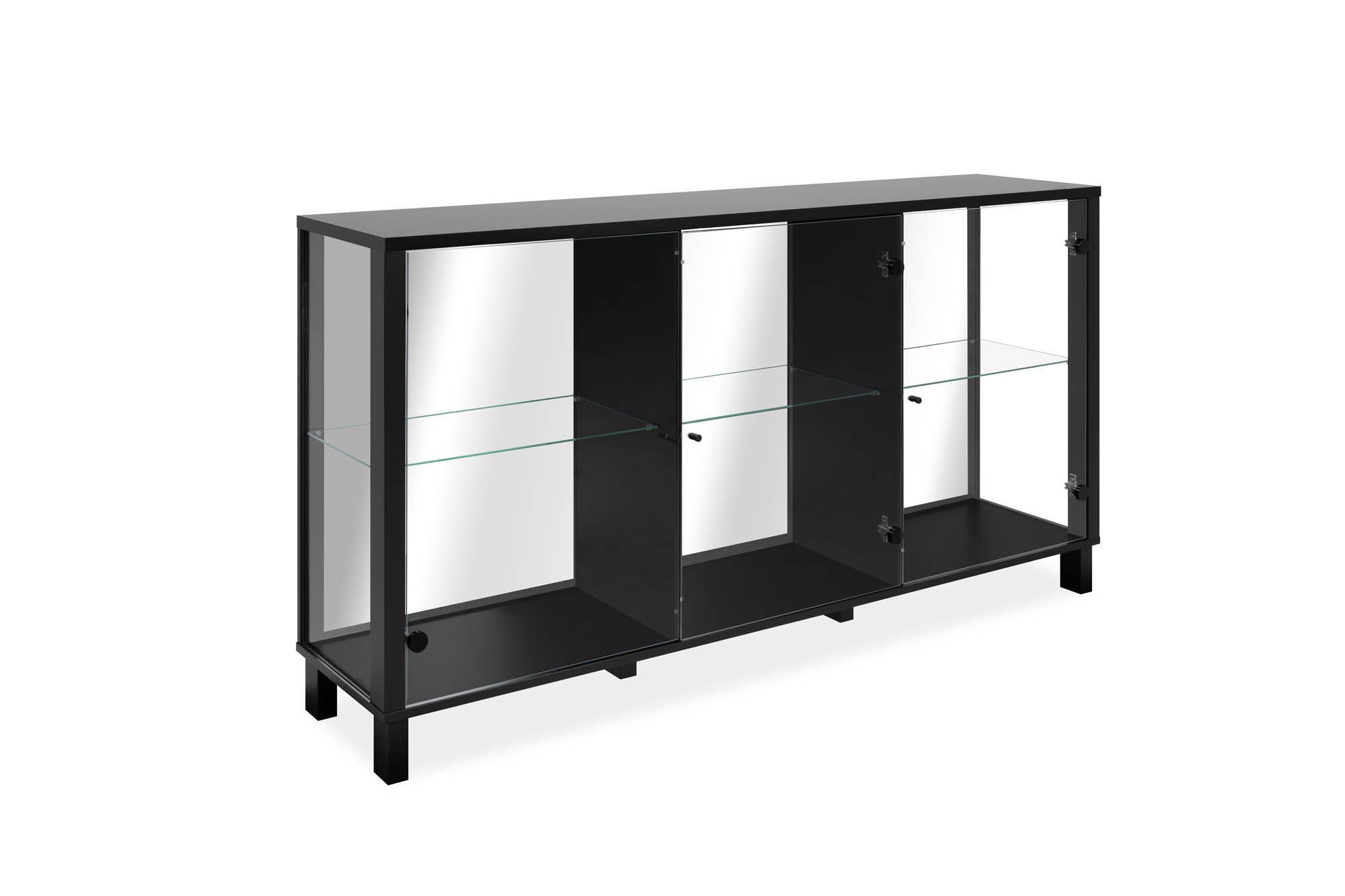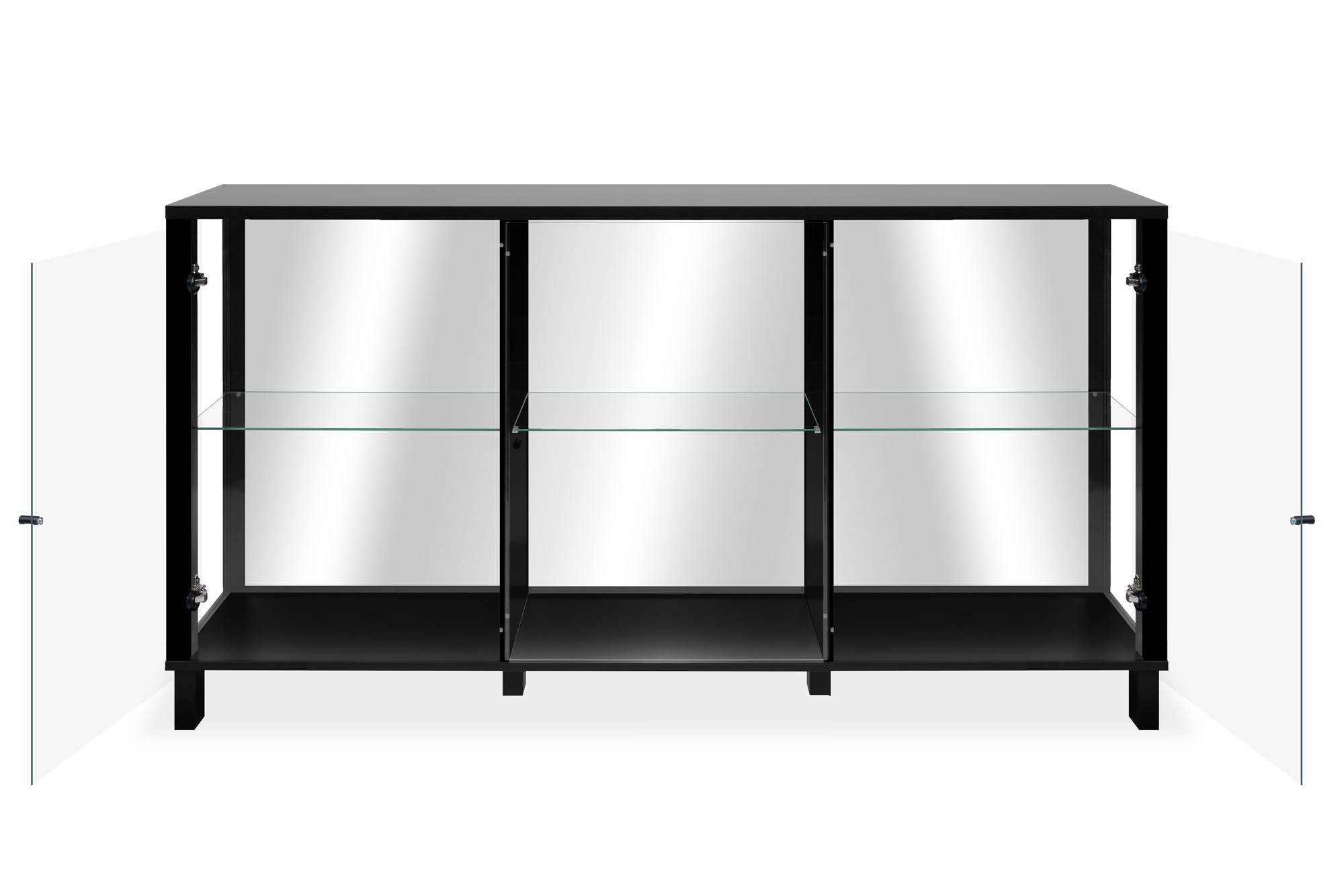 Schwarz kombiniert mit einer Spiegelrückwand und Seitenwänden und Türen aus Glas