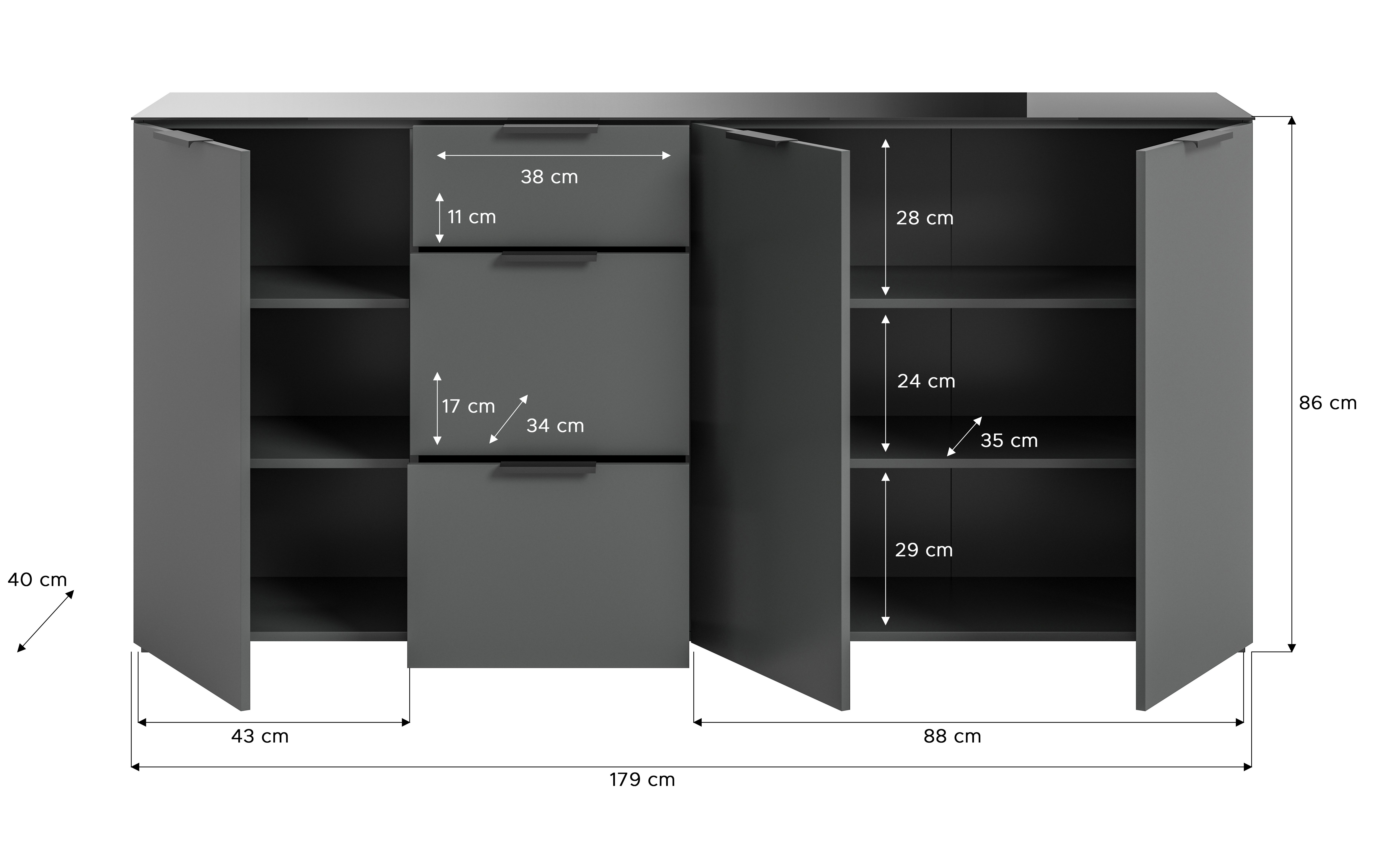 - Funktionalität: Mit Abmessungen von 179x86x40 cm bietet das Sideboard ausreichend Stauraum für verschiedene Gegenstände wie Kleidung, Accessoires oder Wohnzubehör. Die Fächer ermöglichen eine praktische Organisation und Aufbewahrung von verschiedenen Utensilien, während die obere Ablagefläche zusätzlichen Platz für Dekorationen oder persönliche Gegenstände bietet.