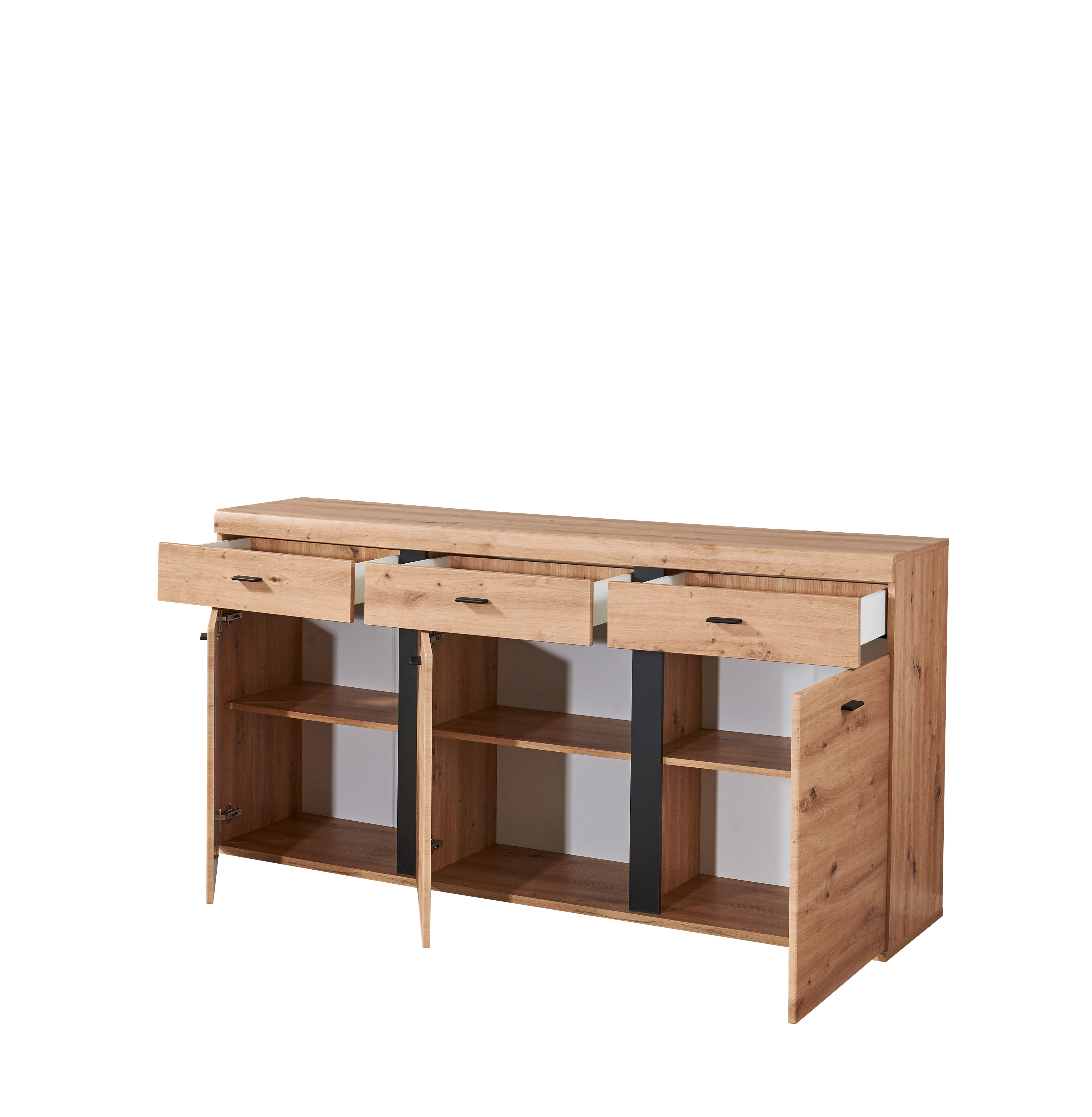 Front: Artisan Eiche Holznachbildung, MDF (Mitteldichte Holzfaserplatte) foliert mit Absetzungen in Schwarz (Spanplatte Melaminbeschichtung)