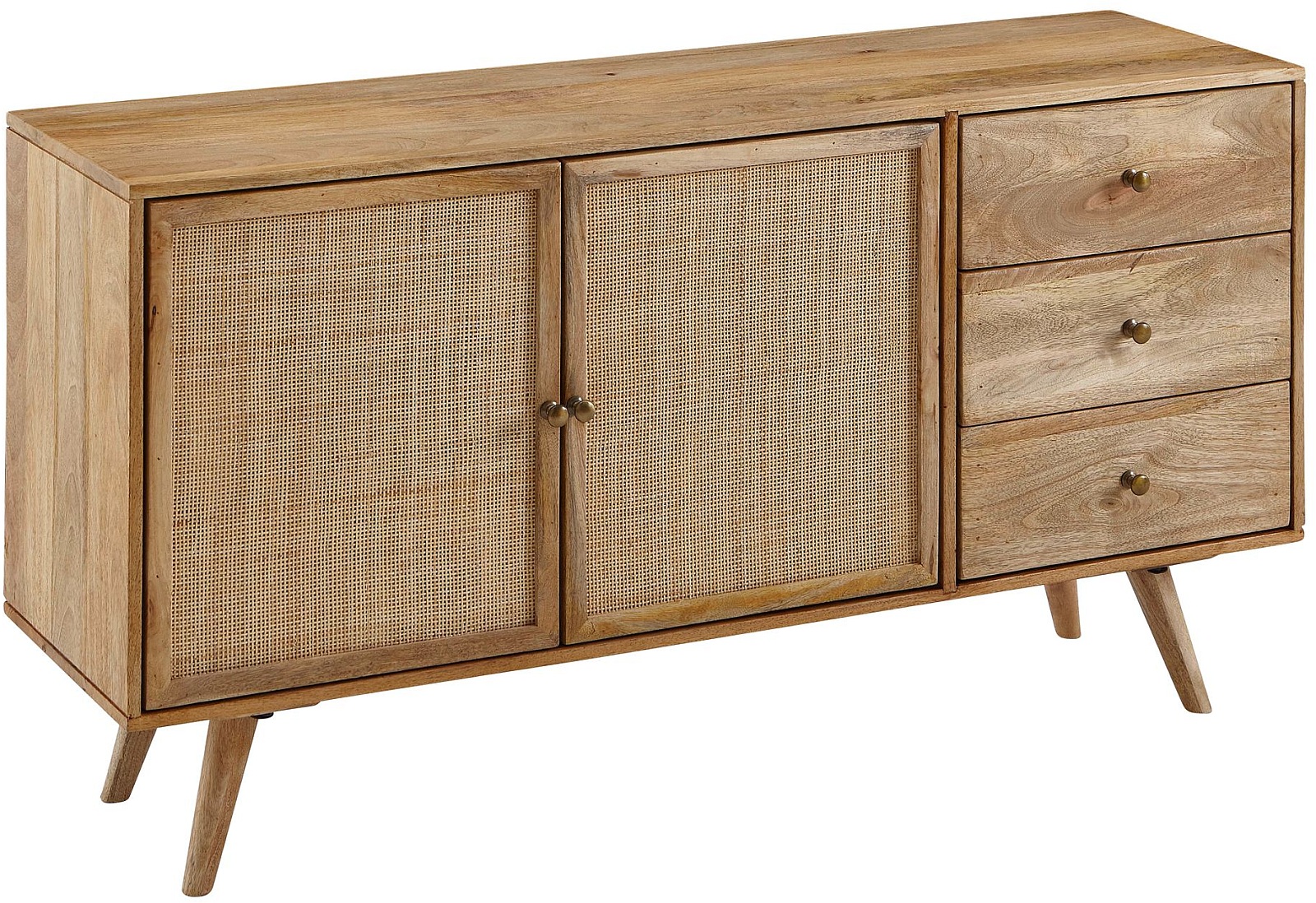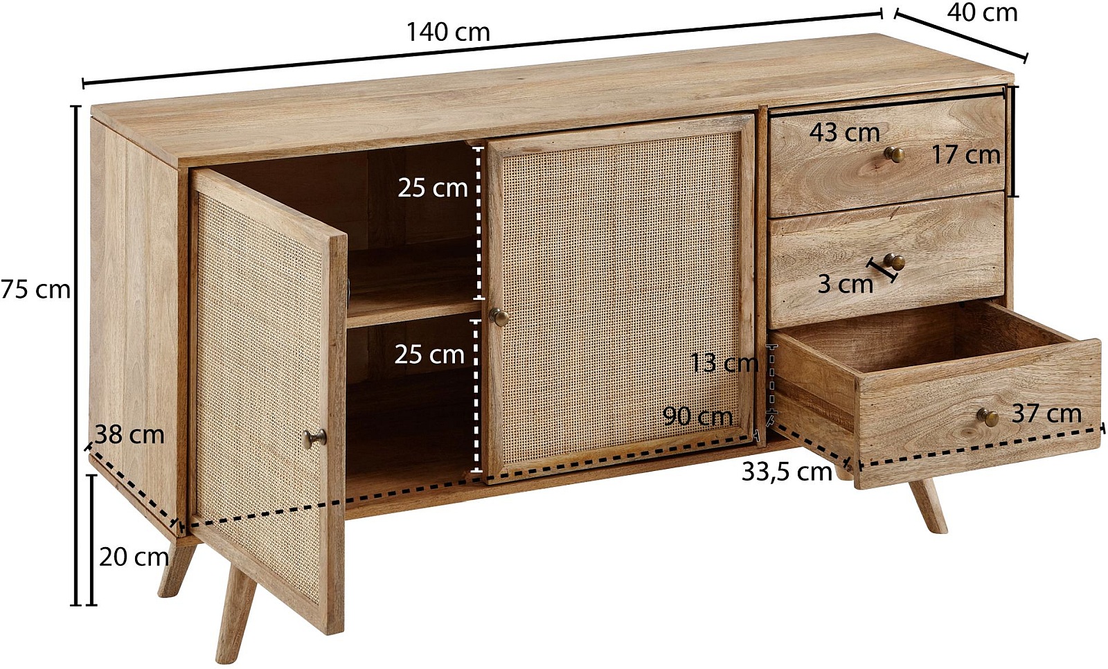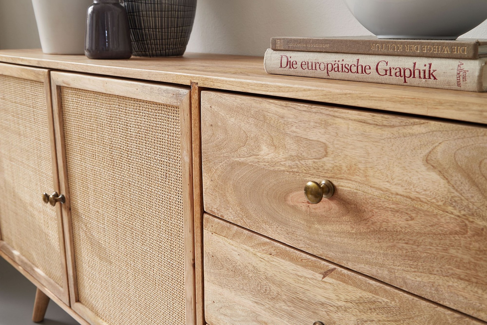 MATERIAL ✔ Der Korpus besteht aus massiven Mangoholz, welches mit schützendem Klarlack beschichtet ist. Die Türfronten ziert ein Geflecht aus Schilfrohr. Lackiertes Eisen bildet das Material der Griffe.