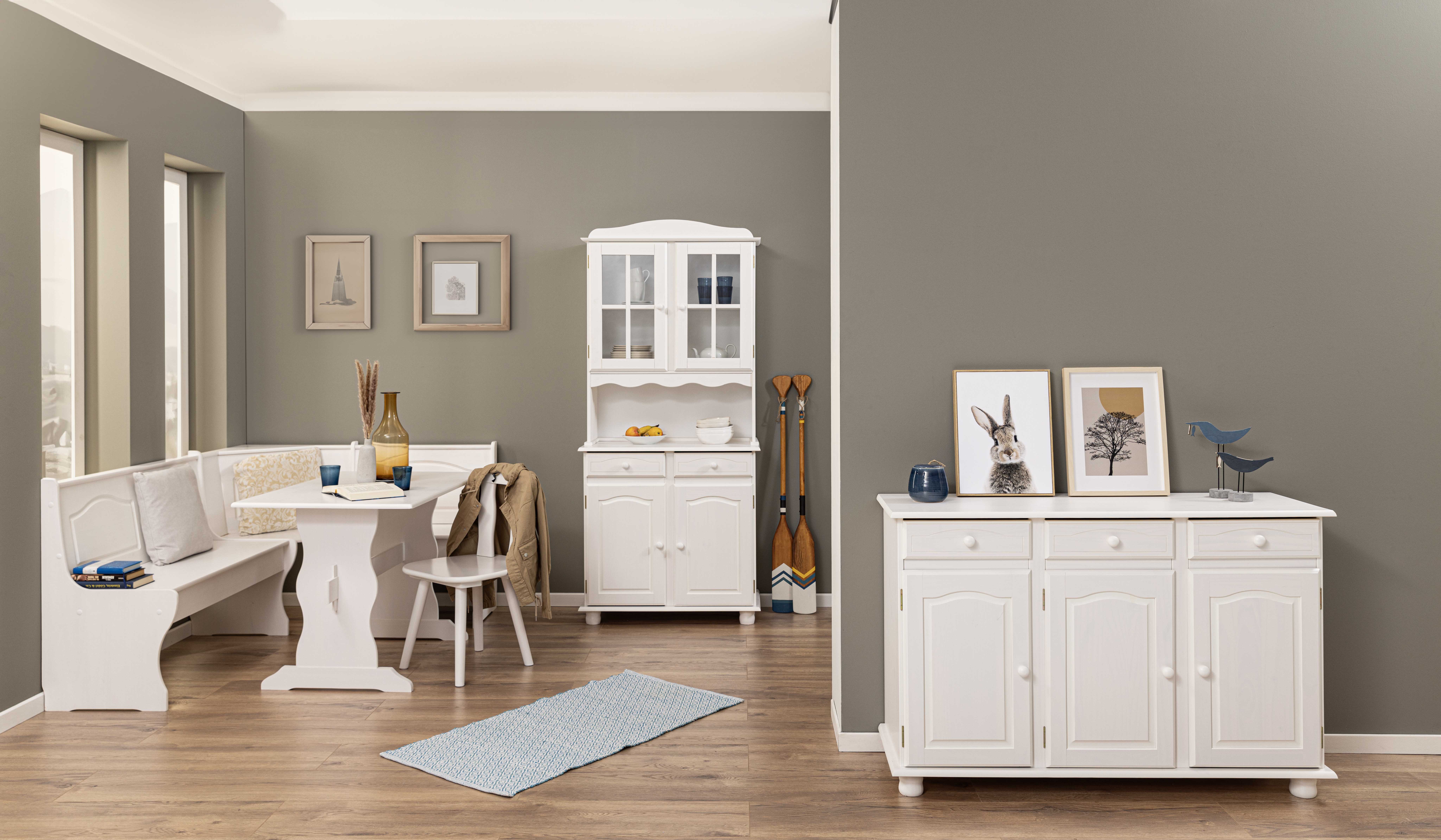 Die natürliche Holzmaserung des Massivholzes bleibt durch die leicht weiße Lackierung erhalten und bringt die Schönheit des Materials perfekt zur Geltung.