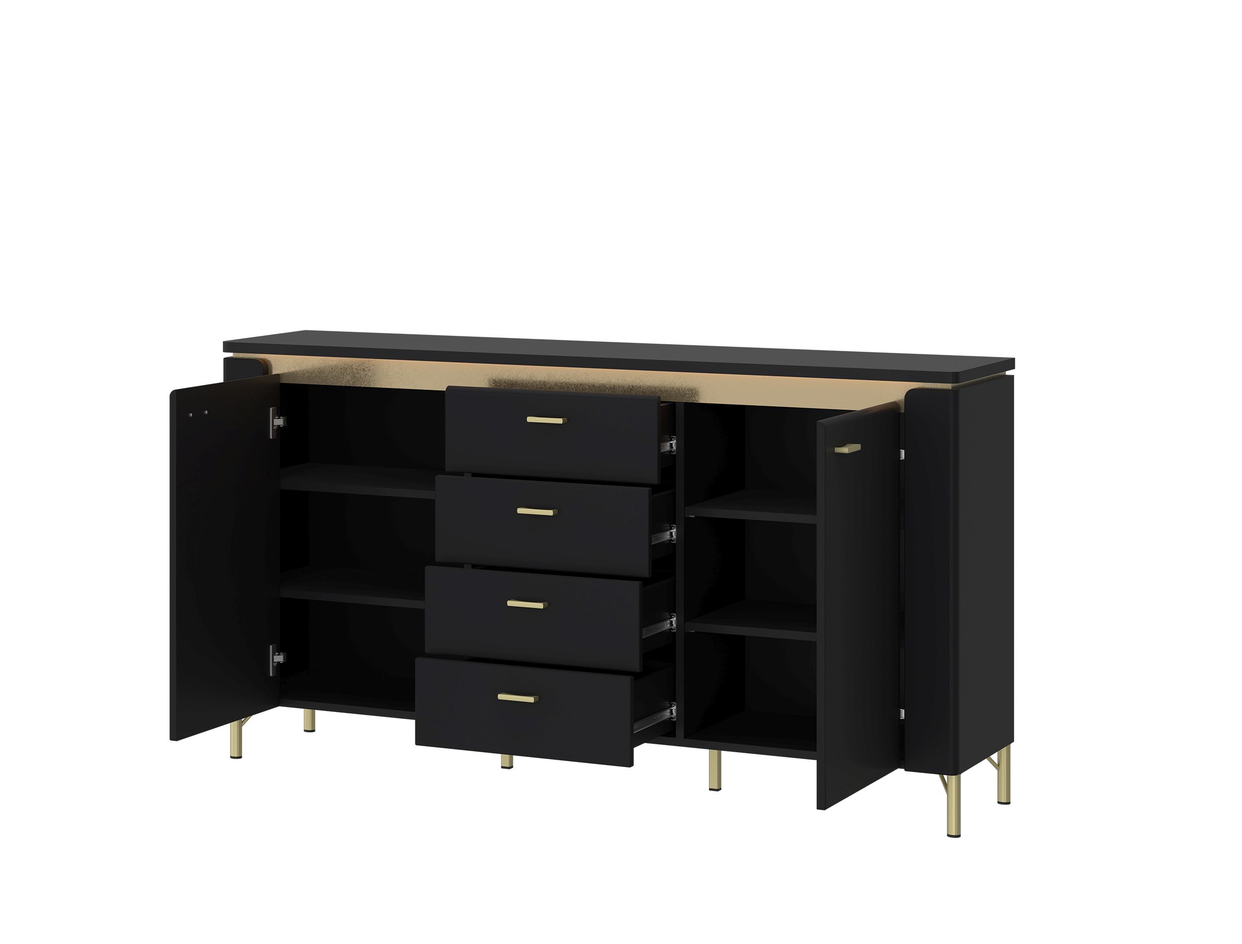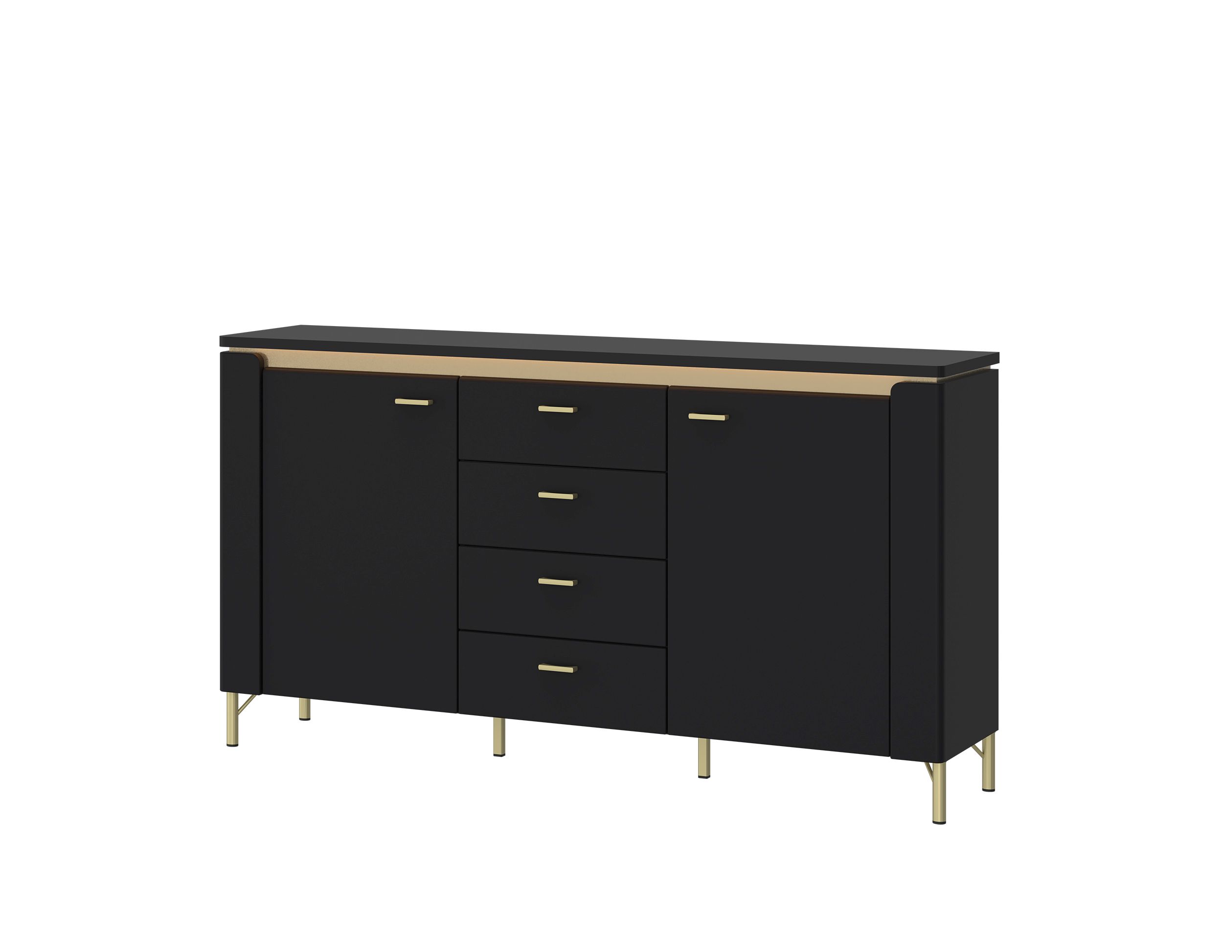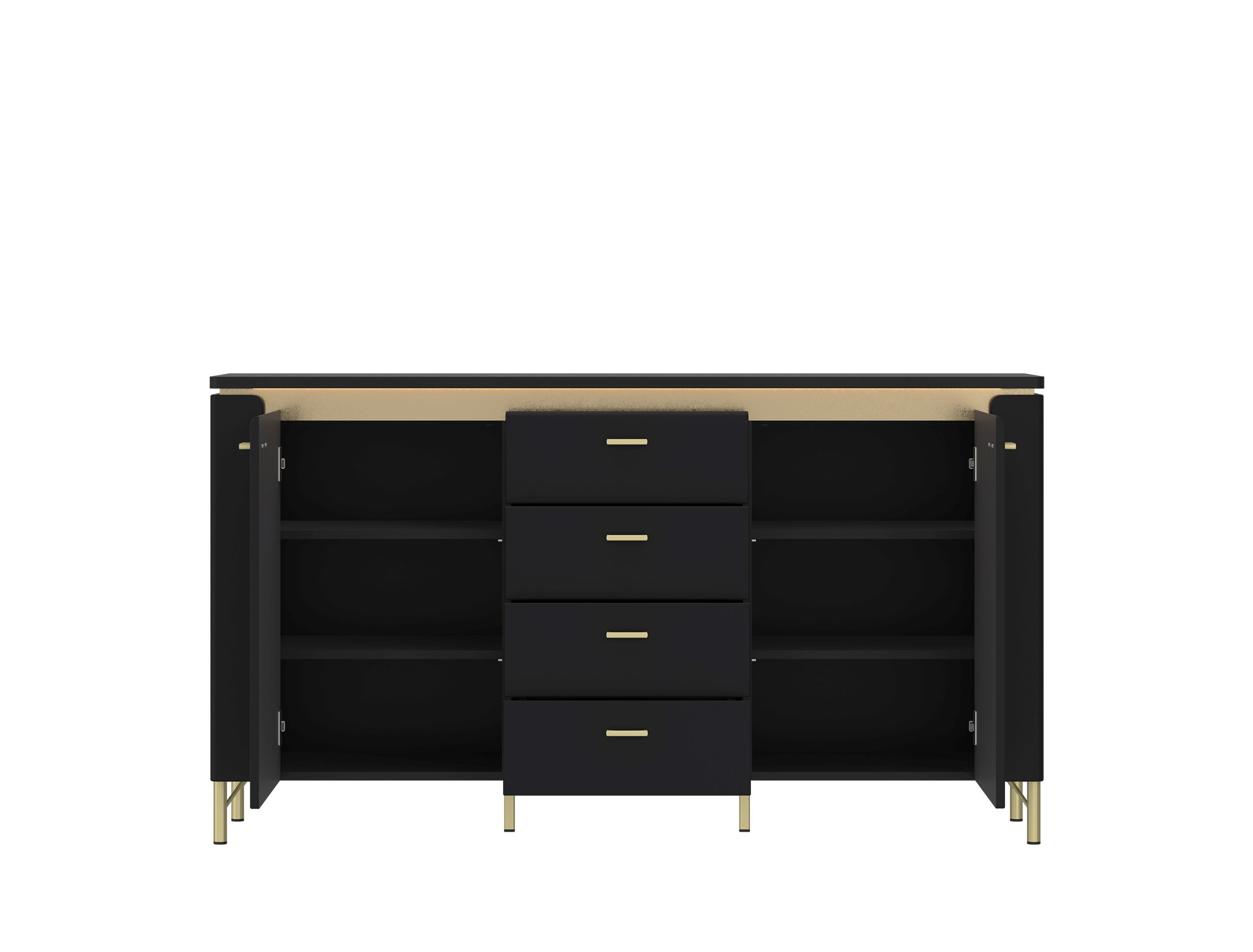 Korpus: Schwarz matt kombiniert mit Absetzungen in goldfarben, MDF Platte, Spanplatte mit Melaminharzbeschichtung