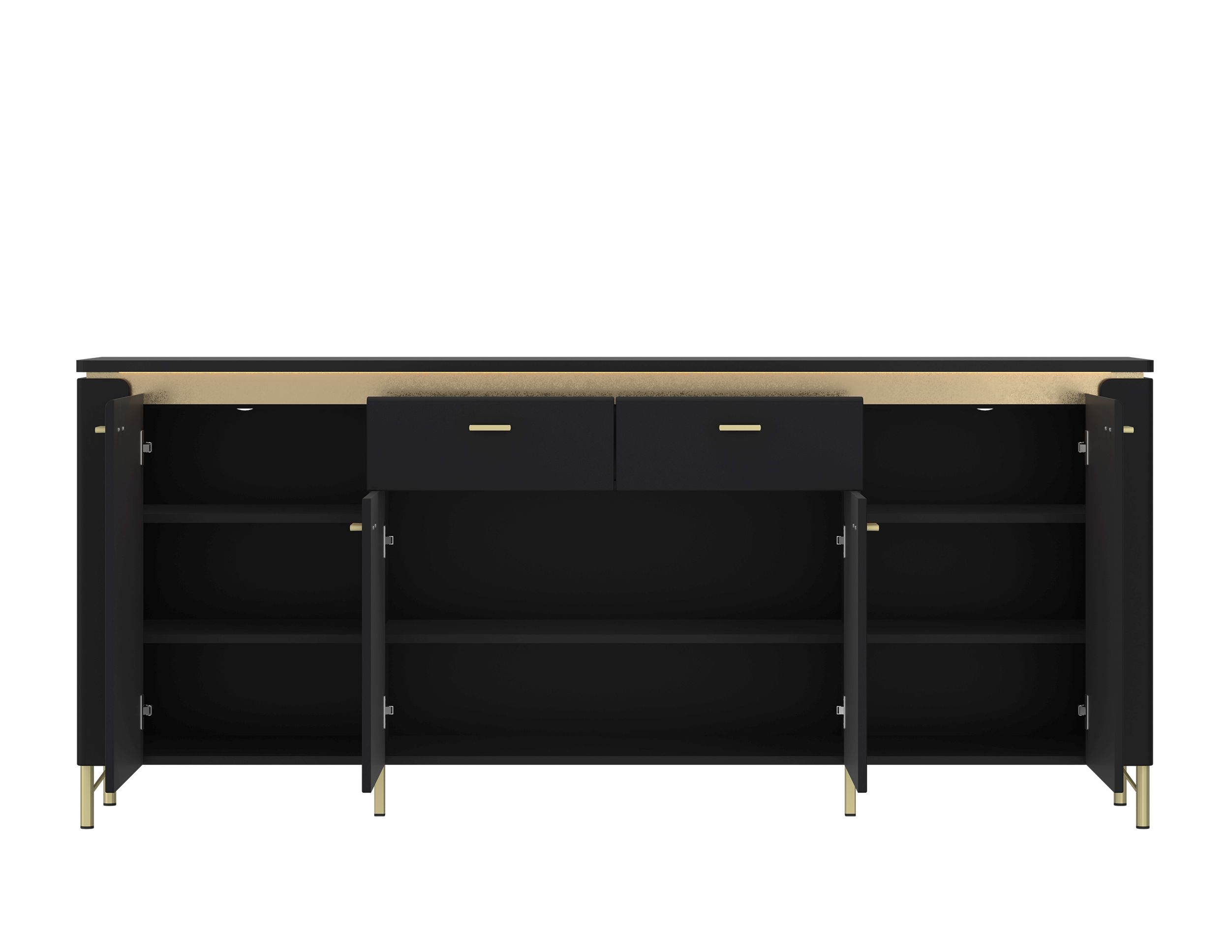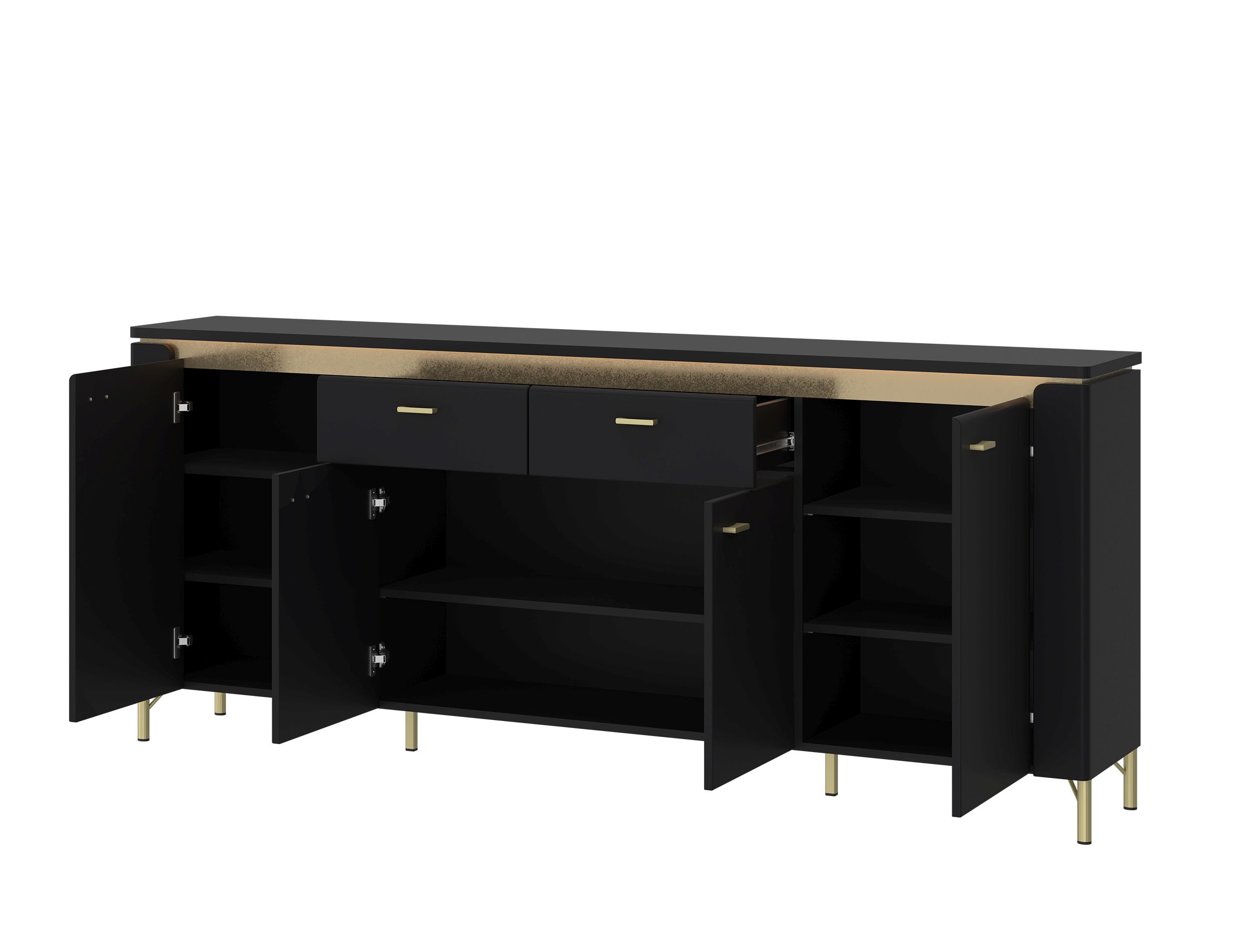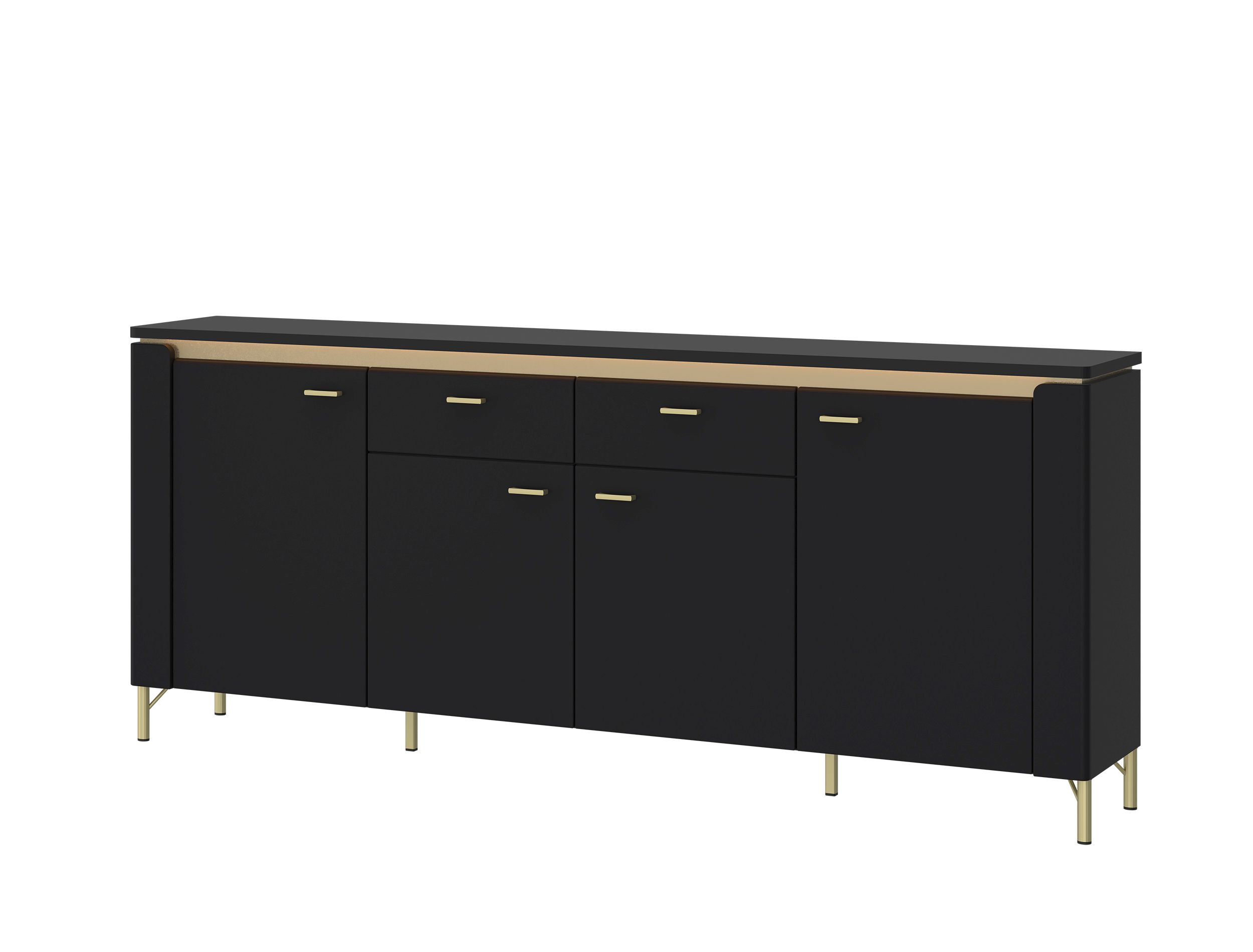 Korpus: Schwarz matt kombiniert mit Absetzungen in goldfarben, MDF Platte, Spanplatte mit Melaminharzbeschichtung