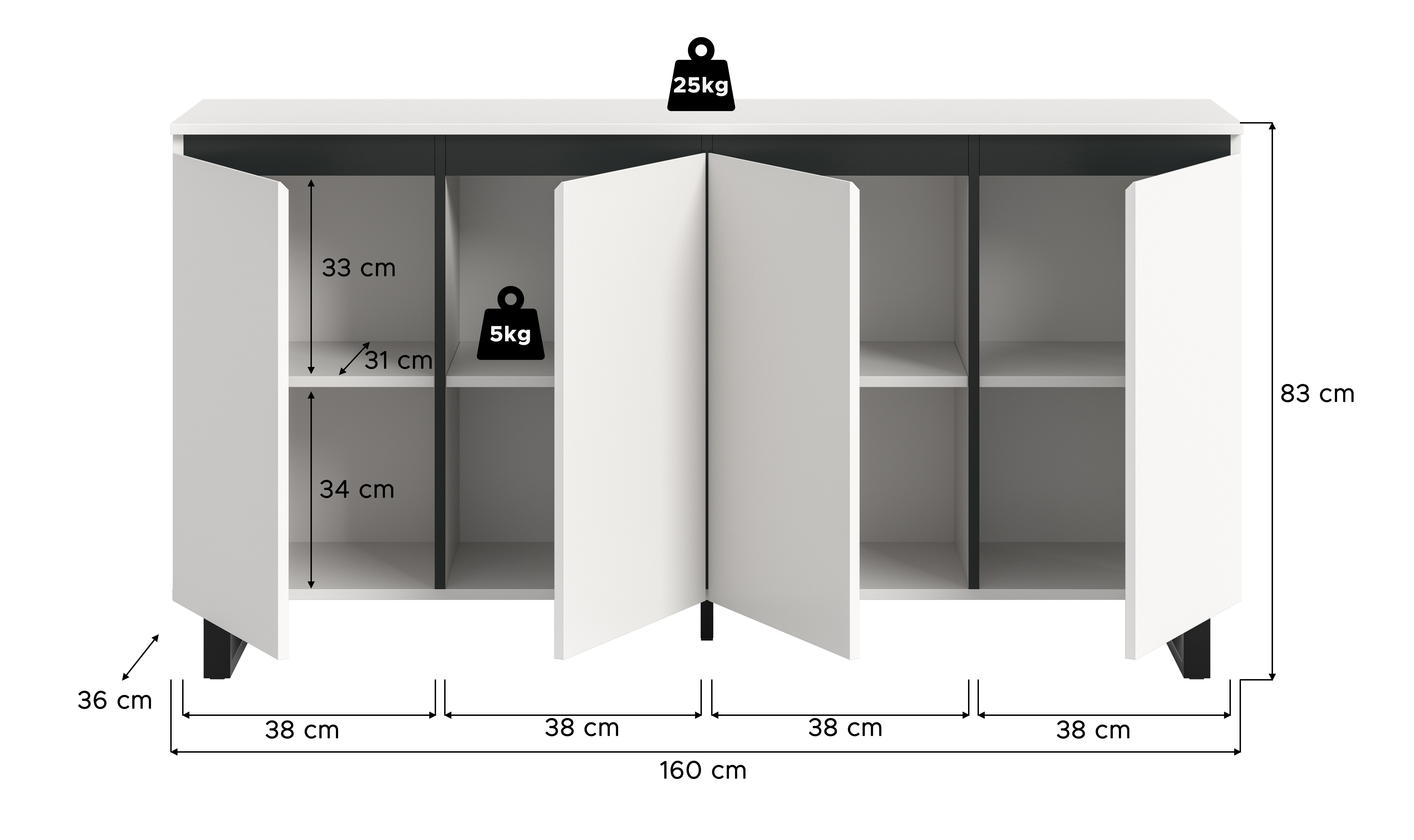 - 4 Türen, 4 höhenverstellbare Einlegeböden, 8 Fächer