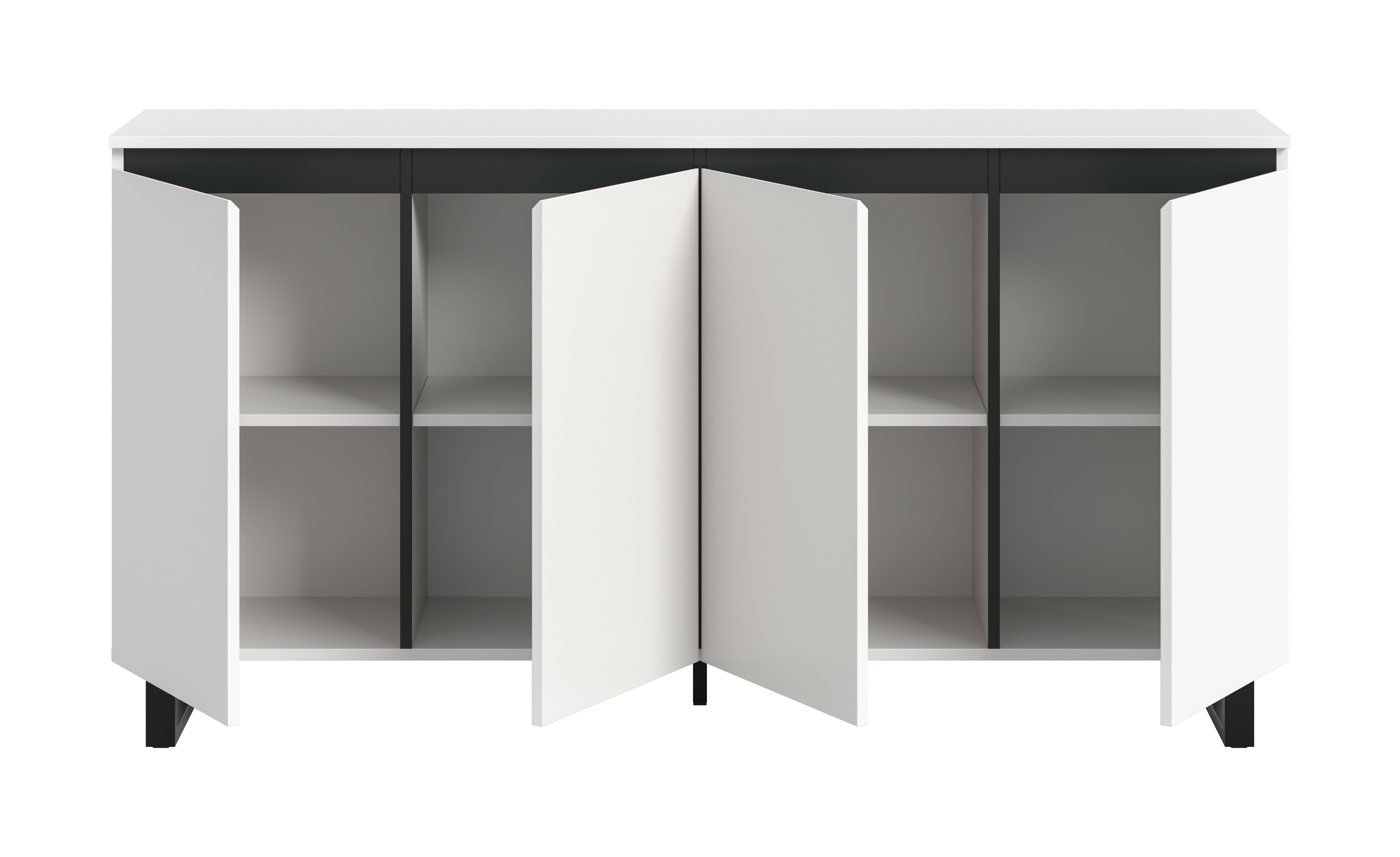 Das großzügige Sideboard in Weiß Melamin (160 x 84 x 36 cm) bietet mit vier Türen, vier höhenverstellbaren Einlegeböden und acht Fächern viel Stauraum für deine Wohnaccessoires, Bücher und Alltagsgegenstände. Die hochwertig verarbeitete, pflegeleichte Oberfläche mit abgesetzer schwarzer Schattenfuge sorgt für eine moderne und elegante Optik, die sich harmonisch in verschiedene Einrichtungsstile einfügt. Dieses Sideboard ist ideal, um Ordnung zu schaffen und gleichzeitig stilvolle Akzente zu setzen. Die robuste Konstruktion garantiert Langlebigkeit und Stabilität. Das Möbelstück lässt sich vielseitig kombinieren und ist eine perfekte Ergänzung für Wohnzimmer, Esszimmer oder Flur. Mit diesem Sideboard schaffst du ein wohnliches und funktionales Zuhause.
