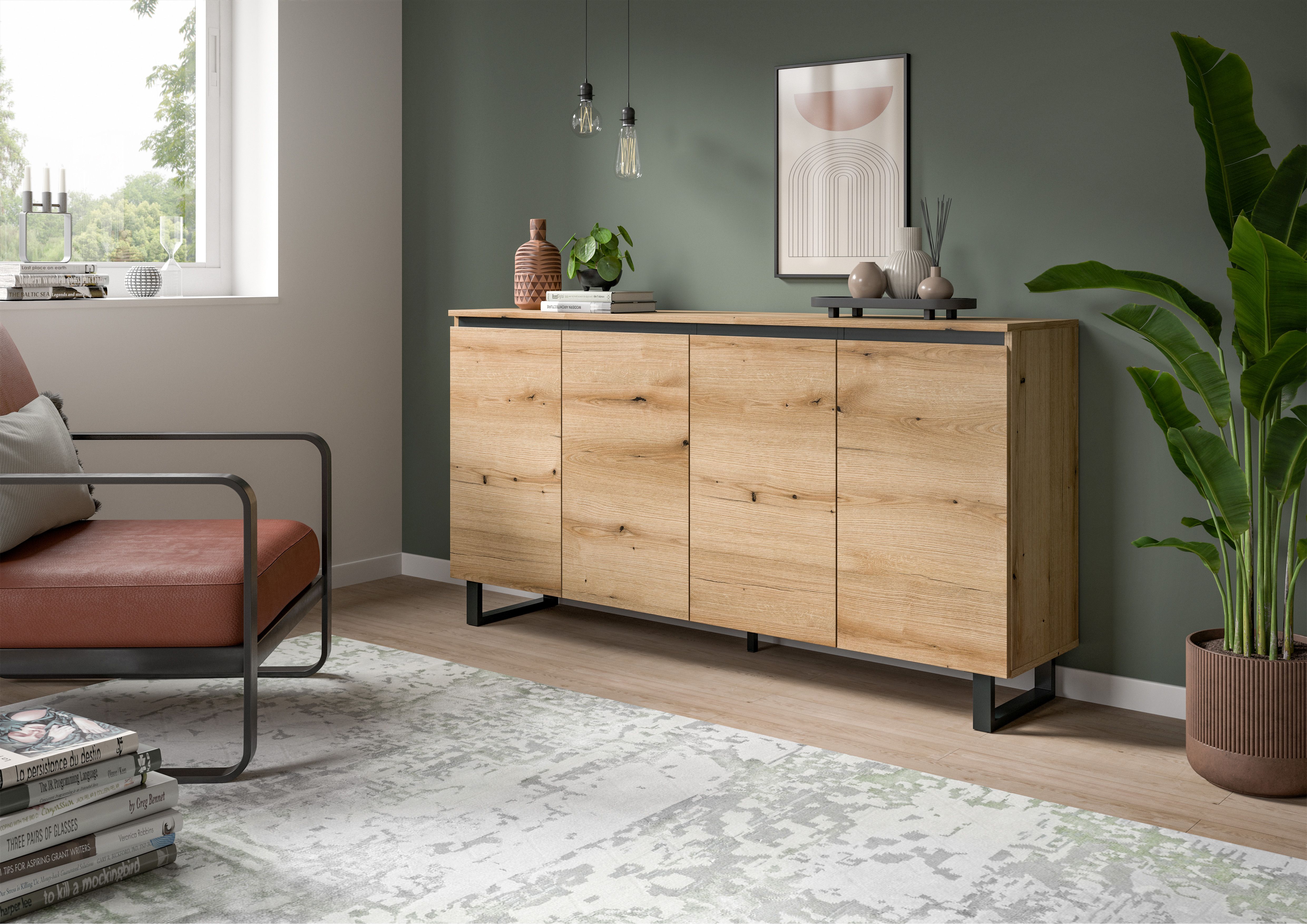 Das großzügige Sideboard in Evoke Eiche Holznachbildung (160 x 84 x 36 cm) bietet mit vier Türen, vier höhenverstellbaren Einlegeböden und acht Fächern viel Stauraum für deine Wohnaccessoires, Bücher und Alltagsgegenstände. Die hochwertig verarbeitete, pflegeleichte Oberfläche mit abgesetzer schwarzer Schattenfuge sorgt für eine moderne und elegante Optik, die sich harmonisch in verschiedene Einrichtungsstile einfügt. Dieses Sideboard ist ideal, um Ordnung zu schaffen und gleichzeitig stilvolle Akzente zu setzen. Die robuste Konstruktion garantiert Langlebigkeit und Stabilität. Das Möbelstück lässt sich vielseitig kombinieren und ist eine perfekte Ergänzung für Wohnzimmer, Esszimmer oder Flur. Mit diesem Sideboard schaffst du ein wohnliches und funktionales Zuhause.