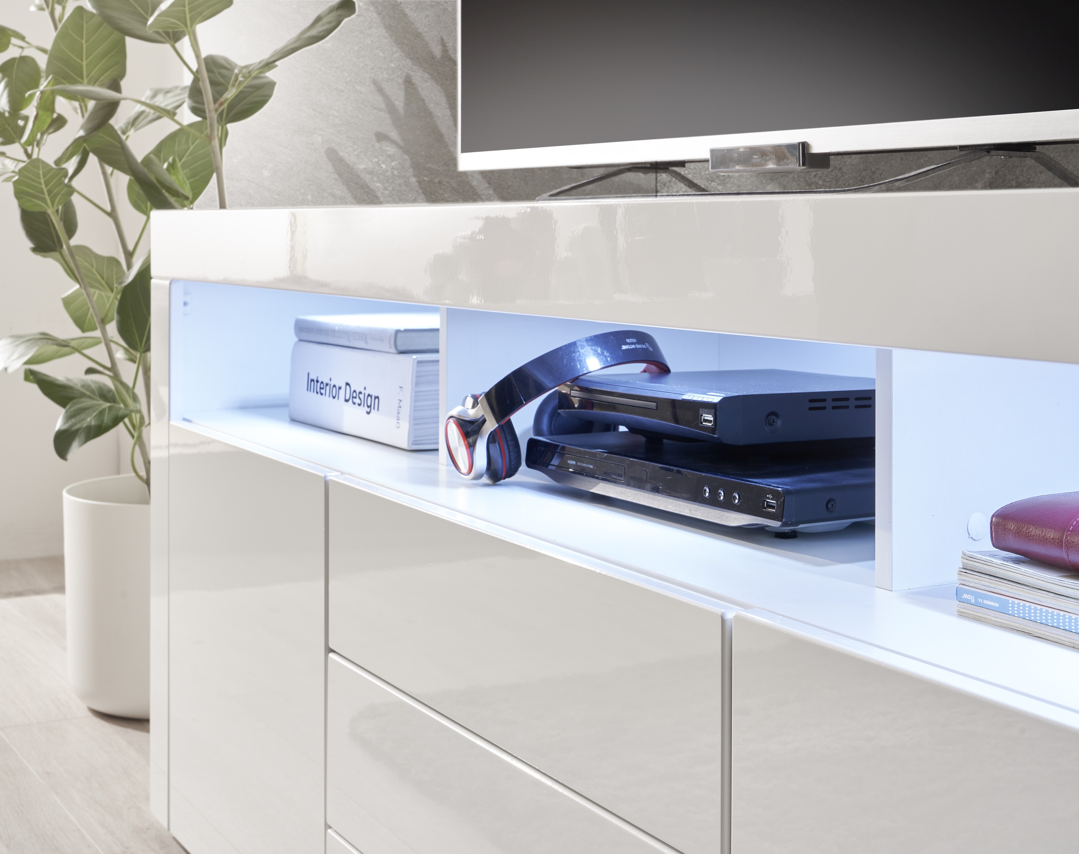 | Ausstattung Kommoden Phono Büro Regal: | Kabeldurchlass, Offene Fächer, Schublade(n), Türe(n), inkl. Beleuchtung | ||