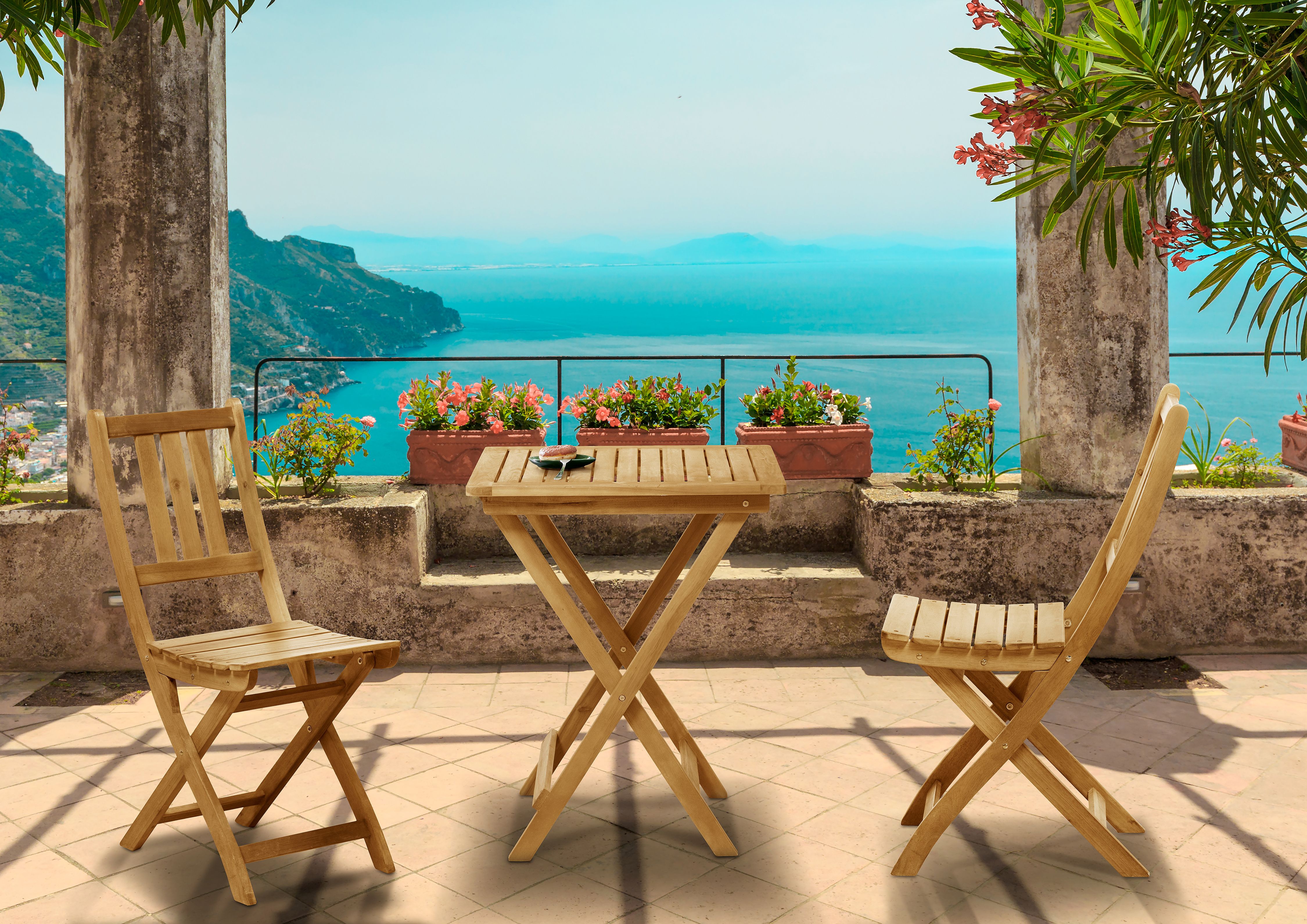 Die Balkon-Sitzgruppe, bestehend aus einem Tisch und zwei Stühlen, ist bequem und praktisch zugleich. Der Balkontisch sowie die Stühle sind klappbar und ermöglichen so eine platzsparende Lagerung. Gefertigt aus langlebigem und wetterbeständigem Akazienholz ist das Set optimal für die Verwendung im Outdoor-Bereich geeignet. Das Holz ist bereits vorgeölt, für ein besonders ansprechendes Finish. Dank der kompakten Maße ist das Balkon-Set nicht nur für Garten und Terrasse bestens geeignet, sondern findet auch Platz auf den meisten Balkonen. Ob zum gemütlichen Frühstück oder aber für den Genuss gemütlicher Sonnenstunden im Freien – Mit dieser kleinen Sitzgruppe holen Sie sich eine platzsparende und komfortable Lösung nach Hause.
