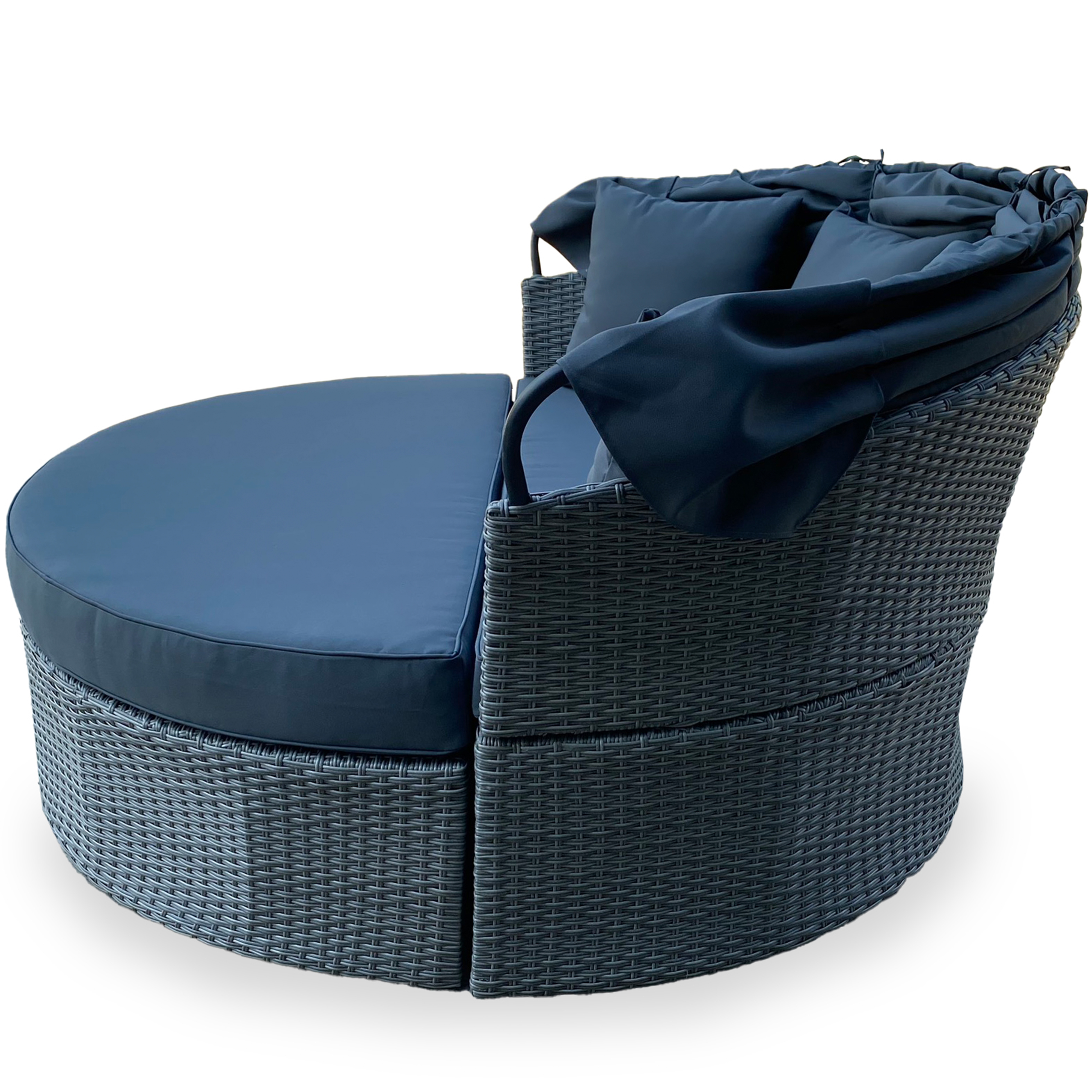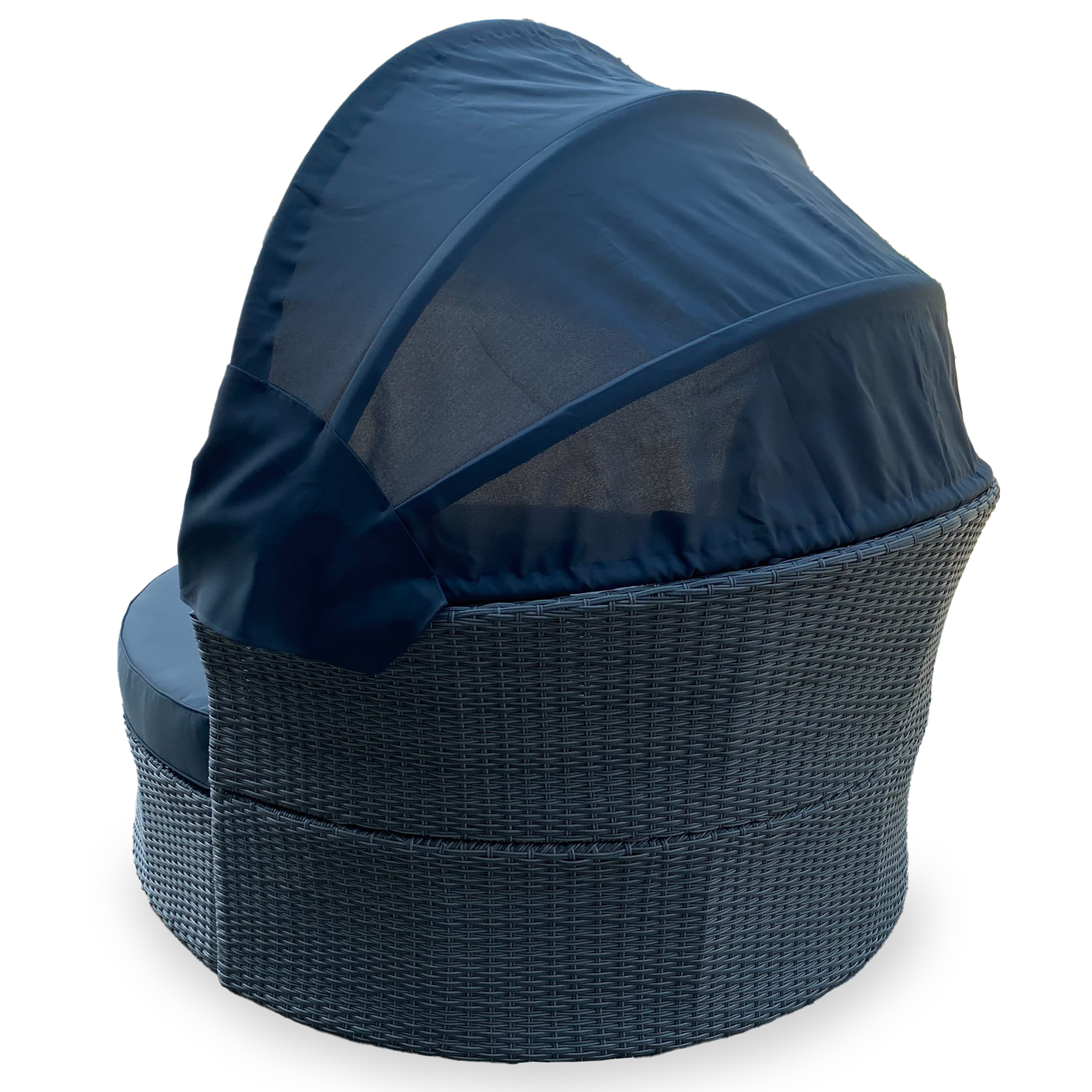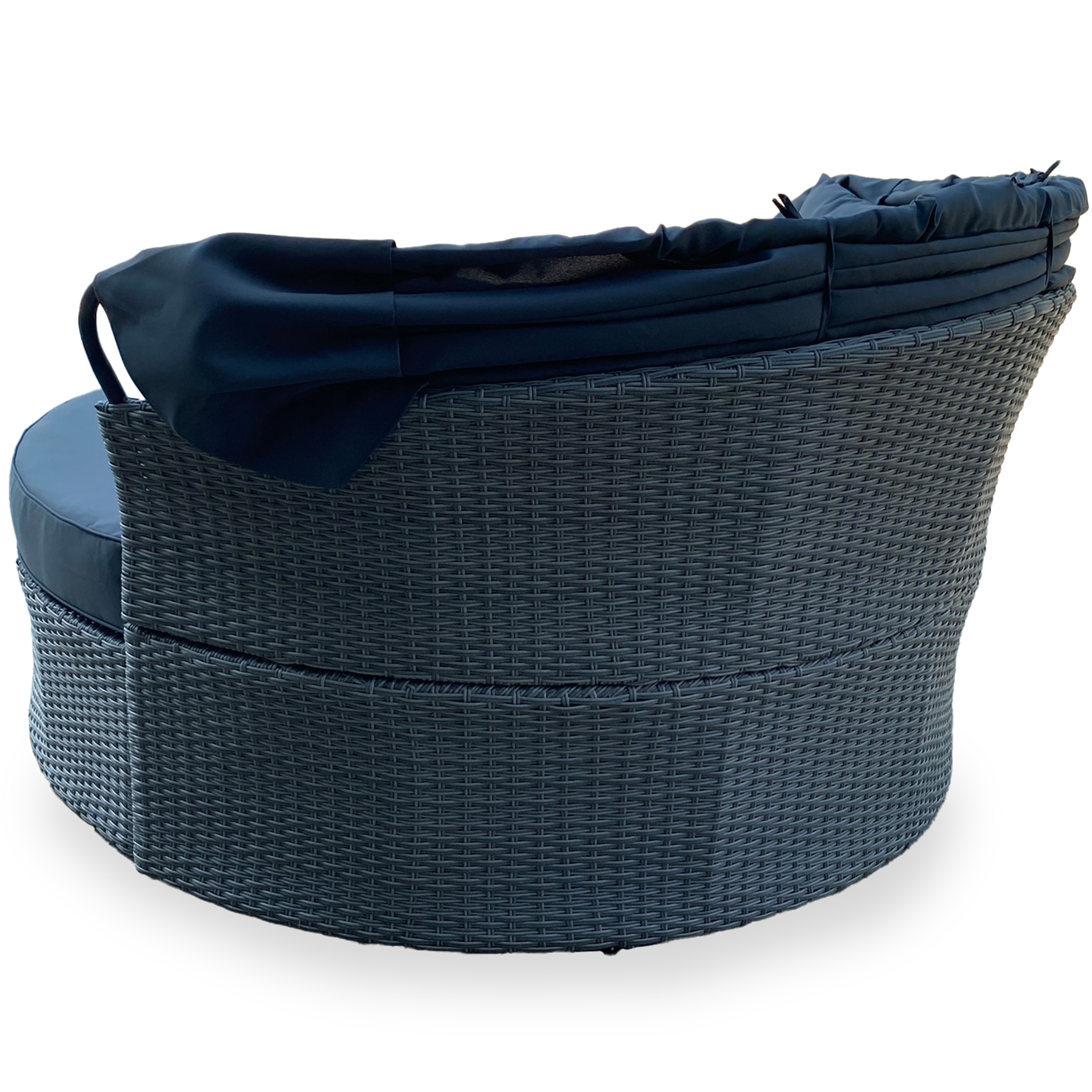 Der Korpus besteht aus hochwertigem, industriellem Rattan, das sich durch hohe Stabilität und Elastizität auszeichnet. Das Material ist wasserabweisend, witterungsbeständig und langlebig, wodurch sich die Sonneninsel ideal für den ganzjährigen Einsatz im Outdoor-Bereich eignet. Die zeitlose graue Farbgebung unterstreicht den modernen Look und lässt sich vielseitig kombinieren.