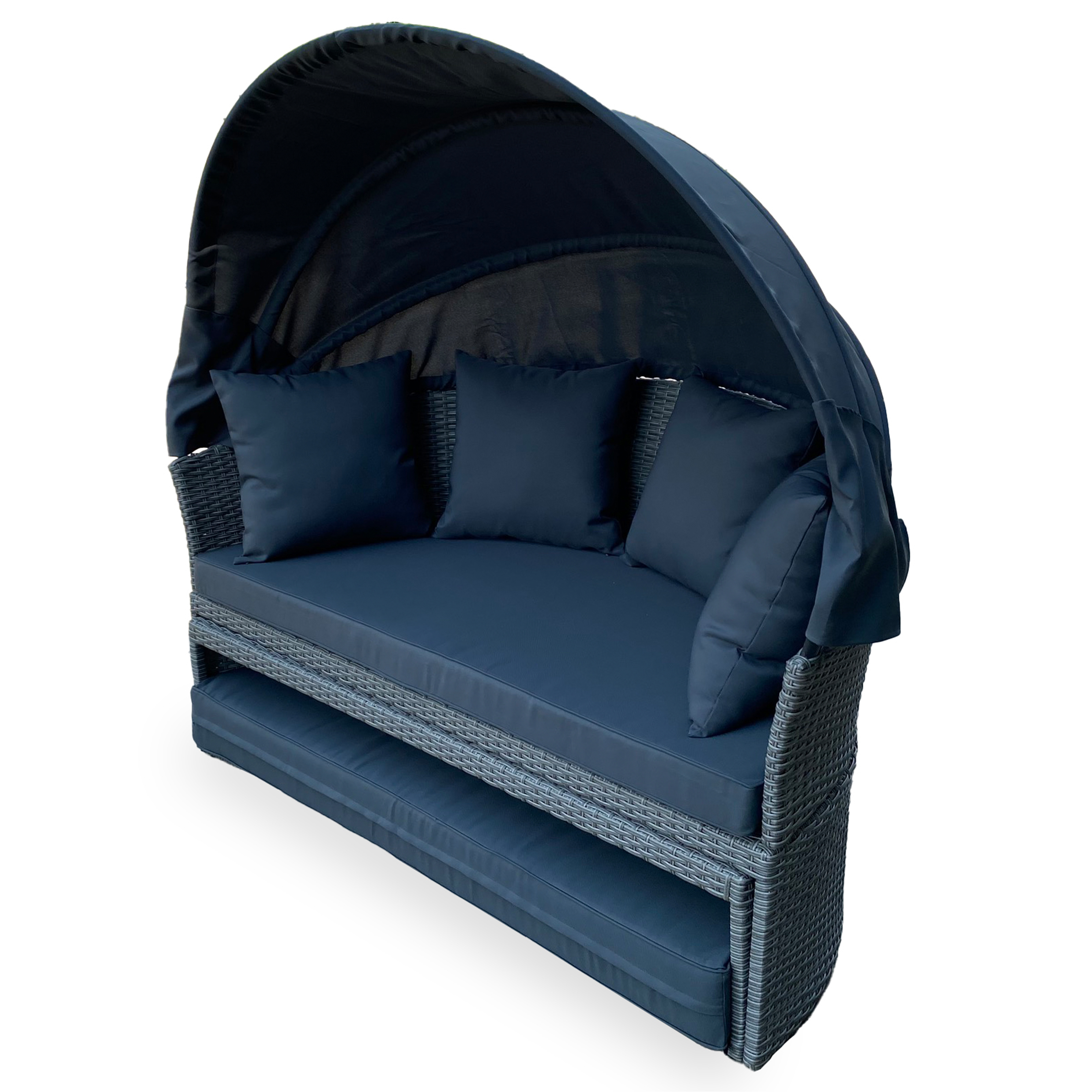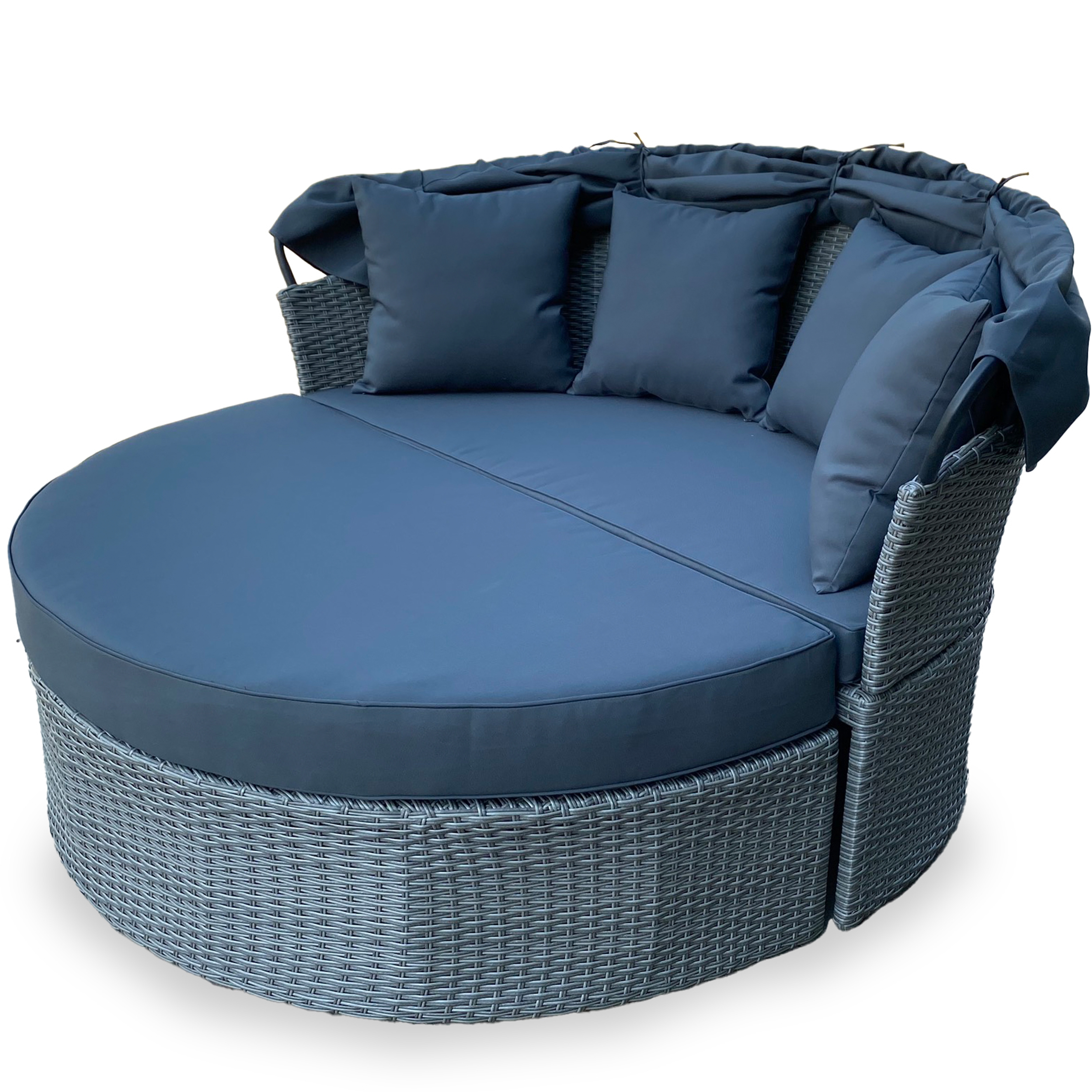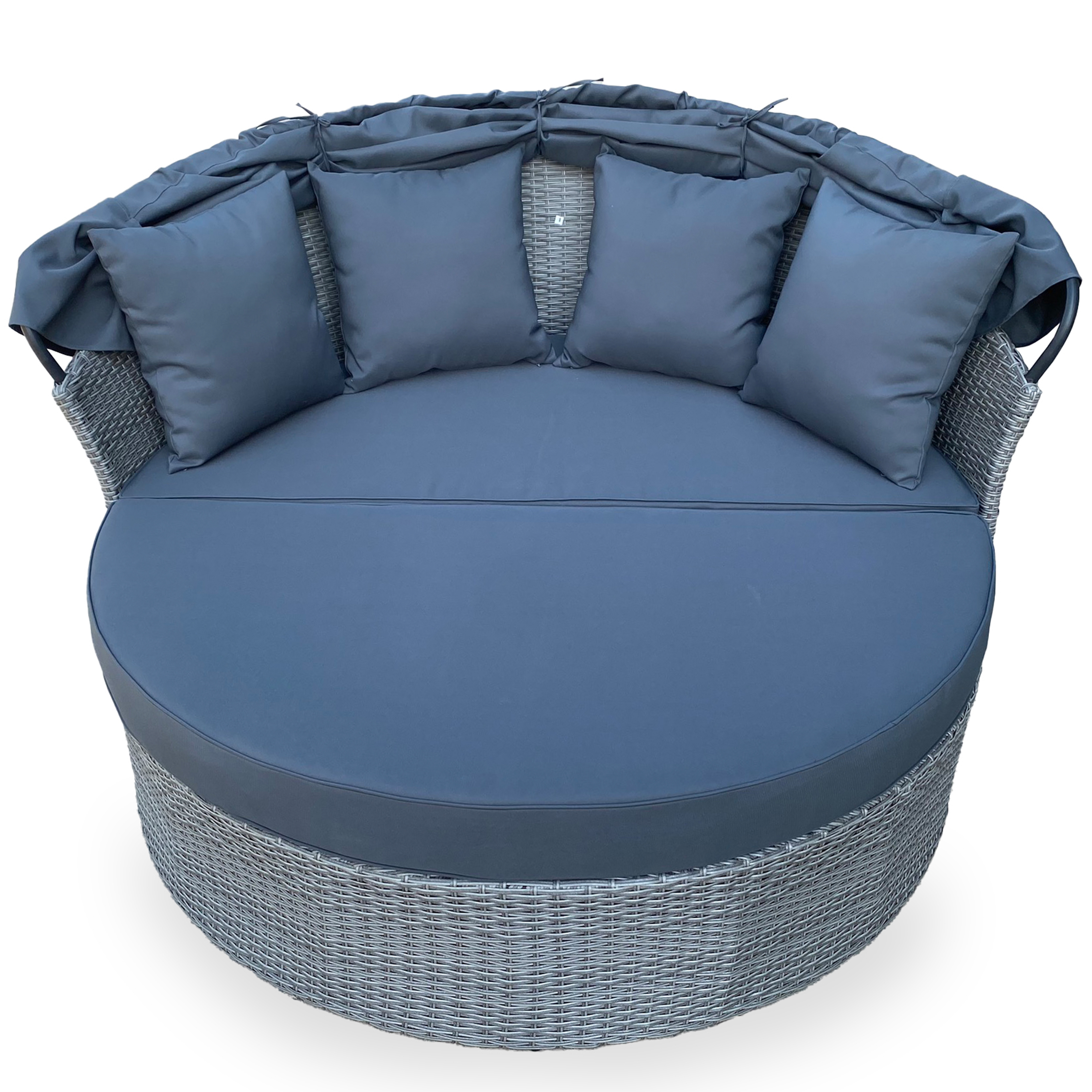 Der Korpus besteht aus hochwertigem, industriellem Rattan, das sich durch hohe Stabilität und Elastizität auszeichnet. Das Material ist wasserabweisend, witterungsbeständig und langlebig, wodurch sich die Sonneninsel ideal für den ganzjährigen Einsatz im Outdoor-Bereich eignet. Die zeitlose graue Farbgebung unterstreicht den modernen Look und lässt sich vielseitig kombinieren.