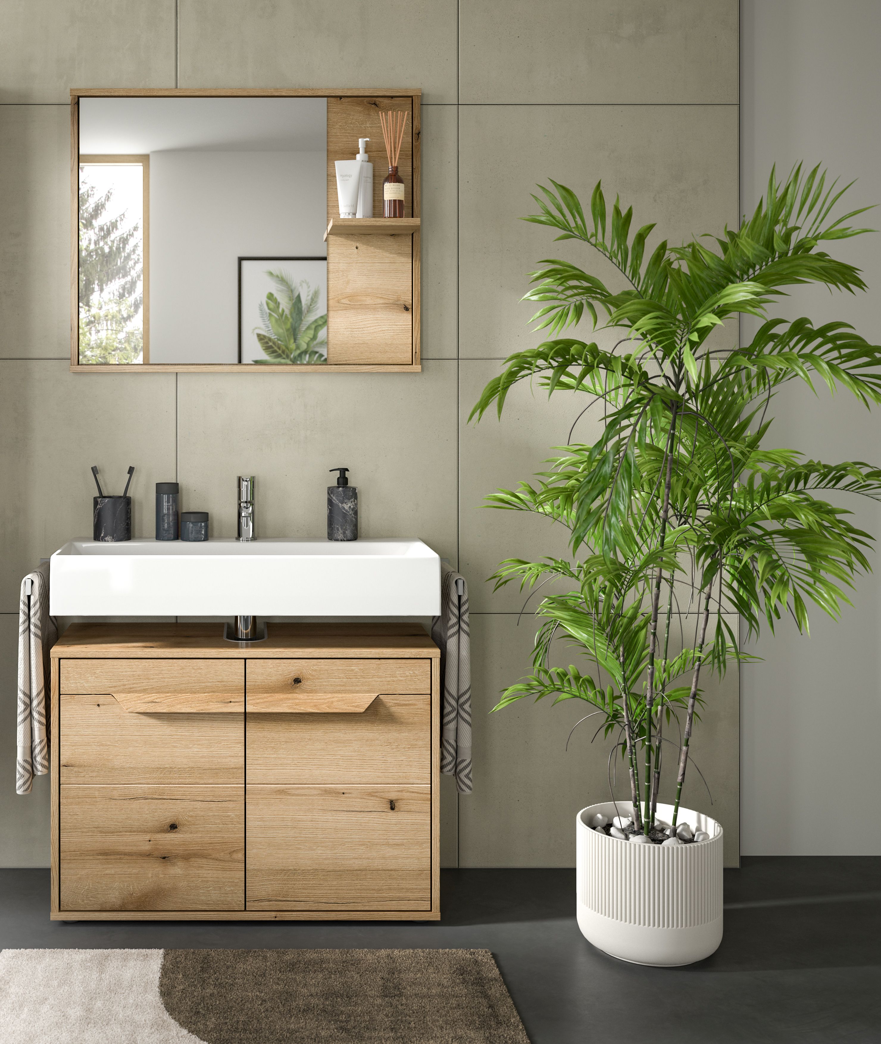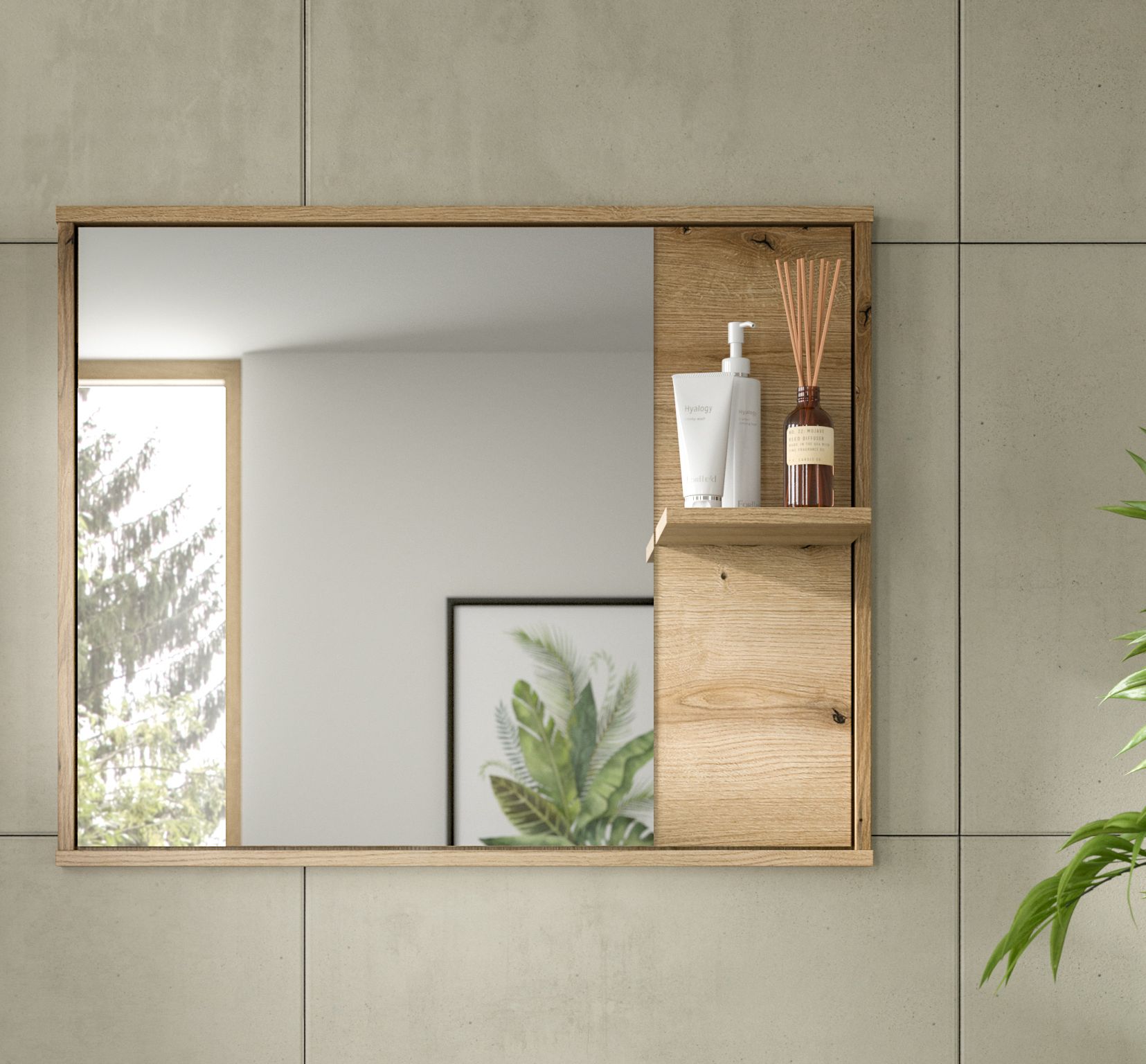 Verleihen Deinem Badezimmer mit unserem stilvollen Spiegel in Evoke Oak Nachbildung den perfekten letzten Schliff. Mit einer Größe von 84x68x20 cm bietet er nicht nur eine große Spiegelfläche, sondern auch eine ansprechende Ästhetik.