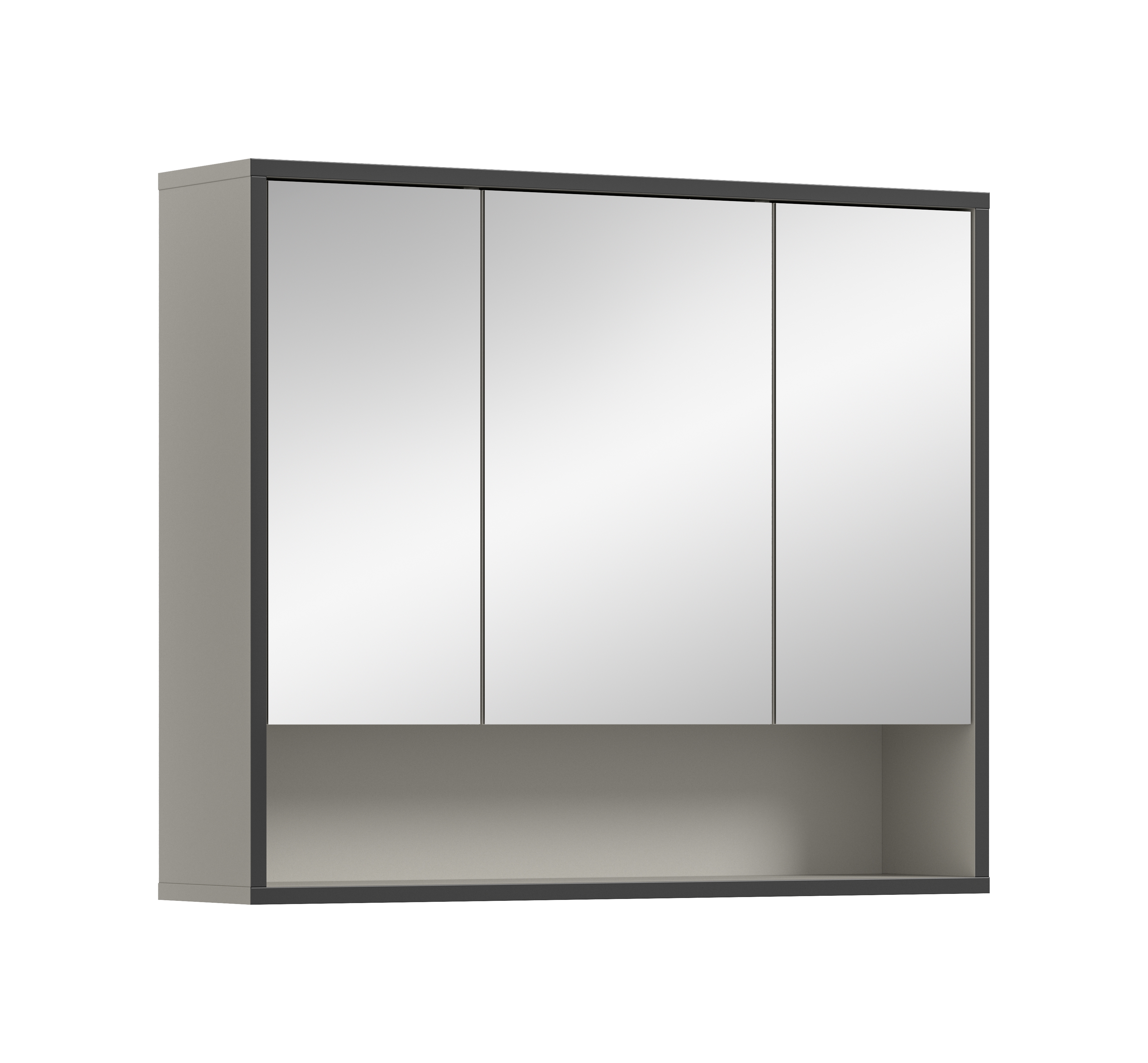 - 3 Spiegeltüren (mittlere Tür re/li montierbar), 3 herausnehm- & höhenverstellbare Einlegeböden, 6 geschlossene Fächer, 1 Konstruktionsboden, 1 offenes Fach