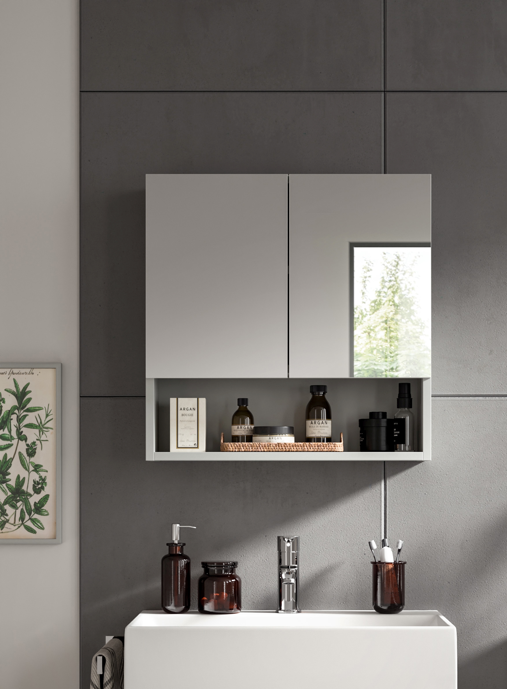 - Einsatzbereich: Ideal für Badezimmer als platzsparende und funktionale Lösung zur Aufbewahrung von Badutensilien und zur Bereitstellung einer praktischen Spiegelfläche.