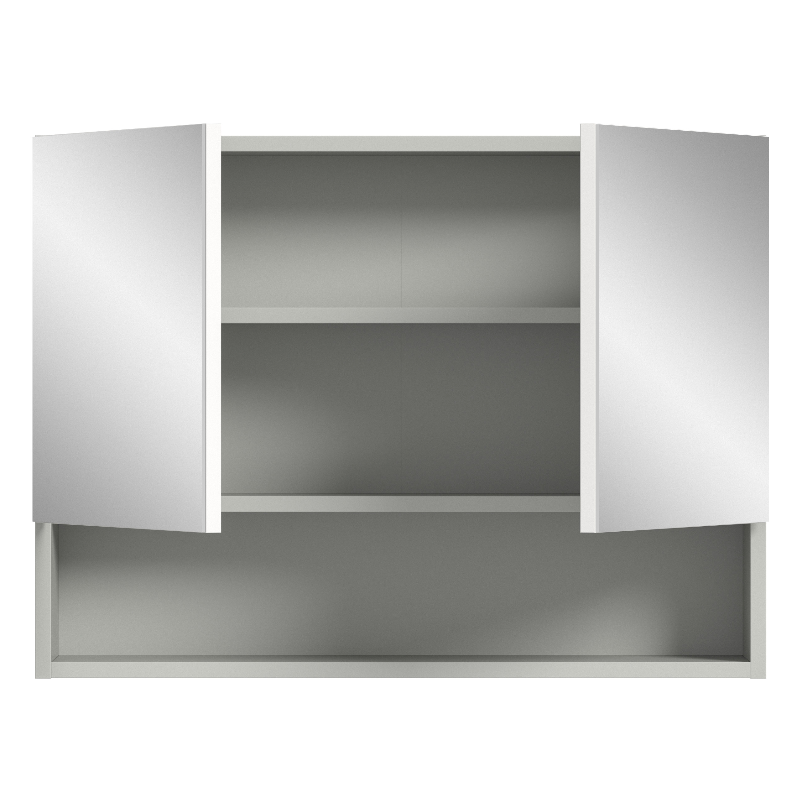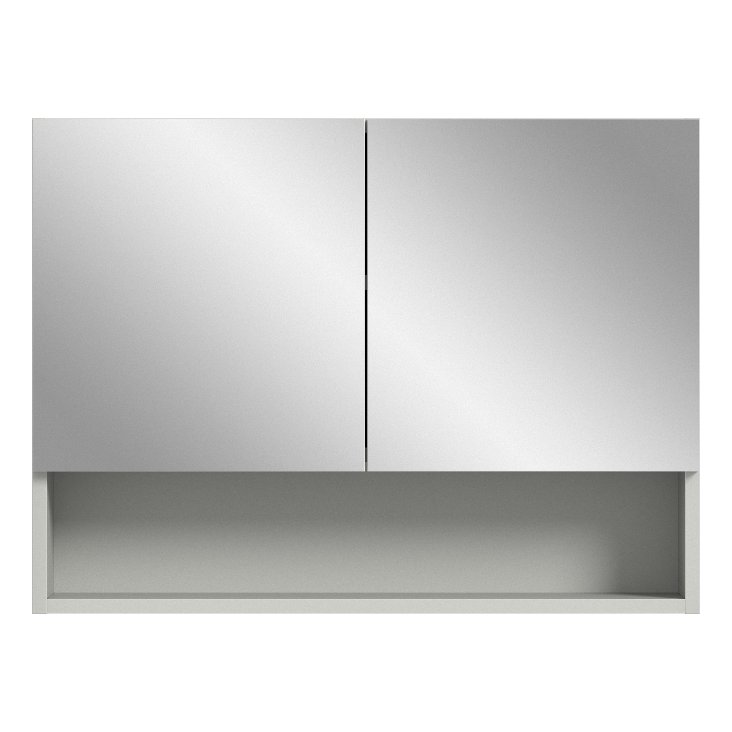 - Design/Stil: Moderner Spiegelschrank mit einer einheitlichen Hellgrau und einer eleganten Spiegelfront, die schlichte Eleganz und Funktionalität für das Badezimmer bietet.