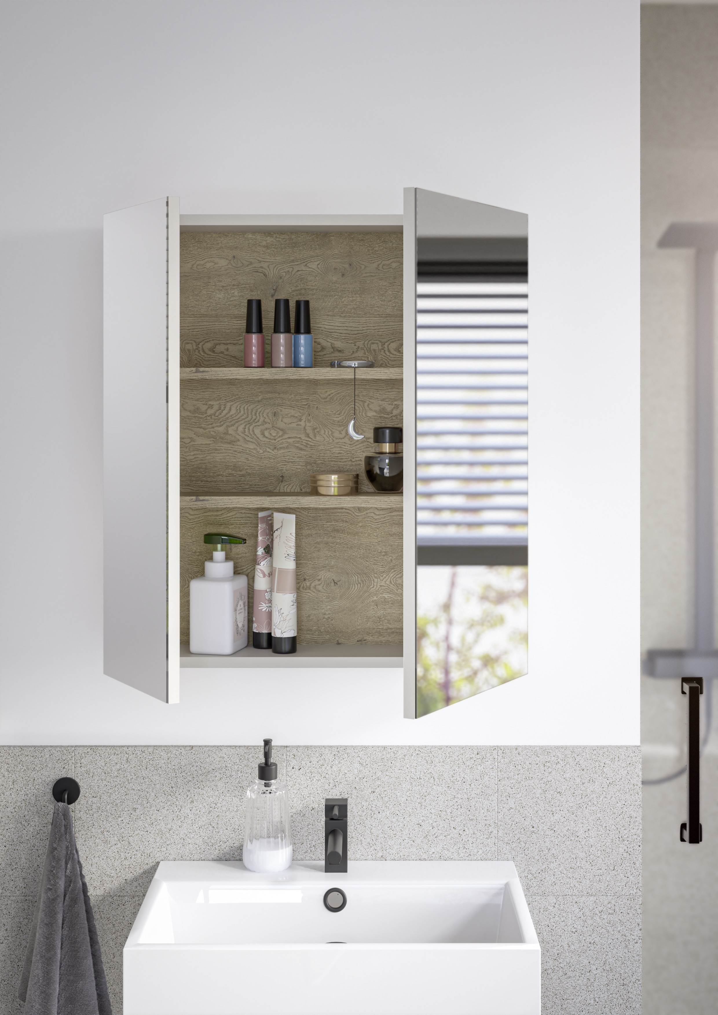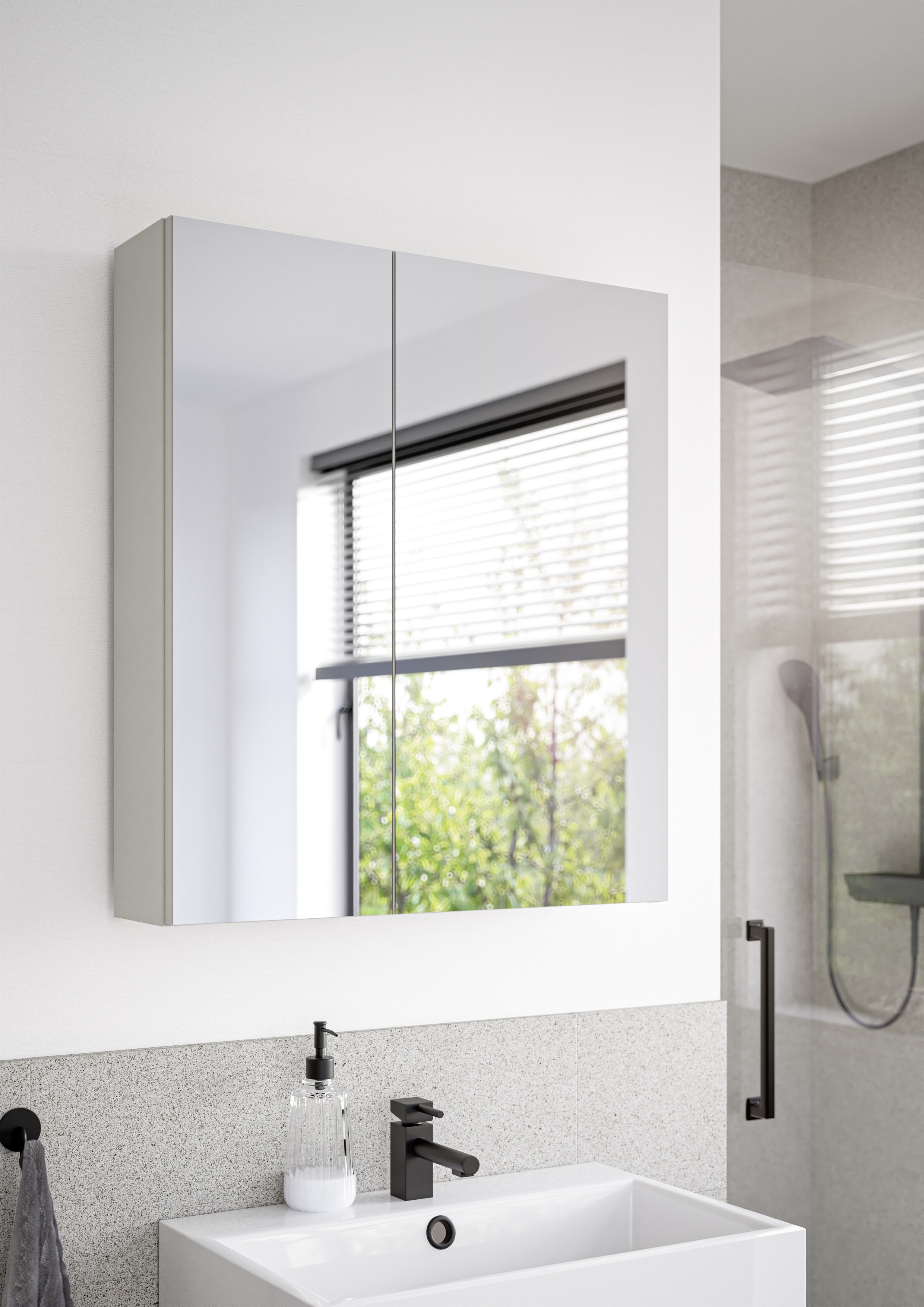 Dieser Spiegelschrank in Kaschmir bietet funktionalen Stauraum und klare Spiegelflächen in einem kompakten Format. Die beiden Spiegeltüren sorgen für eine gute Sicht beim täglichen Gebrauch und verbergen zugleich zwei Einlegeböden, die Platz für Pflegeprodukte oder Badutensilien bieten. Der melaminbeschichtete Korpus in Kaschmir ist pflegeleicht und feuchtigkeitsresistent – ideal für den Einsatz im Badezimmer. Der Spiegelschrank lässt sich wandhängend montieren und fügt sich durch seine neutrale Farbgebung harmonisch in verschiedenste Badgestaltungen ein. Eine praktische und preisbewusste Lösung – ganz ohne unnötigen Aufwand.
