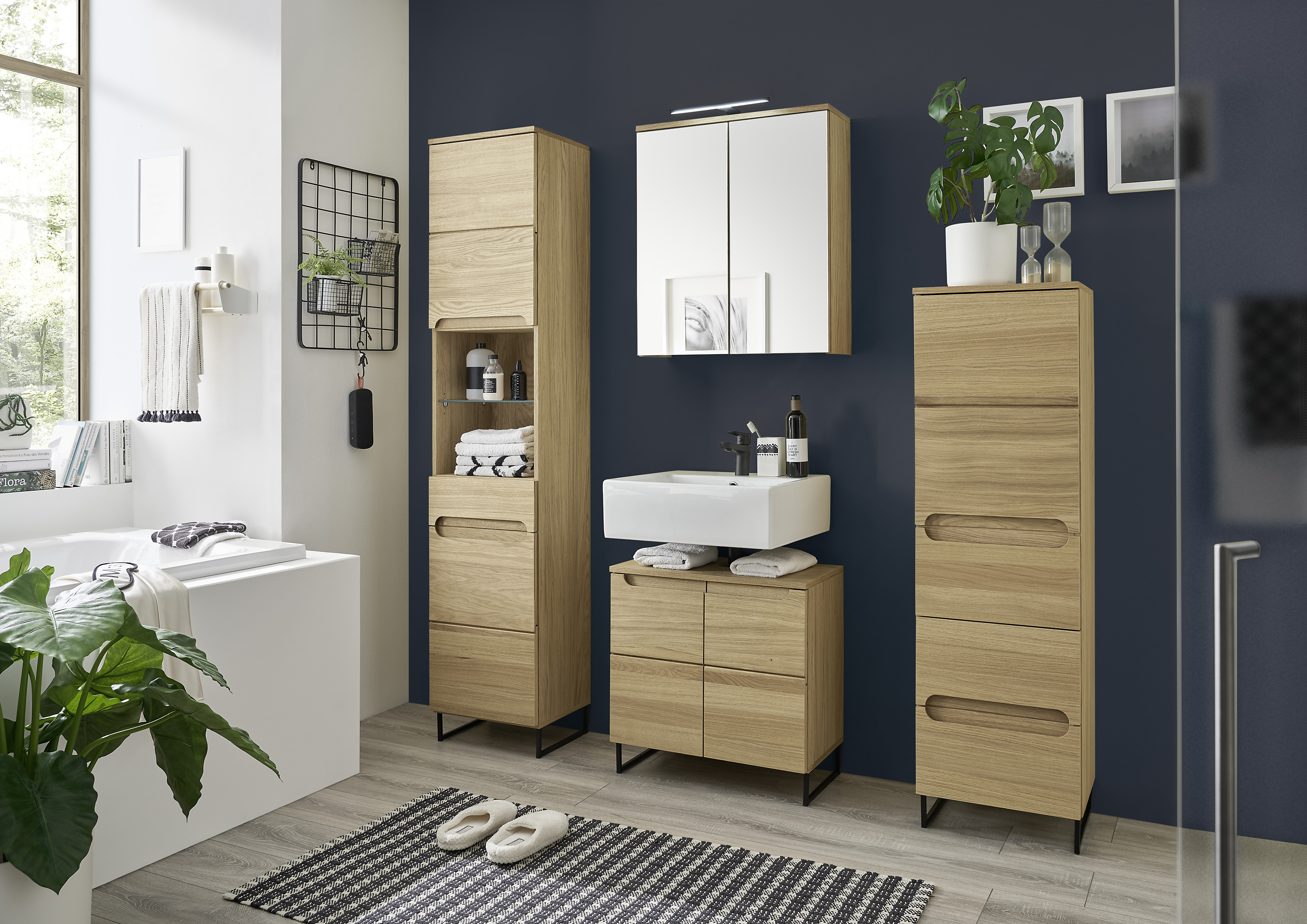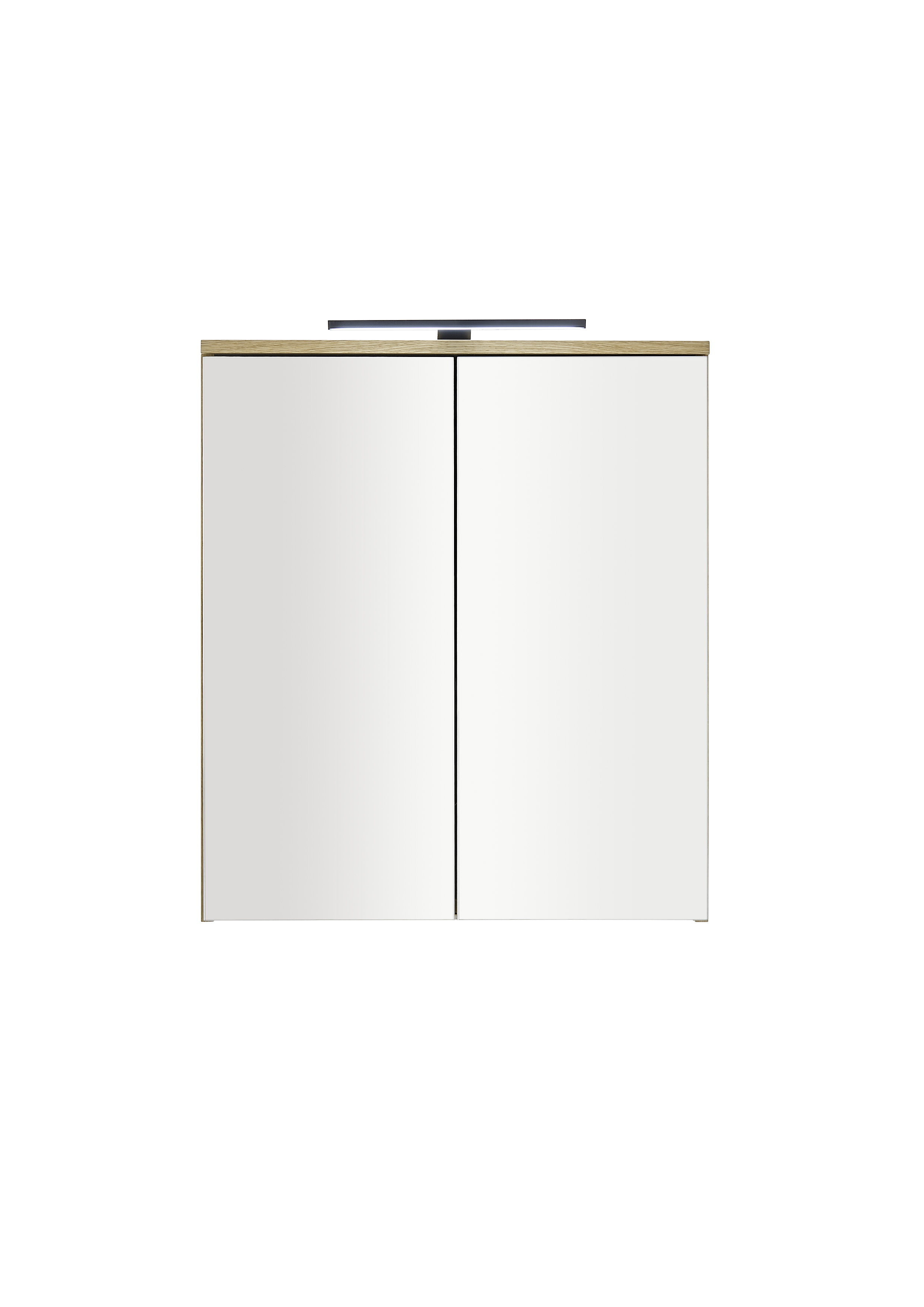 Die integrierte LED-Beleuchtung sorgt für eine gleichmäßige, angenehme Ausleuchtung und unterstützt optimale Lichtverhältnisse am Waschplatz. Der Spiegelschrank bietet stilvollen Stauraum und fügt sich harmonisch in moderne Badkonzepte ein.