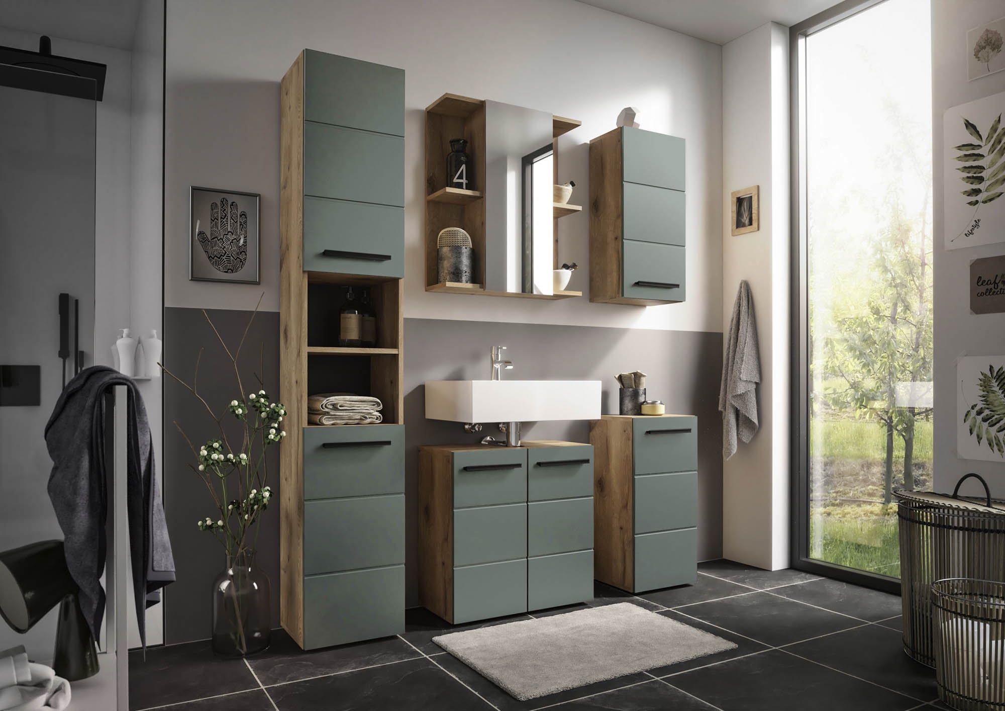 | Ausstattung Schränke: | Spiegel, offene Fächer | ||