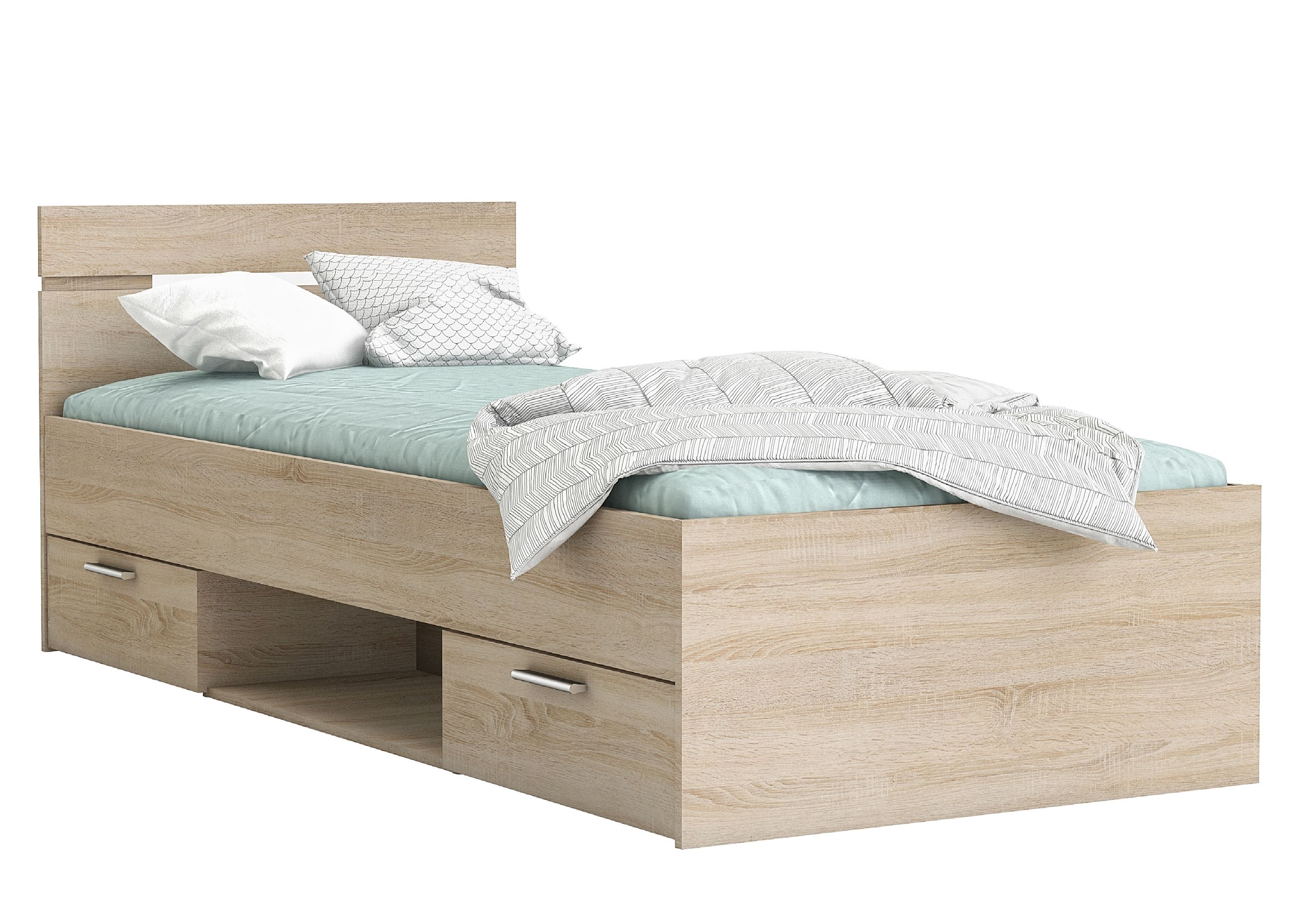 Schubkästen und Fach sind auf einer Seite des Bettes montiert, so dass das Bett an der Wand positionierbar ist.