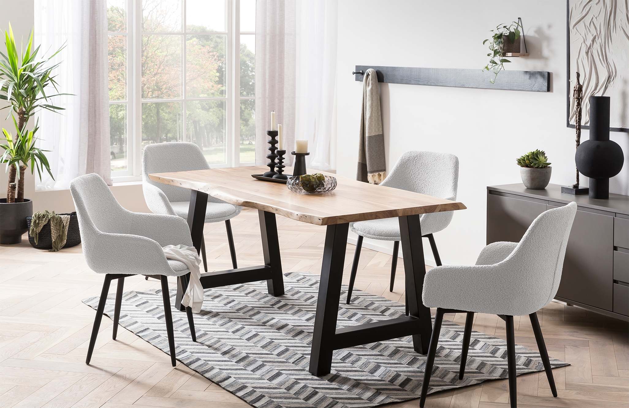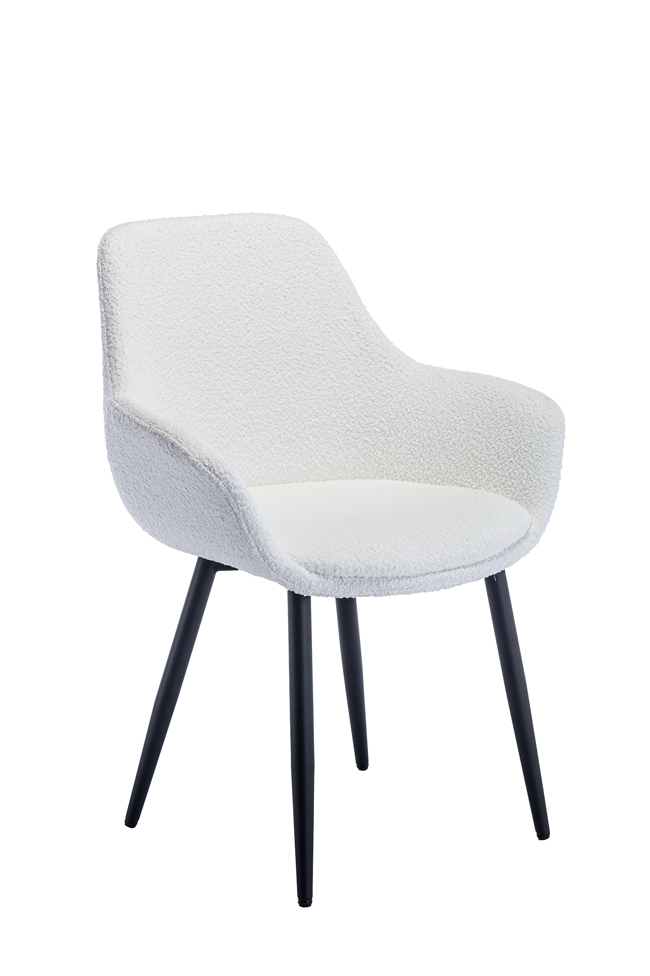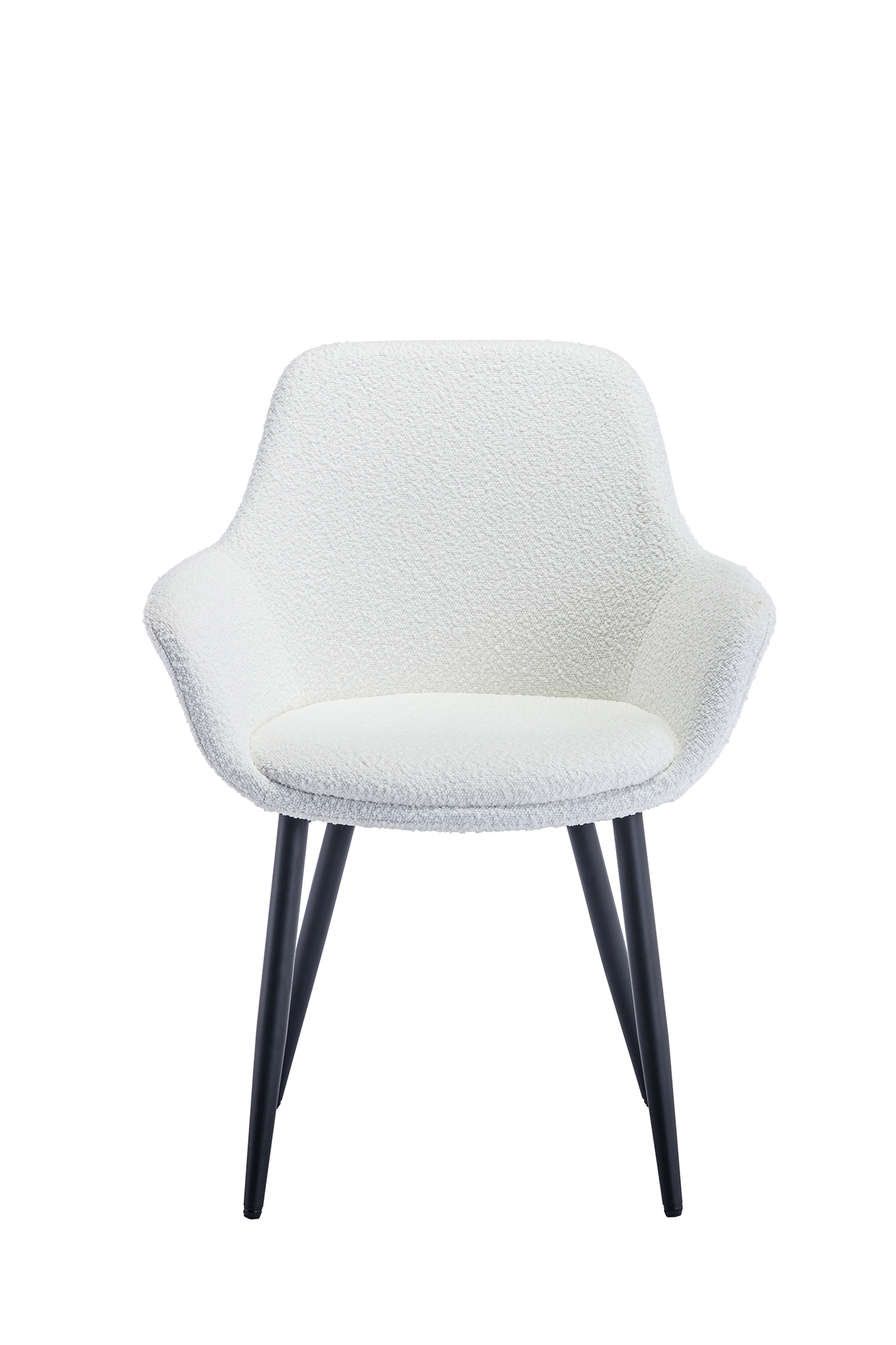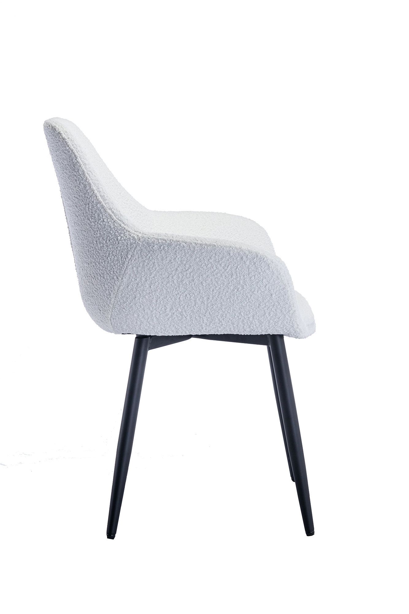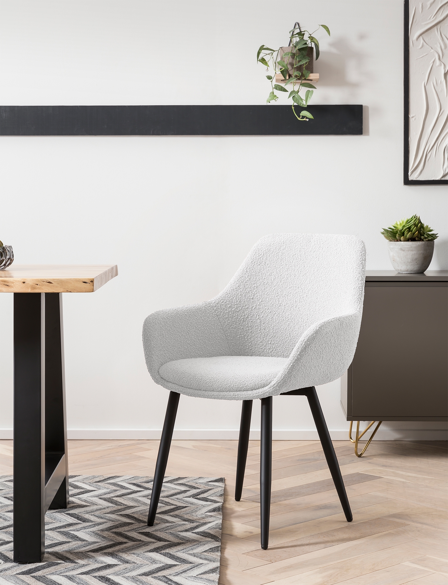 Der moderne Armlehnstuhl im 2er Set überzeugt mit seinem Texturstoff in Bouclé-Optik. Das robuste 4 Fuß Gestell aus pulverbeschichtetem Metall in matt schwarz gewährleistet einen sicheren Stand und bietet einen großartigen Kontrast zum Bezug des Stuhles. Durch die abgerundete Rückenfläche und die angenehme Polsterung entsteht ein Sitzkomfort der Extraklasse. Ein optisches Highlight sind die ausgestellten Armlehnen. Durch das stylische Design können die Stühle im Essbereich, als Sitzgelegenheit im Wartebereich oder in einem Konferenzraum eingesetzt werden. Aber auch als Einzelstuhl wird dieses Möbel zum echten Hingucker. Sie und Ihre Gäste werden Ihre neue Sitzgelegenheit lieben.