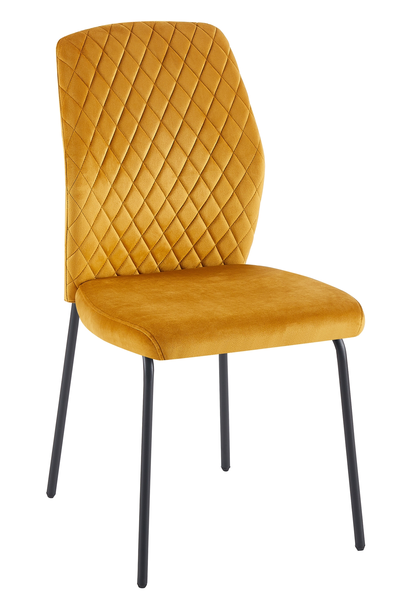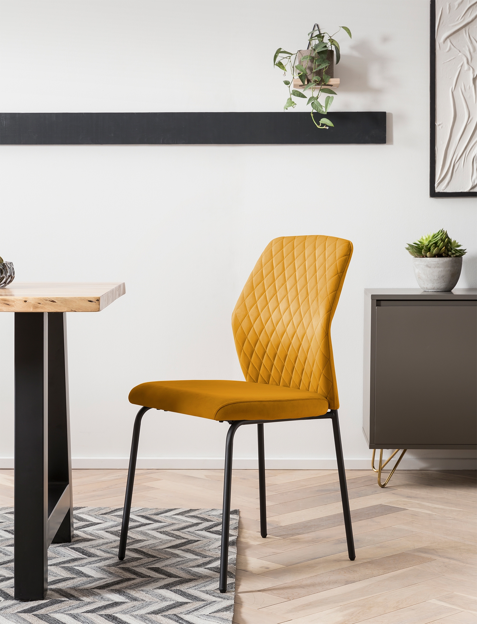 Dieser Esszimmerstuhl im reduzierten Design macht garantiert überall eine gute Figur. Die Rückenlehne mit aufwändiger Rautensteppung gibt dem Stuhl das gewisse Etwas und macht optisch richtig etwas her. Die leicht angeknickte Rückenlehne macht nicht nur den Look des Stuhls interessanter, sie sorgt auch für angenehmen Sitzkomfort. Bezogen ist der Stuhl mit standfestem, klassischen 4-Fuß Gestell mit einem Bezug in glamouröser Samt-Optik. Der Verkauf im 2er Set macht ein spannendes Mix & Match von verschiedenen Farben am Esstisch zum Kinderspiel. Mit diesem Stuhl machen Sie garantiert nichts falsch – Egal ob am Esstisch oder als Sitzgelegenheit am Schreib- oder Schminktisch.