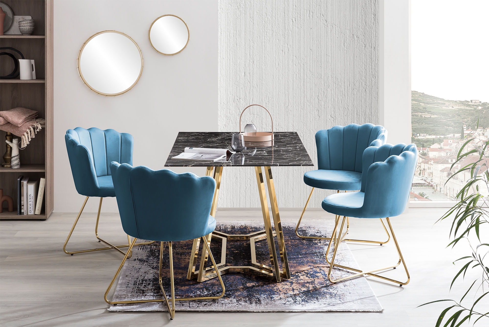Entfliehen Sie dem Alltag und genießen Sie eine kleine Auszeit. Das moderne Stuhl-Set im Muschel-Design besticht durch seinen Bezug aus Samt und überzeugt mit seinem abgerundeten Sitz- und Rückenbereich. Das überkreuzte Design-Gestell aus vergoldetem Metall gewährleistet nicht nur einen sicheren Stand, sondern bietet auch einen großartigen Kontrast zum Bezug des Stuhls. Durch die Polsterung an Sitz- und Rückenfläche und die stylische Form erleben Sie erstklassigen Sitzkomfort. Die abgerundete Form sorgt für einen weichen Look. Der Stuhl kann im Speisezimmer als Esszimmerstuhl oder zum Beispiel als Sitzgelegenheit am Schminktisch dienen. Egal wo er platziert wird, dieser Muschelstuhl ist ein echter Blickfang.