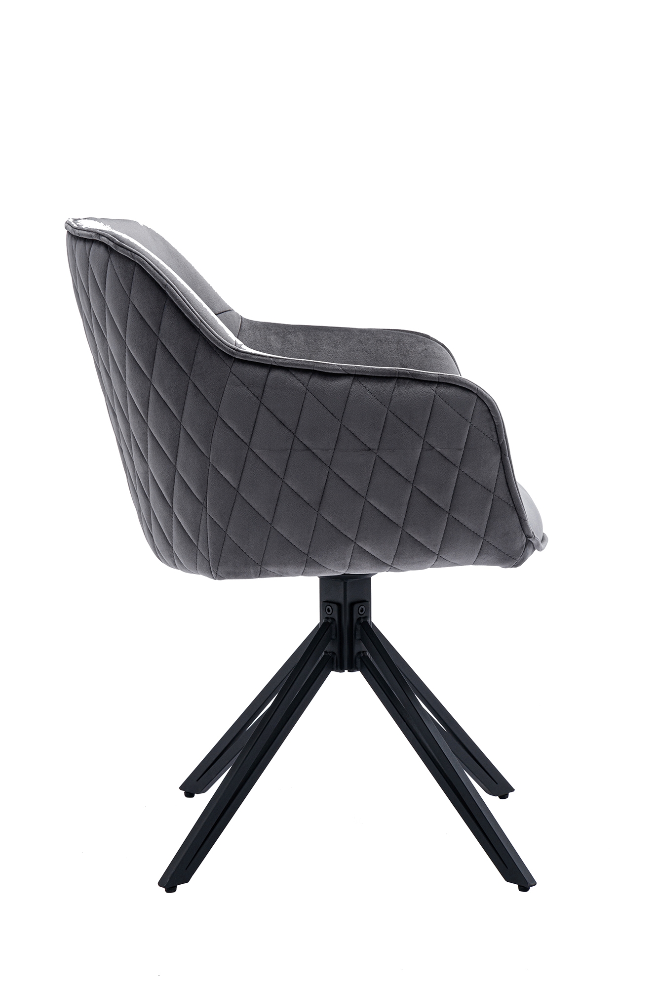 Der stylische Armlehnstuhl mit 360°-Drehfunktion bereichert mit besonders flexiblem Sitzkomfort Ihr Zuhause. Die Sitzschale lässt sich um 360° drehen und kehrt immer wieder in ihre Ursprungsposition zurück. Der besondere Retro-Look des bequemen Stuhls macht das Sitzmöbel zum absoluten Hingucker. Das außergewöhnliche Design-Gestell aus schwarzem Metall und die hochwertig Wabensteppung im Rücken sind dabei nur zwei der hochwertigen Details des Polsters. Die schwarzen Metallbeine bilden einen interessanten Kontrast zu dem edlen Samt-Bezug der Sitzschale und sorgen für einen sicheren Stand. Ein Rundum besonderer Stuhl für Ihr Zuhause!