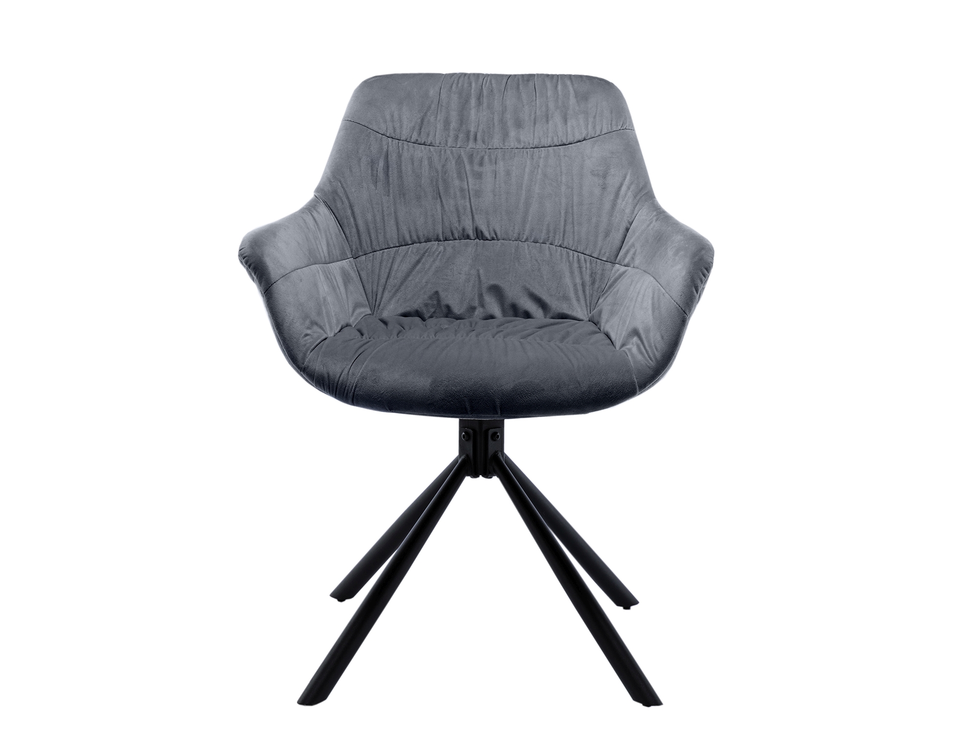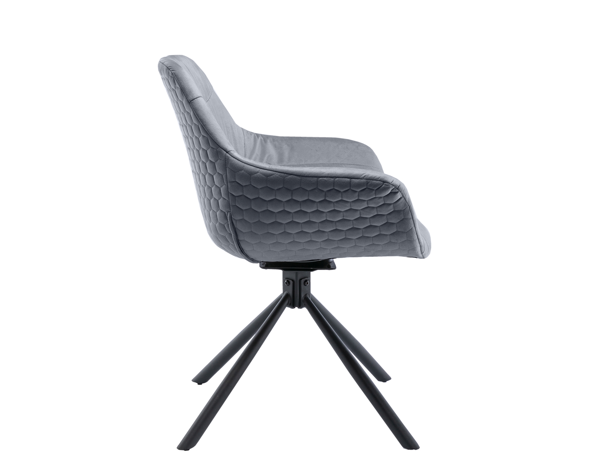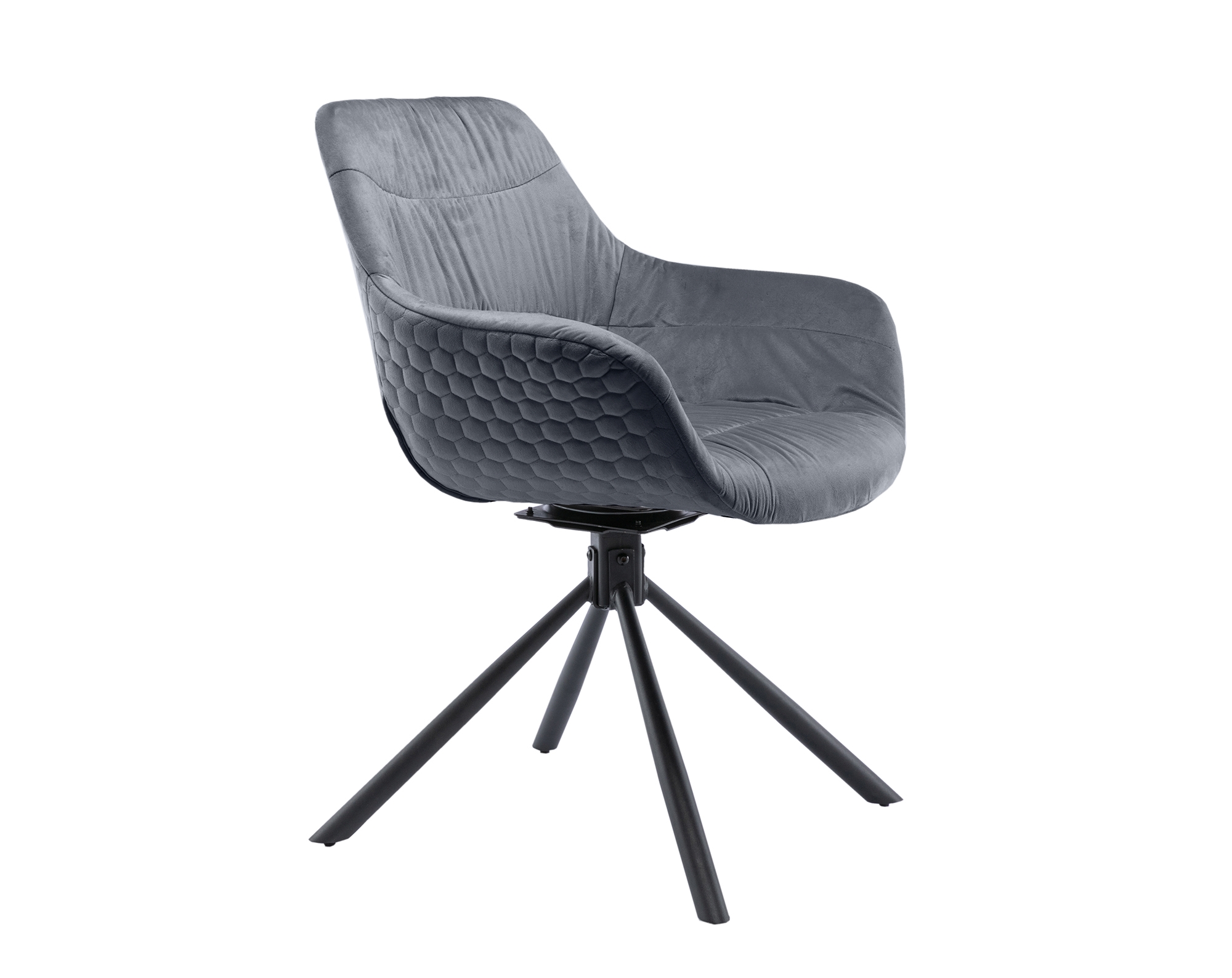 Der trendige Armlehnstuhl besticht durch seinen Stoffbezug in Samt-Optik und seinem Baseball-Gestell mit 360° Drehfunktion aus schwarz pulverbeschichtetem Metall. Die Metallbeine gewährleisten nicht nur einen sicheren Stand, sondern harmonisieren auch perfekt mit dem Bezug des Stuhles. Durch die bequeme Sitzschale mit Armlehnen erhalten Sie einen angenehmen Sitzkomfort der Extraklasse. Die Quersteppung an dem inneren Sitz- und Rückenbereich, sowie die Wabensteppung, die den äußeren Bereich schmückt, sind ein absoluter Blickfang in Ihrem Wohnraum. Durch seine extravagante Formgebung kann dieser Polsterstuhl auch als Konferenzstuhl genutzt werden. Egal wo er zum Einsatz kommt, Sie und Ihre Gäste werden diesen Sitzkomfort lieben.