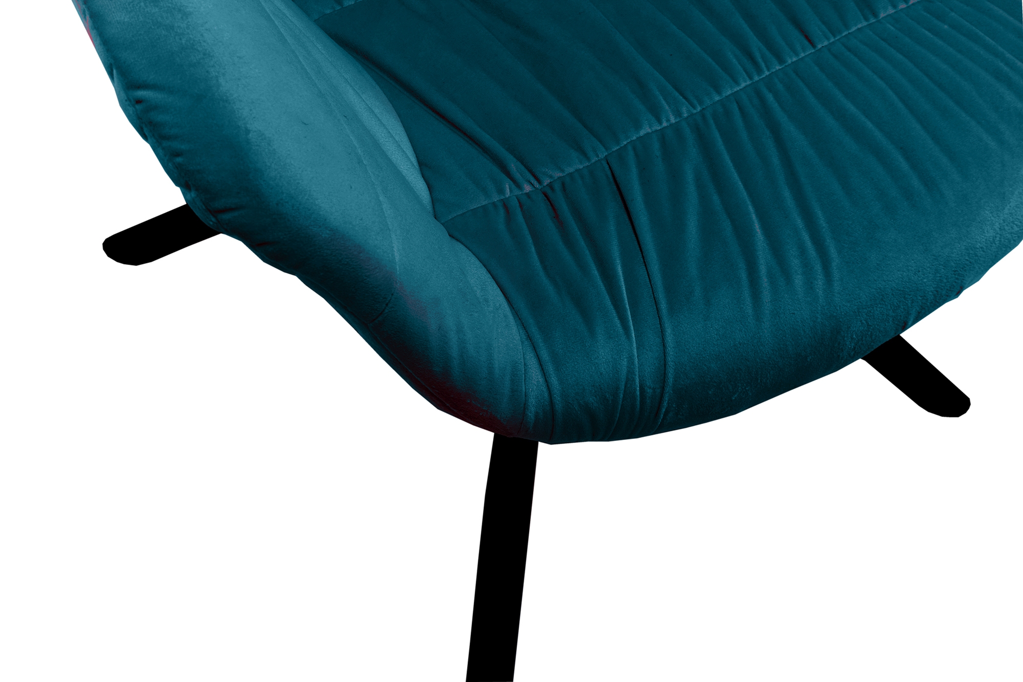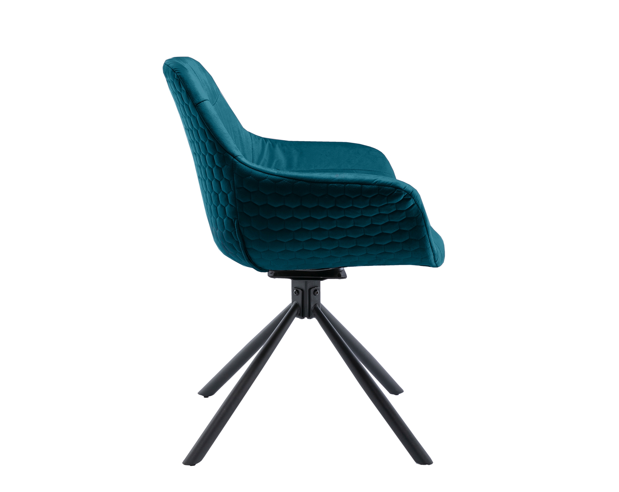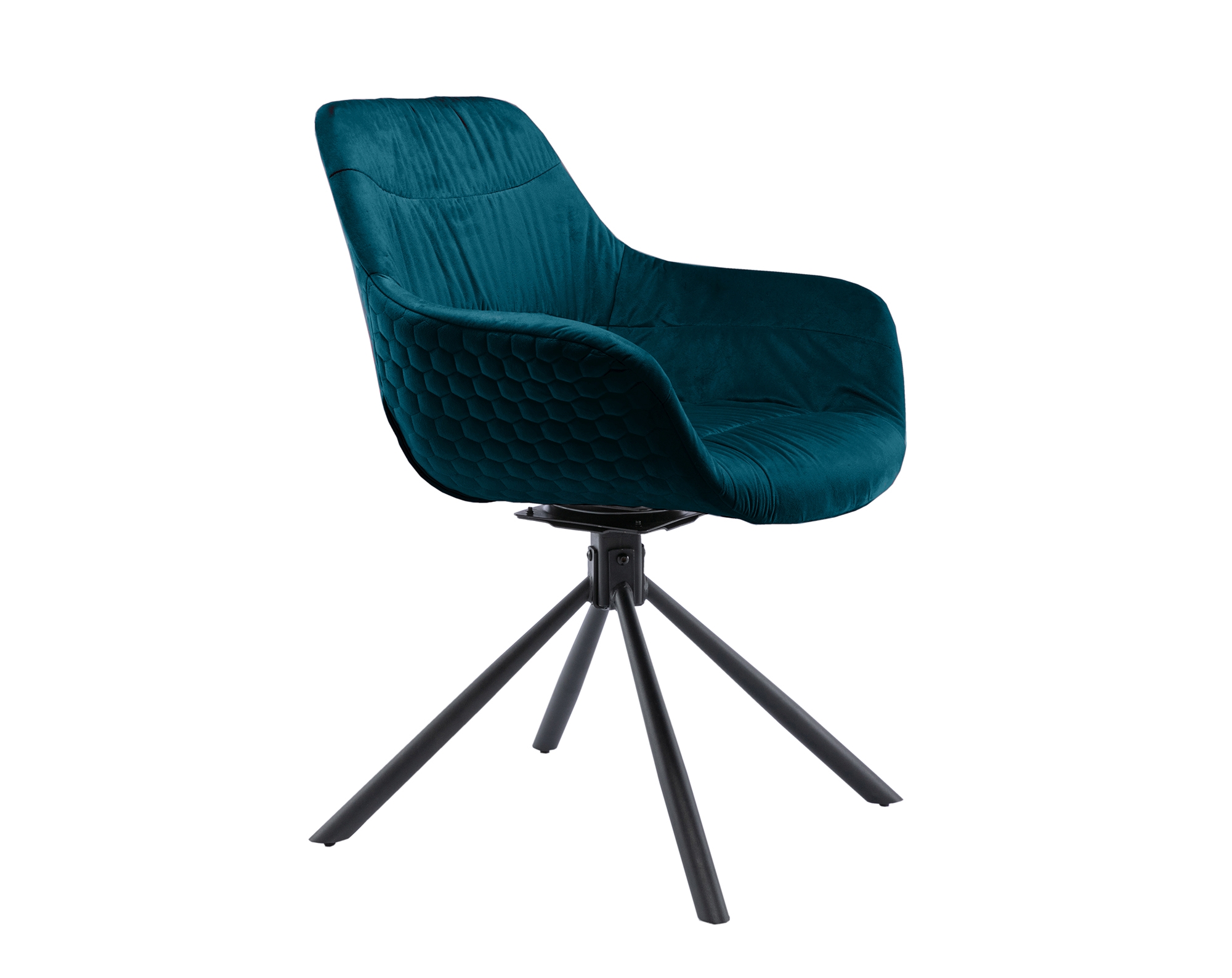 Der trendige Armlehnstuhl besticht durch seinen Stoffbezug in Samt-Optik und seinem Baseball-Gestell mit 360° Drehfunktion aus schwarz pulverbeschichtetem Metall. Die Metallbeine gewährleisten nicht nur einen sicheren Stand, sondern harmonisieren auch perfekt mit dem Bezug des Stuhles. Durch die bequeme Sitzschale mit Armlehnen erhalten Sie einen angenehmen Sitzkomfort der Extraklasse. Die Quersteppung an dem inneren Sitz- und Rückenbereich, sowie die Wabensteppung, die den äußeren Bereich schmückt, sind ein absoluter Blickfang in Ihrem Wohnraum. Durch seine extravagante Formgebung kann dieser Polsterstuhl auch als Konferenzstuhl genutzt werden. Egal wo er zum Einsatz kommt, Sie und Ihre Gäste werden diesen Sitzkomfort lieben.