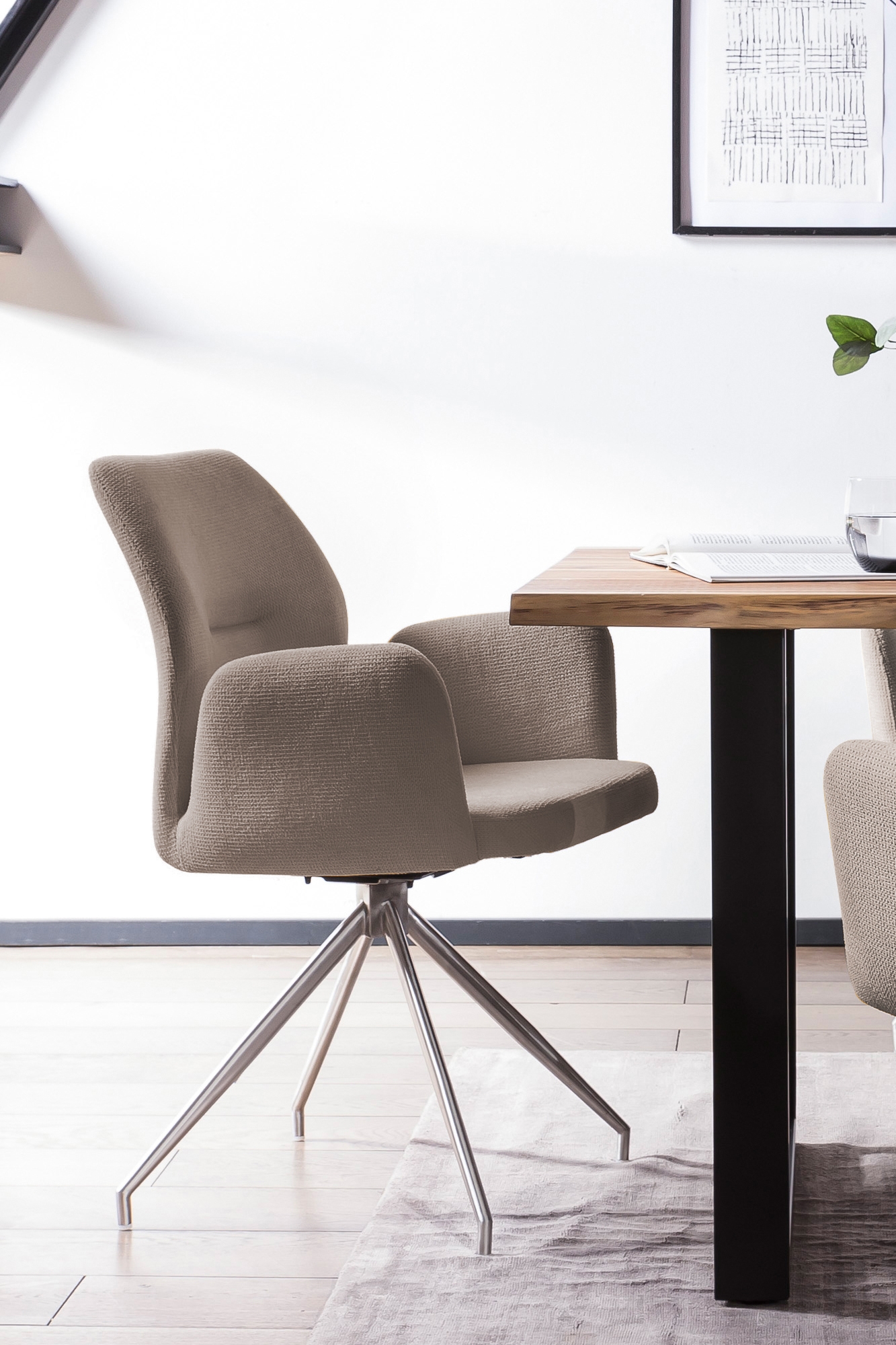 Besticht durch seine moderne Optik und die hohe Verarbeitungsqualität: Im modernen Design fügt sich der Armlehnstuhl mit 180° Drehfunktion in Ihr Zuhause ein. Dabei kann dieser vielseitig als Esszimmerstuhl, für den Schminktisch oder das Homeoffice eingesetzt werden. Der Polsterstuhl besticht durch seine trendige Formensprache mit ergonomisch geformter Rückenlehne mit Ziernaht, gerader Sitzfläche und leicht ausgestellten Armlehnen. Alle Bereiche weisen eine angenehme Polsterung für einen hohen Sitzkomfort auf. Bezogen ist das Sitzmöbel mit einem edlen Strukturstoff, der über strapazierfähige Eigenschaften verfügt und in vielen attraktiven Unifarben zur Auswahl steht. Ein weiteres Highlight stellt das filigran wirkende Design-Gestell aus rostfreiem Edelstahl dar. Durch den integrierten Drehmechanismus ermöglicht der Sessel ein dynamisches Sitzen.