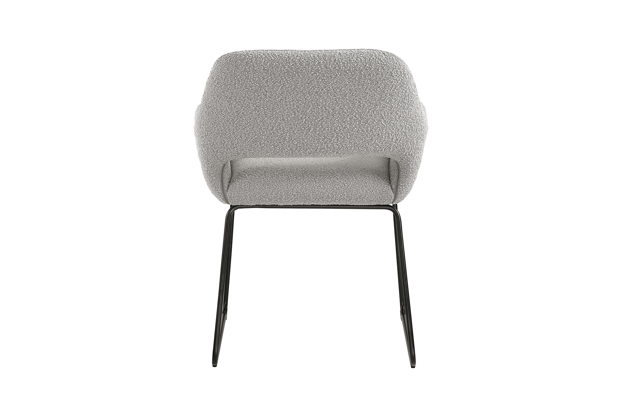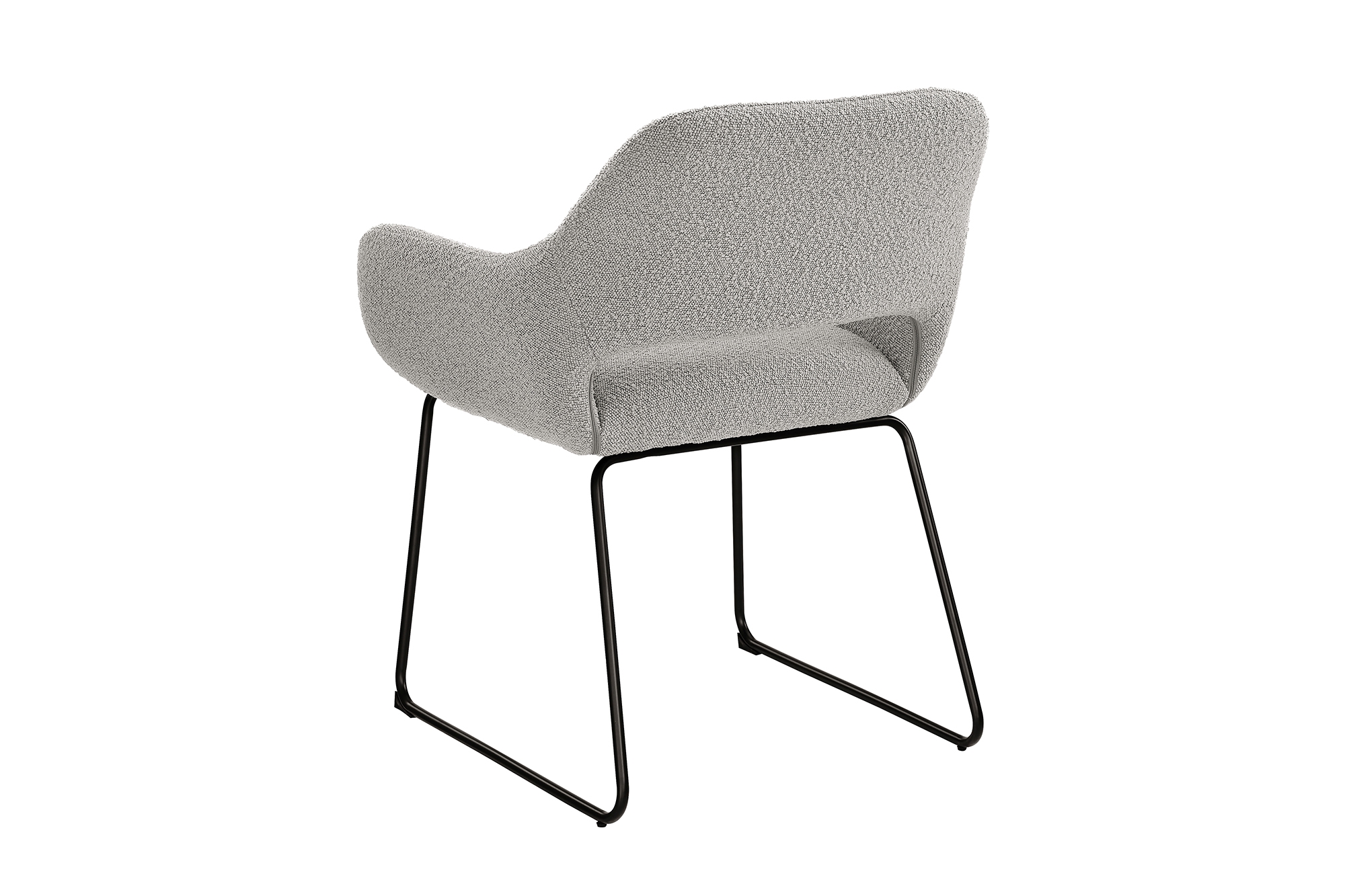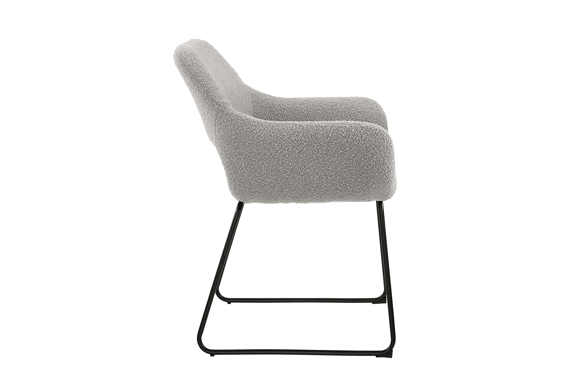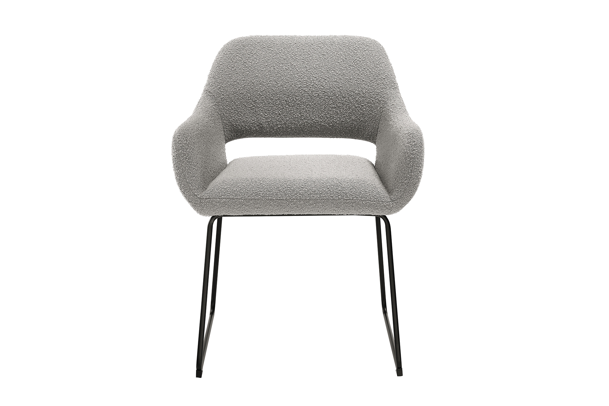 Mit diesem Armlehnstuhl mit extravagantem Rücken Cout-Out holen Sie sich einen modernen Design-Kompagnon mit Gemütlichkeitsfaktor in die eigenen vier Wände. Der Bezug aus grob strukturiertem Bouclé Stoff trifft genau den Puls der Zeit und ist dabei nicht nur komfortabel, sondern punktet auch durch seine Robustheit. Die hohen gepolsterten Armlehnen runden den Sitzkomfort des Stuhles dabei gekonnt ab. Das schwarze Kufengestell aus mattschwarz pulverbeschichtetem Metall unterstreicht den modernen Look zusätzlich. Ob als Esszimmerstuhl oder als Sitzgelegenheit am Schminktisch oder in der Leseecke – Dieser Armlehnstuhl mit Bouclé Stoff macht garantiert vielerorts eine gute Figur.