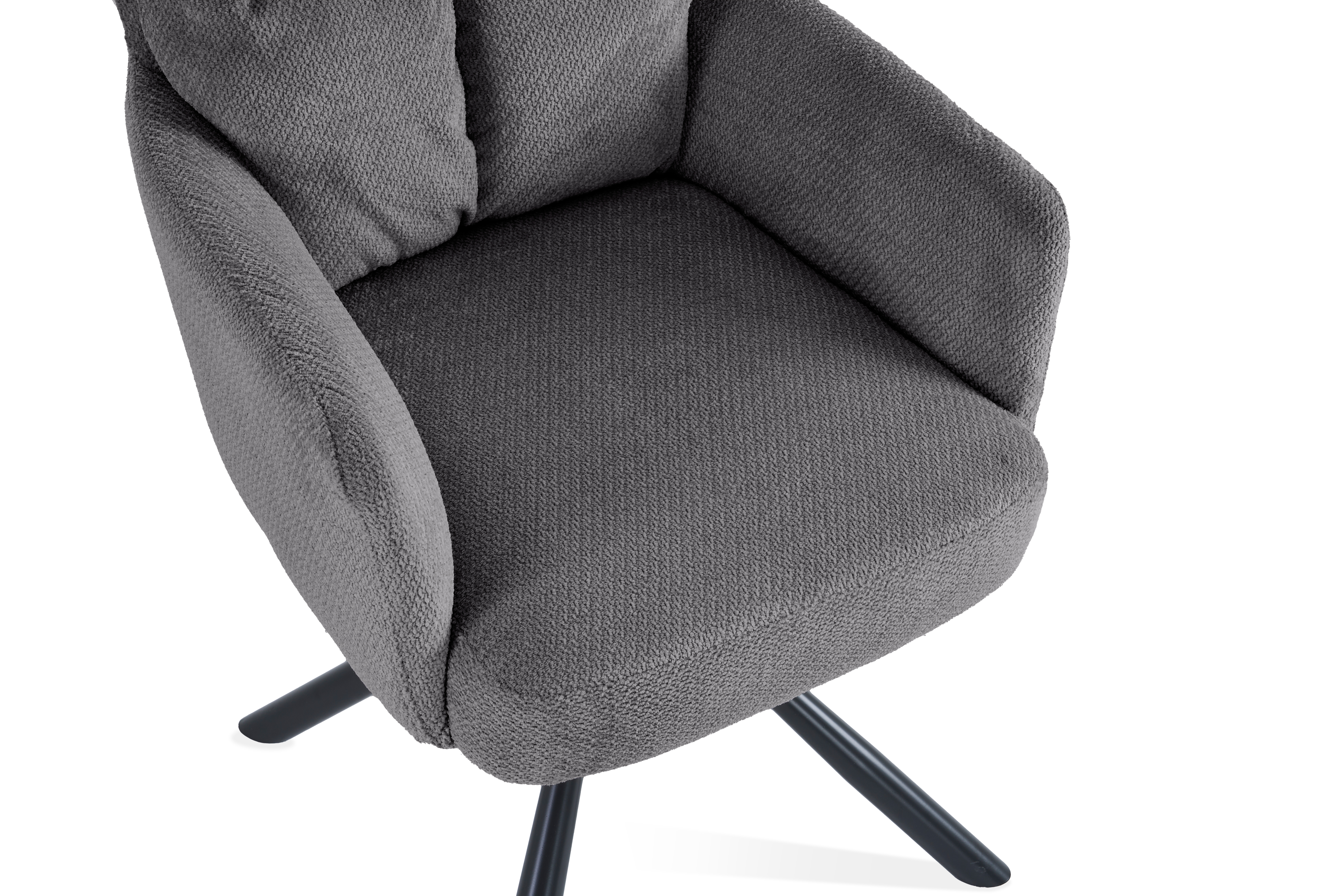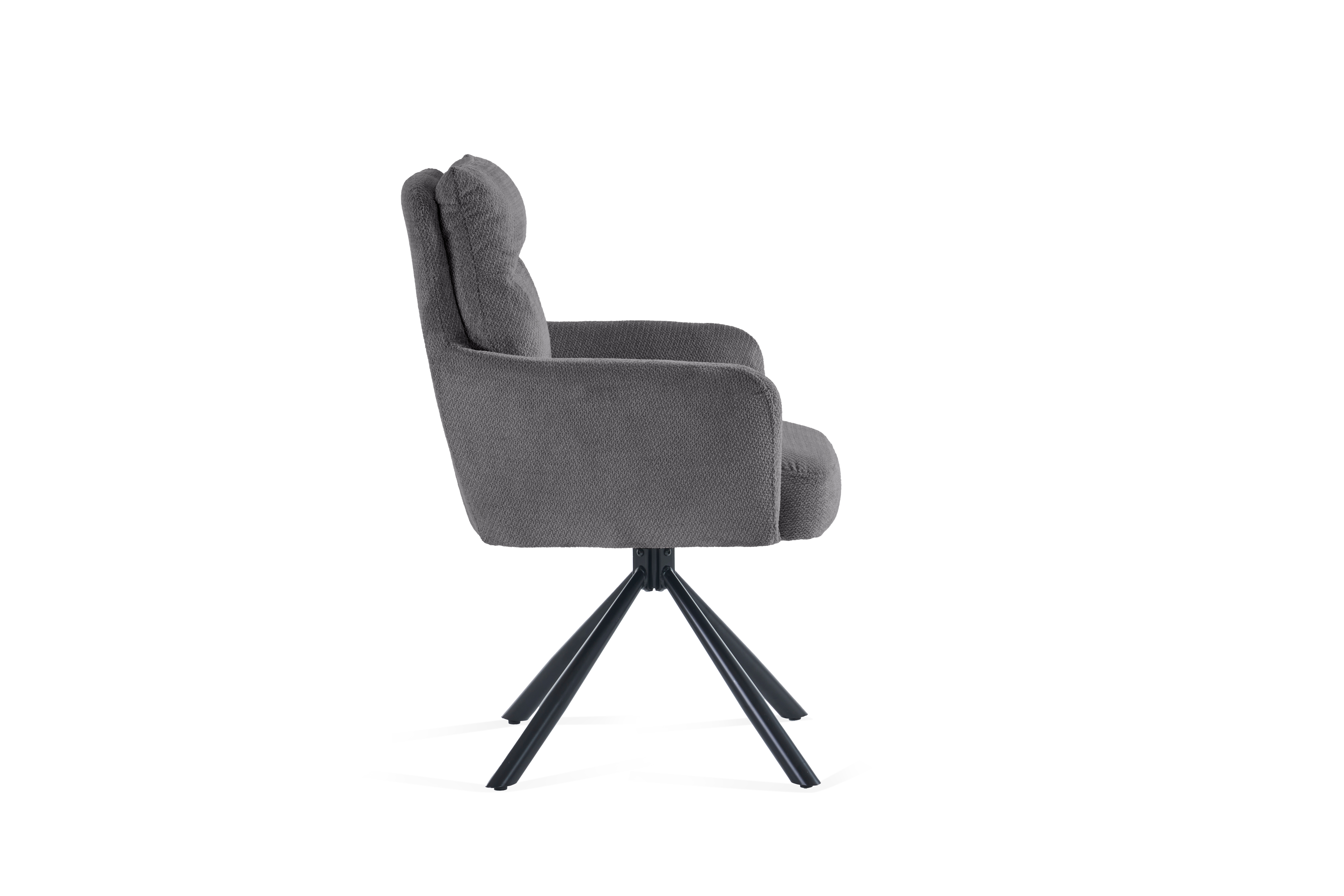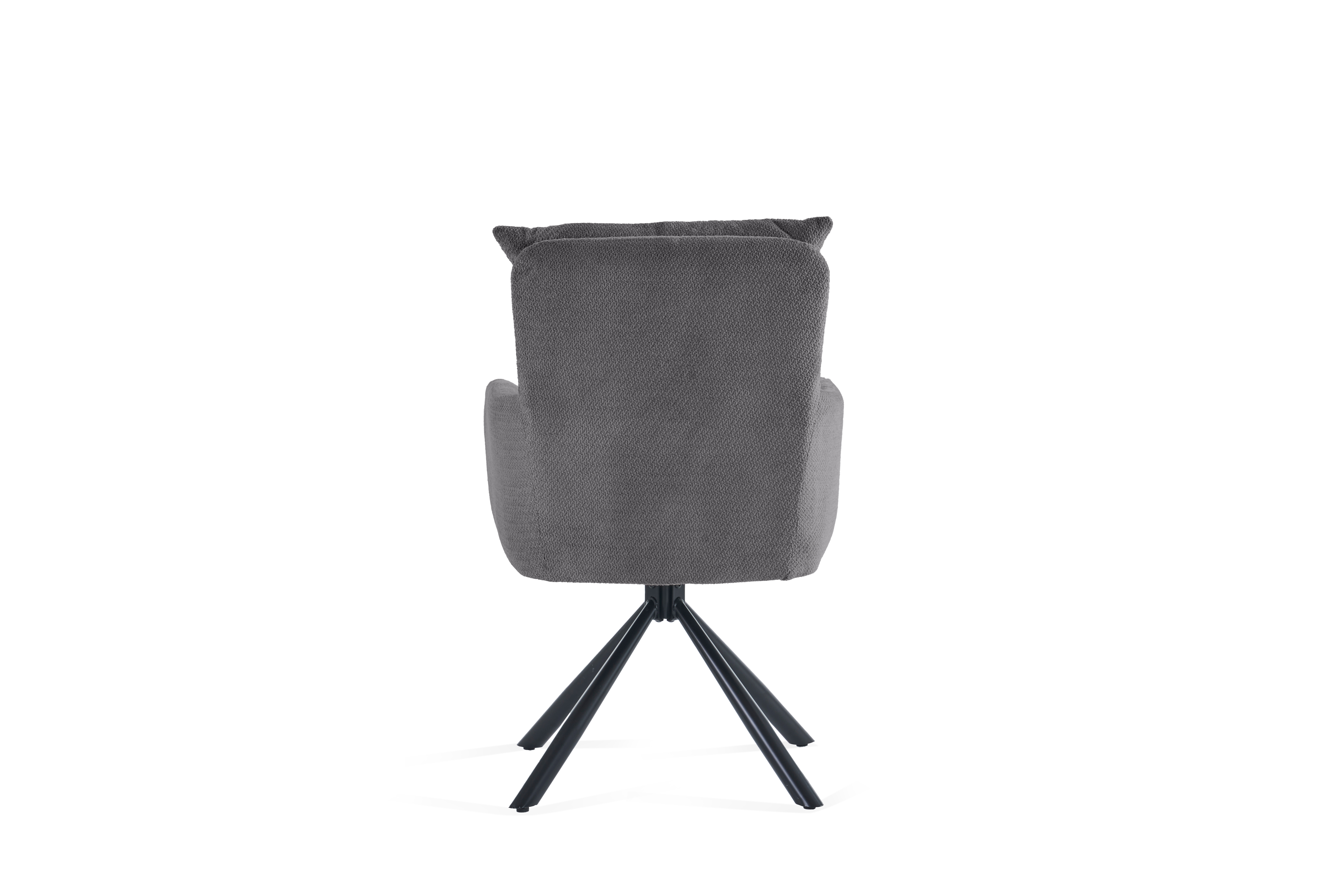 Ein besonderes Highlight ist die 180-Grad-Drehfunktion mit Rückholmechanik, die für zusätzliche Bewegungsfreiheit sorgt und den Stuhl nach dem Aufstehen automatisch in seine Ausgangsposition zurückführt. Das stabile Metallgestell gewährleistet einen sicheren Stand und unterstreicht den modernen Charakter des Stuhls.