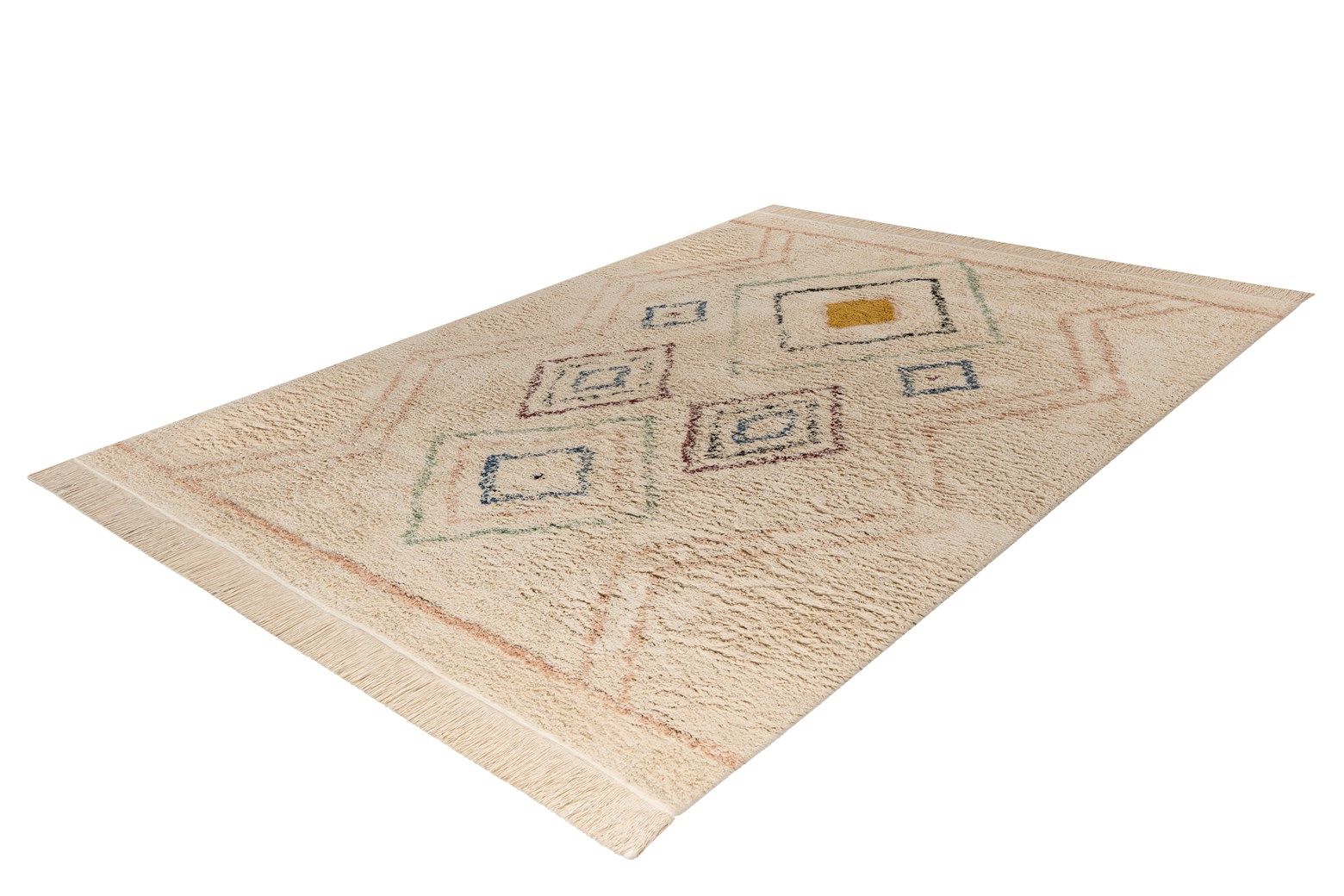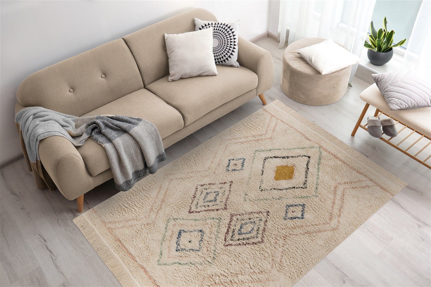 Dieser Flachflorteppich ist ein Highlight in Ihrem Raum. Das Design ist schlicht, nicht zu aufdringlich und zeitlos. Die leichten hellen Farben verleihen Ihrem Zuhause einen sauberen Look und sorgen gleichzeitig für ein warmes Gefühl. Der stilvolle Teppich lässt sich von Ihnen hervorragend mit Kissen oder Decken kombinieren. Dabei ist der Teppich pflegeleicht und strapazierfähig. Er ist das ideale Accessoire für Familien mit Kindern oder Haustieren. Der Teppich kann auch in Räumen mit Fußbodenheizung platziert werden. Durch die gute Verarbeitung und dadurch, dass er aus 100 % Baumwolle besteht, können eventuelle Flecken mühelos entfernt werden. Durch einen unterschiedlich einfallenden Lichteinfall kann der Teppich in seiner tatsächlichen Farbgebung abweichen. Die Streichrichtung des weichen Flors variiert und kann die Farbgebung ändern.